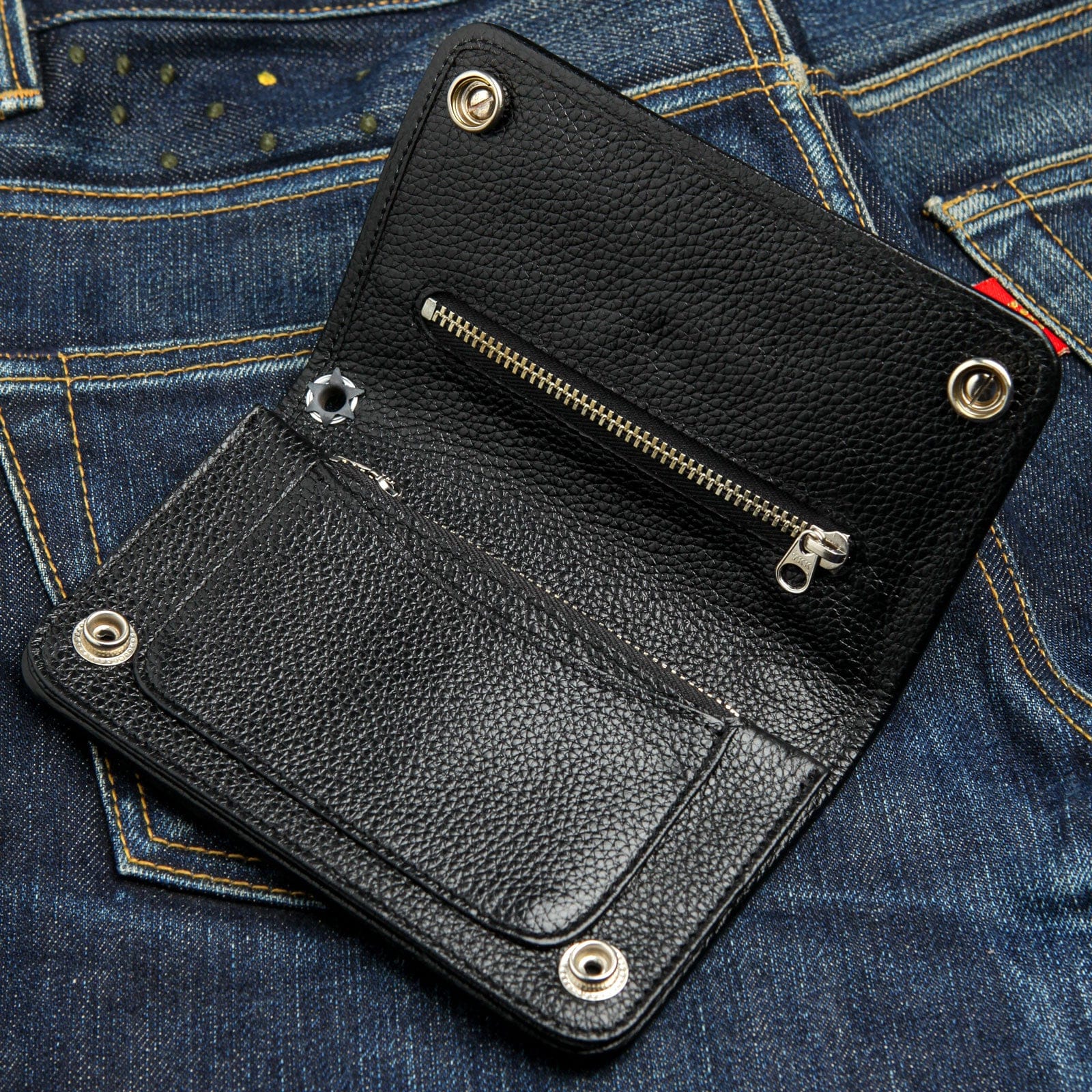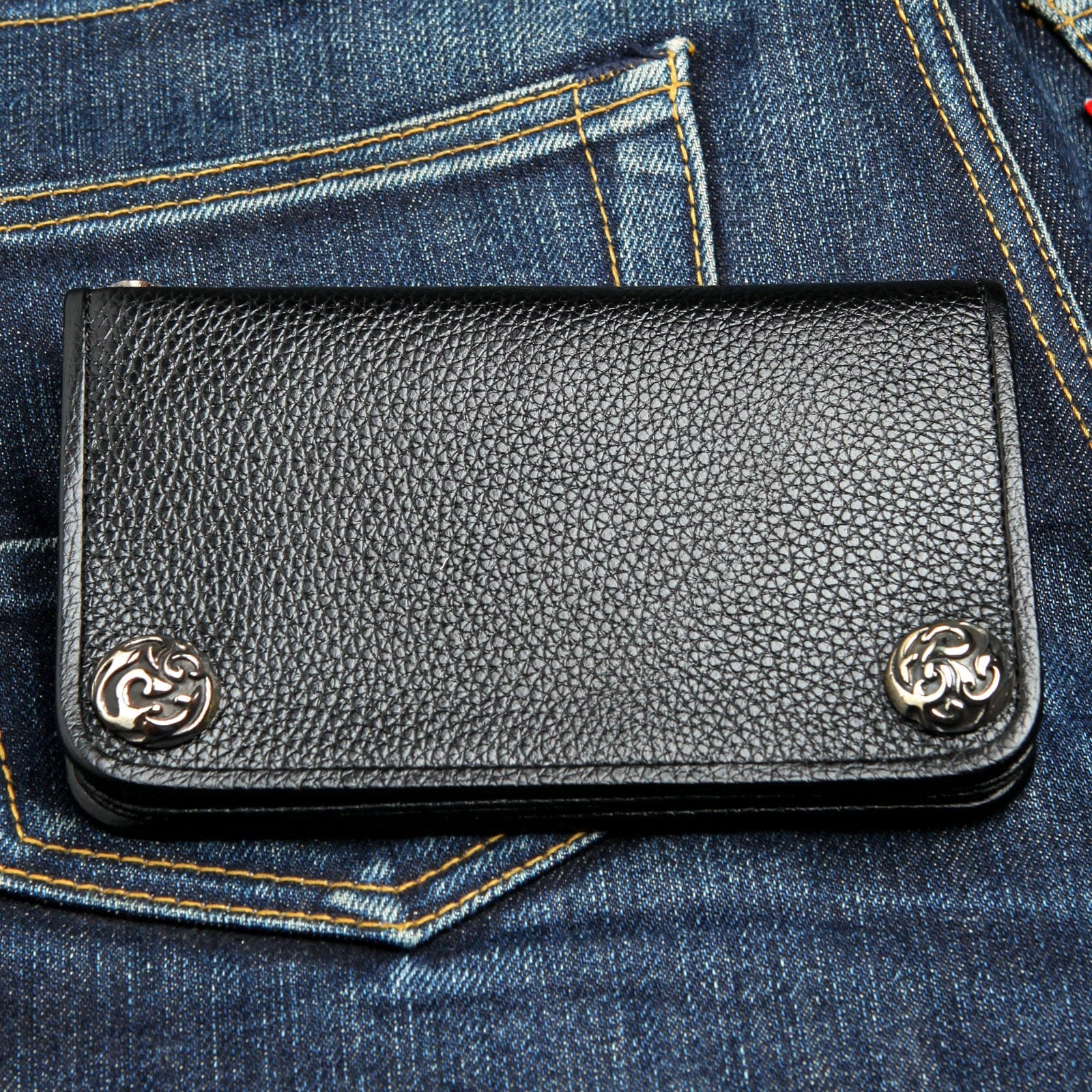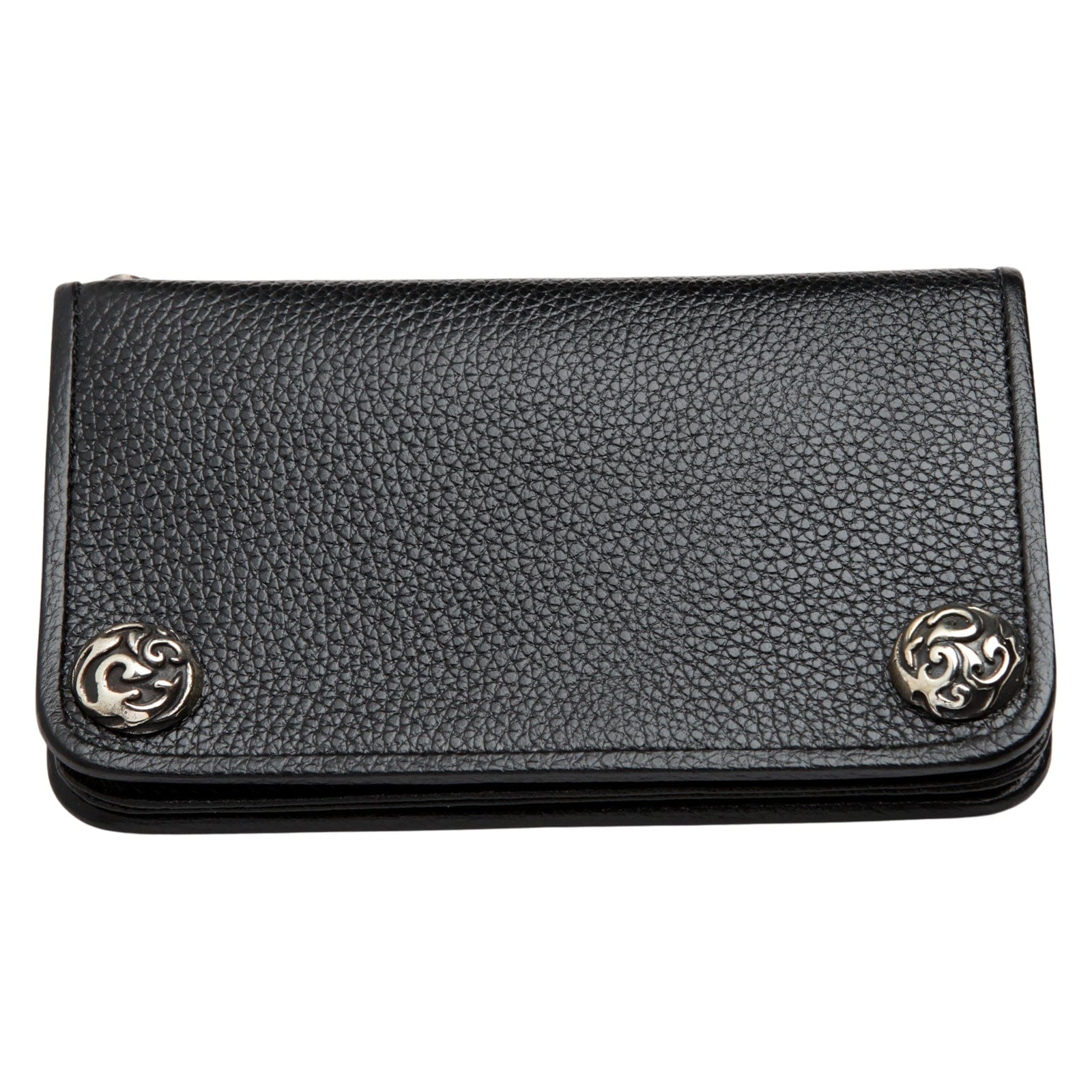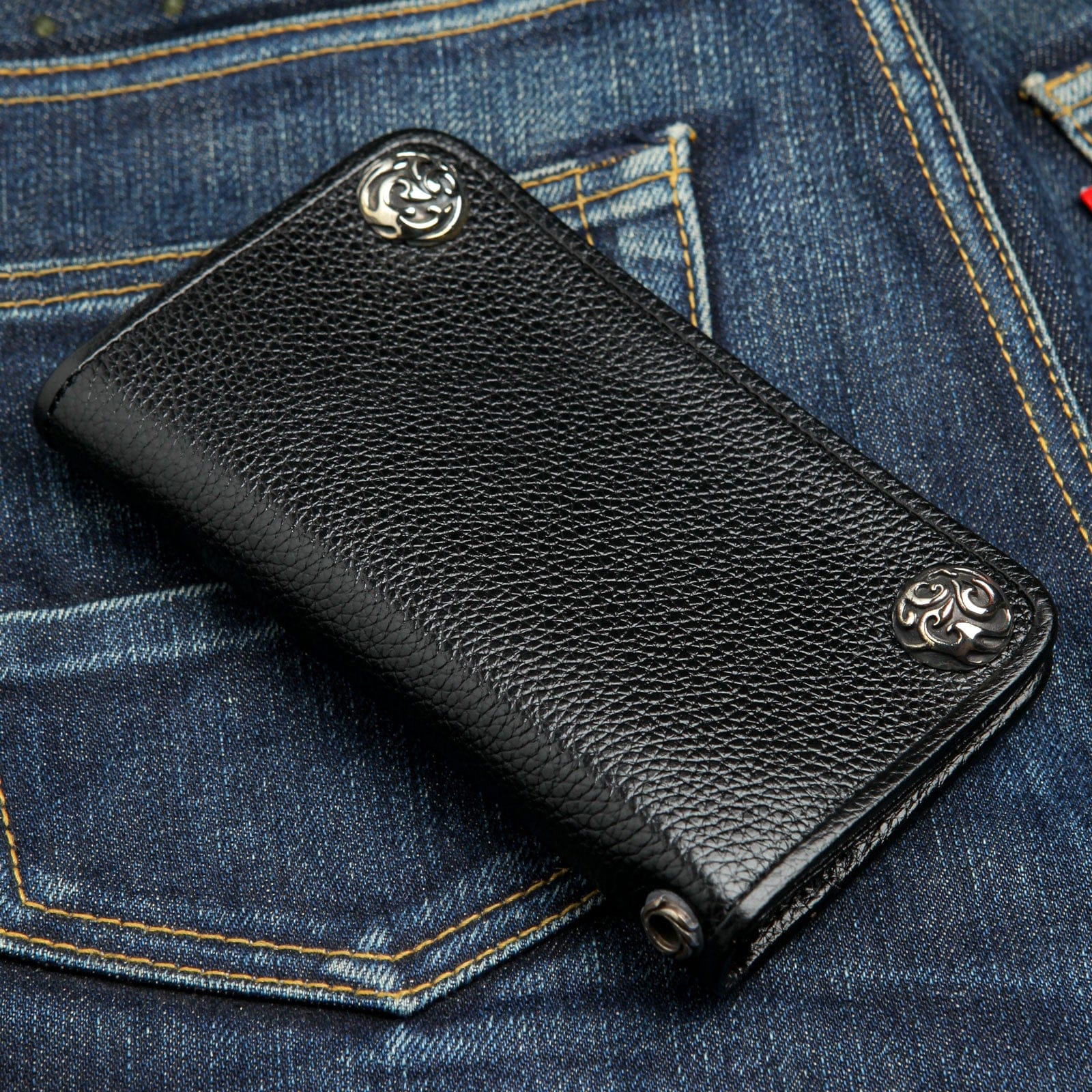 Integrated silver grommets enable easy attachment to wallet chains, enhancing practicality and security, ideal for riders and urban lifestyle.