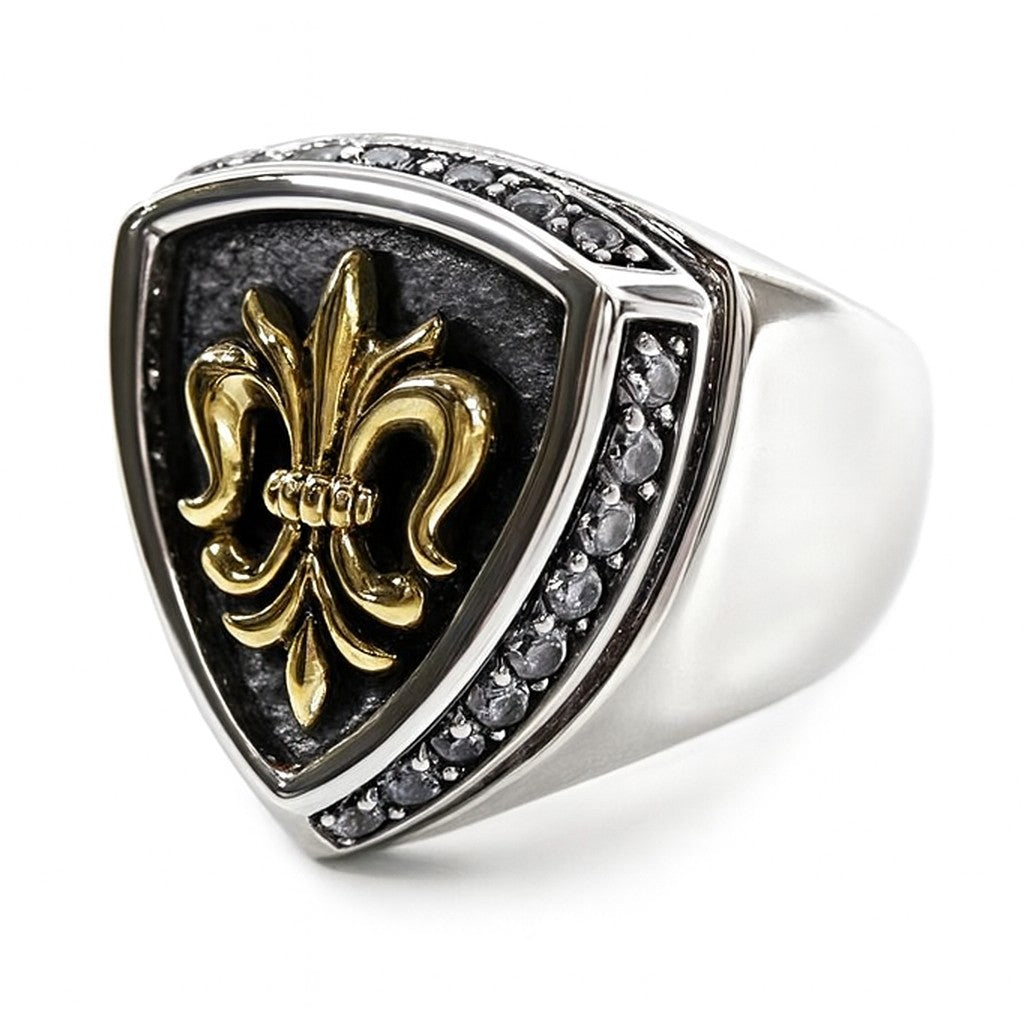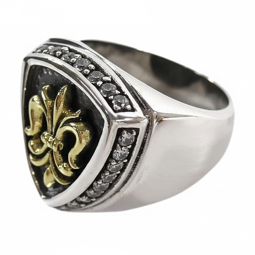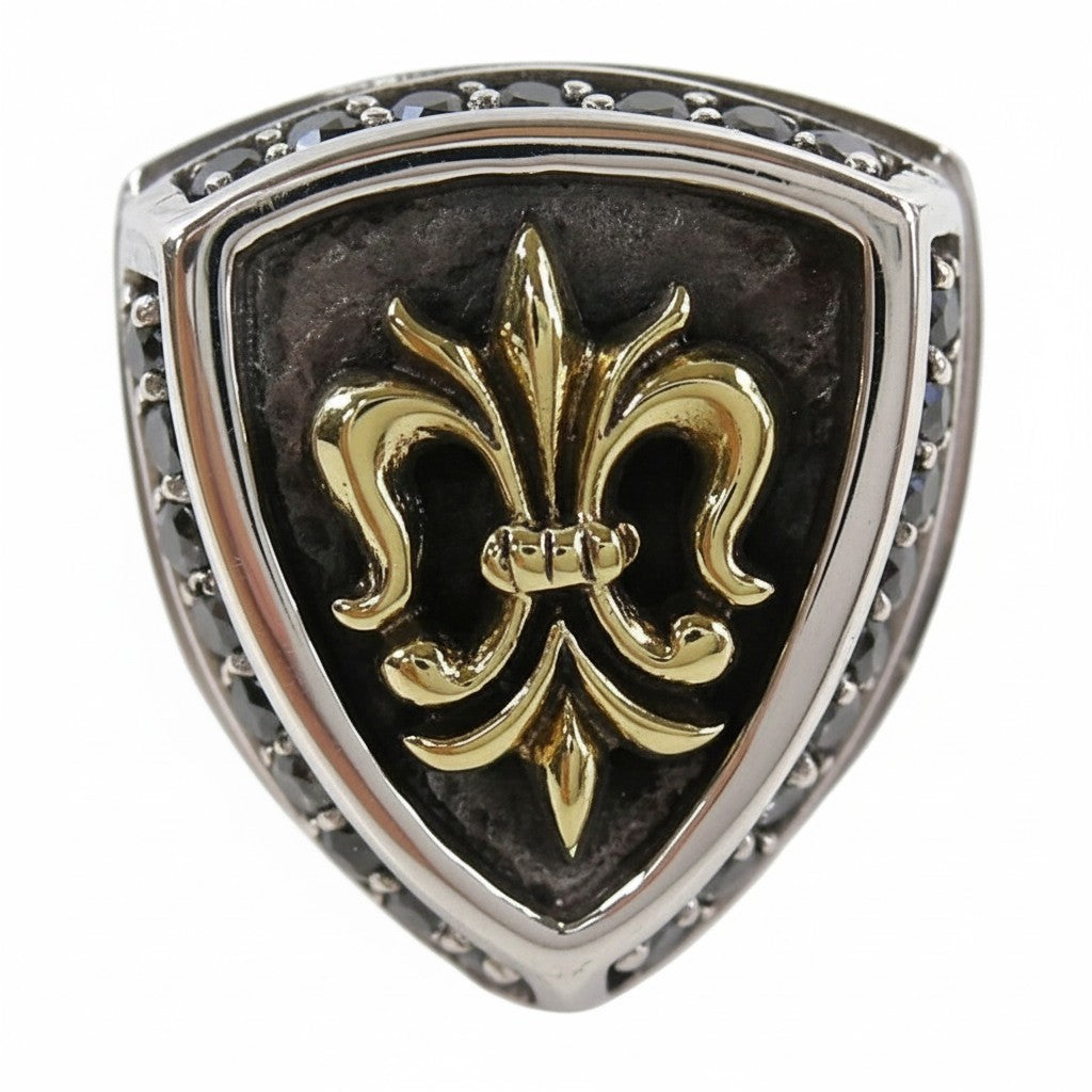 (Body of the Content) The centerpiece of this men's shield ring is the iconic Fleur-de-lis, a heraldic symbol synonymous with French royalty and medieval knights. Here, it's rendered in striking 14K gold plating, standing out in 3D against a dark, oxidized background that adds depth and a vintage feel.