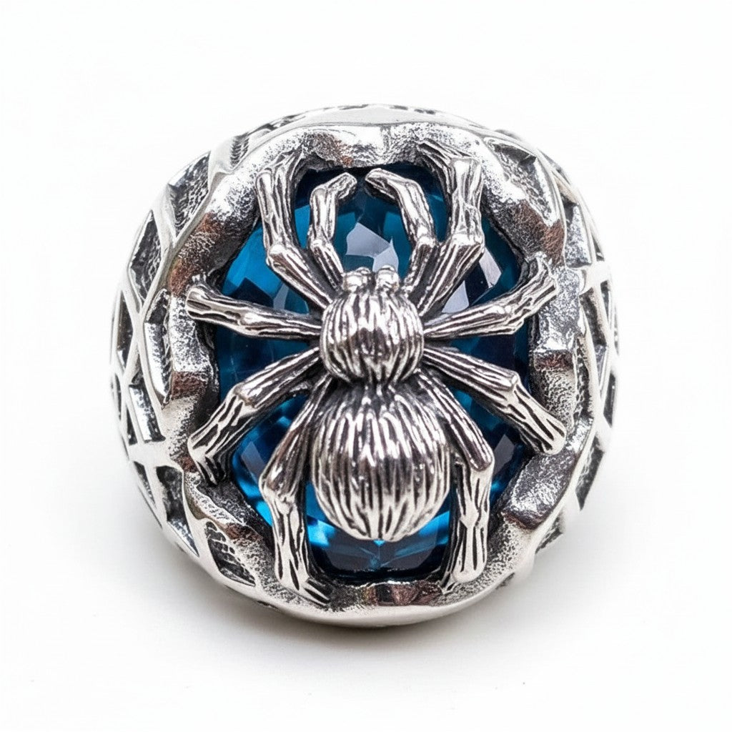 Intricate 3D Design: The star of the show is the meticulously detailed, polished silver spider. It isn't flat; it's a three-dimensional sculpture that appears to crawl across the brilliant blue gemstone, its legs wrapping around the setting.