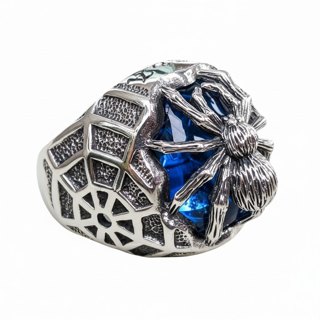 Make a truly bold statement with our intricate Men's Spider Ring. This piece is a masterwork of gothic aesthetic, designed for those who wear their attitude. This statement piece is forged from solid 925 sterling silver and features a stunning, 3D arachnid poised atop a massive, vibrant blue CZ stone. The design is both captivating and symbolic, making it a perfect centerpiece for any Gothic Rings or biker jewelry collection.
