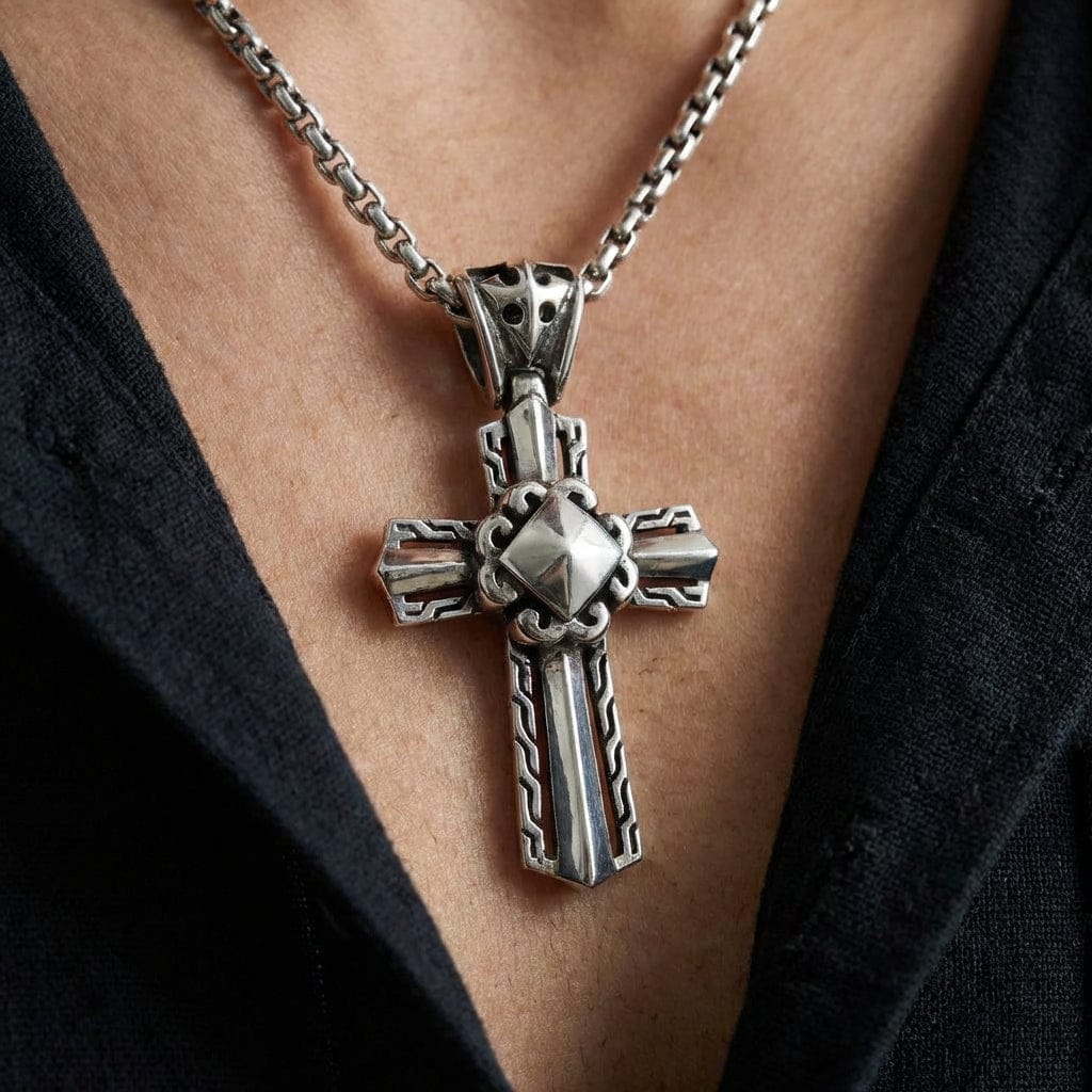 If you want a cross pendant with real mass — At 25 grams, this is one of the heaviest cross pendants in the catalog. It doesn't swing or bounce — it sits against your chest like it's anchored there. The 52mm height means it fills the space between your collarbones with authority. Best on a 4mm+ chain that can support the weight comfortably.