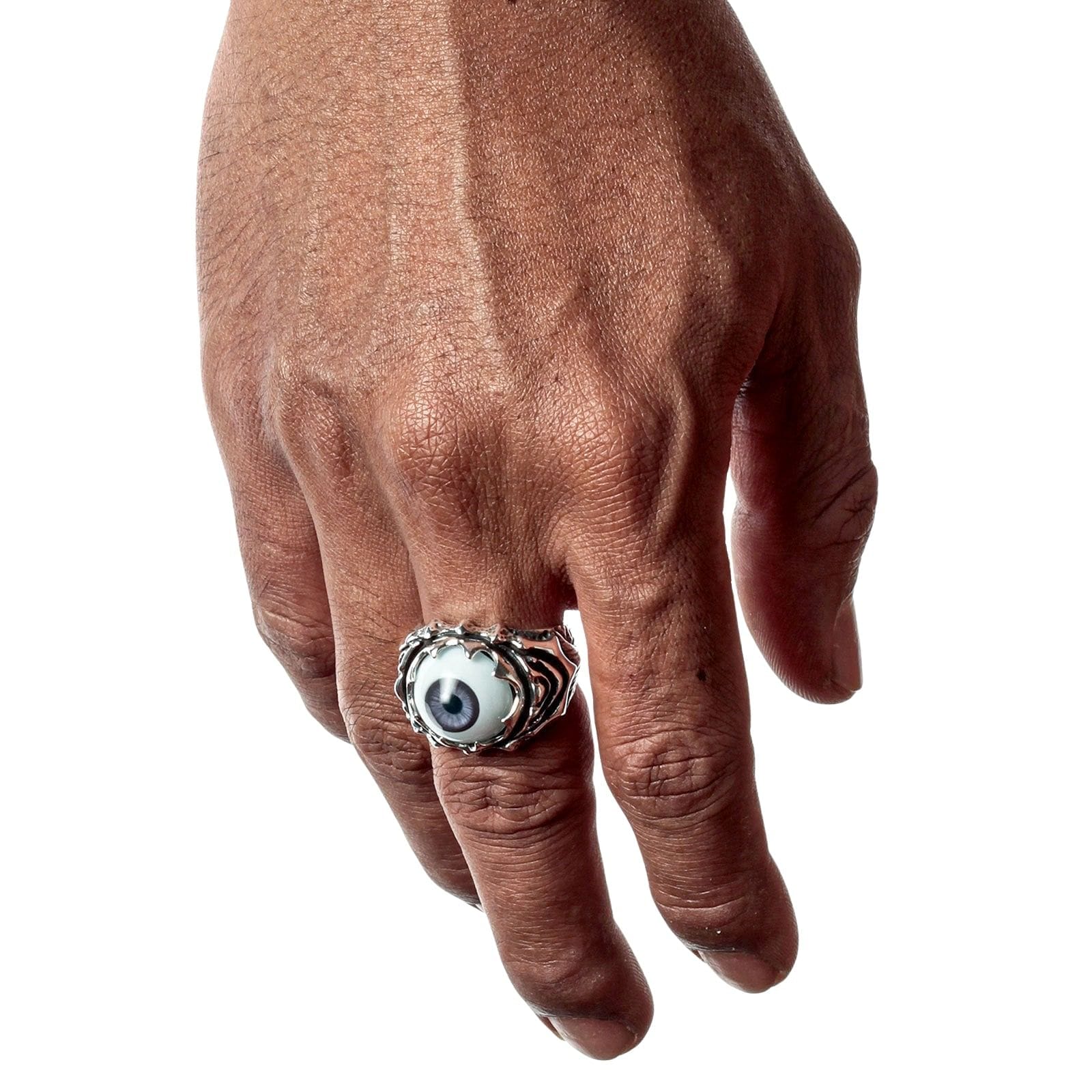 This ring is a window into another world, a masterpiece of monstrous design. The centerpiece is a large, captivatingly realistic eyeball, staring out from your hand with an unnerving and intelligent gaze. It is held within a formidable, organic setting of sharp, claw-like points and rugged, tribal textures, as if the very flesh of a great and terrible creature has been peeled back to reveal its all-seeing eye.