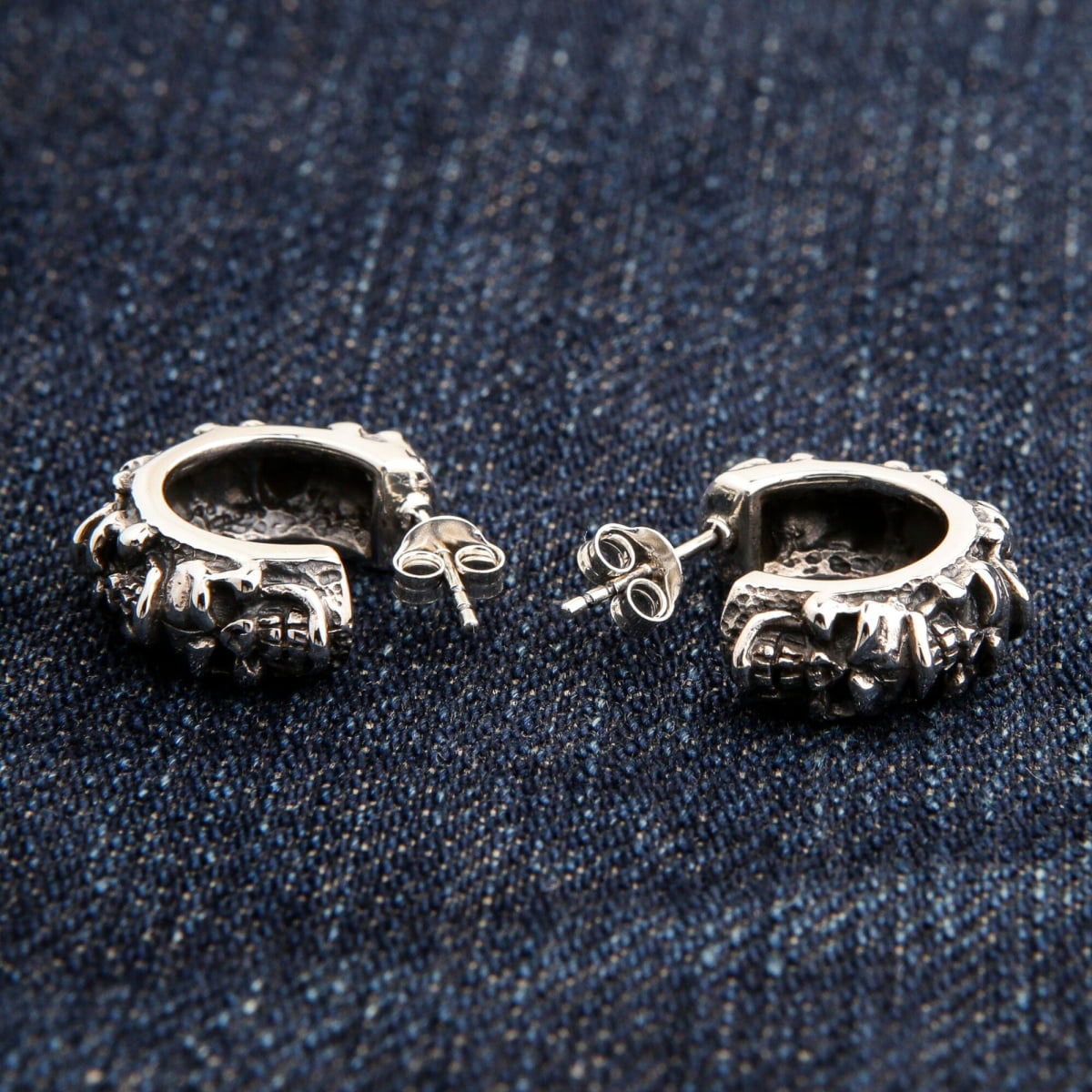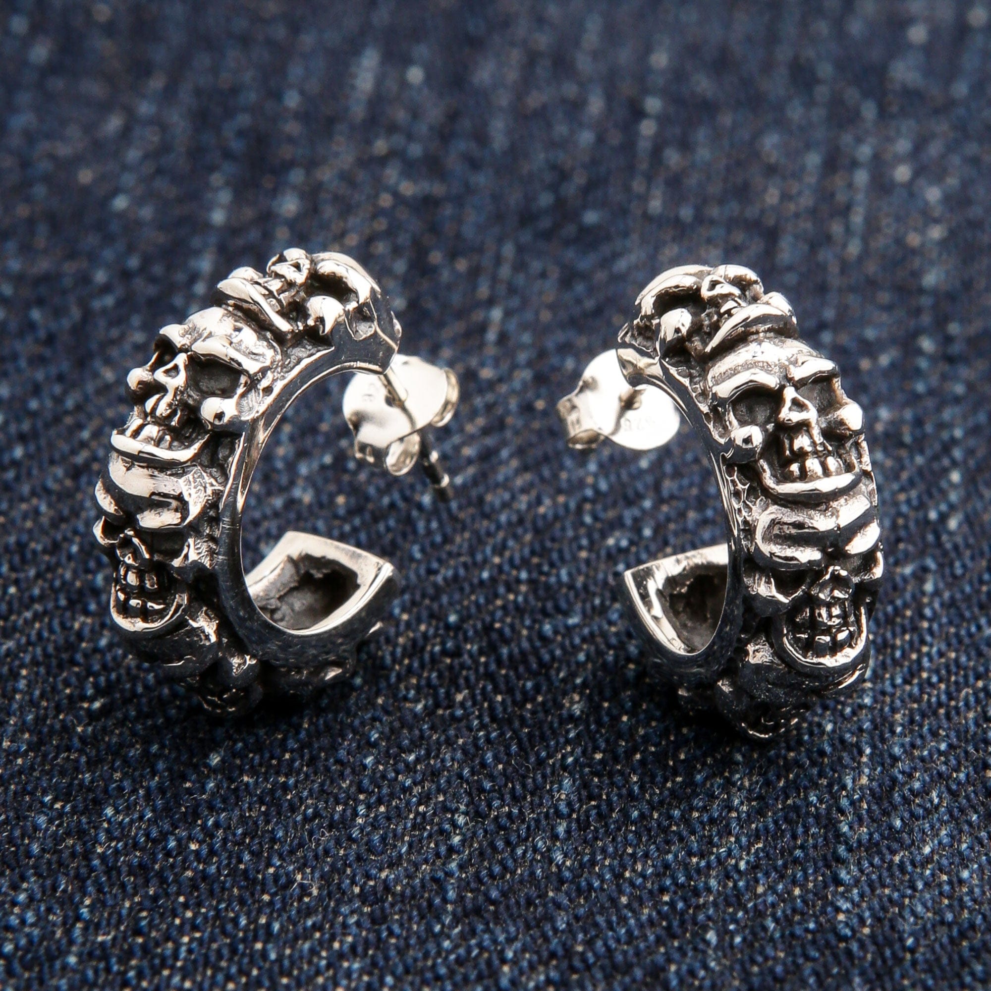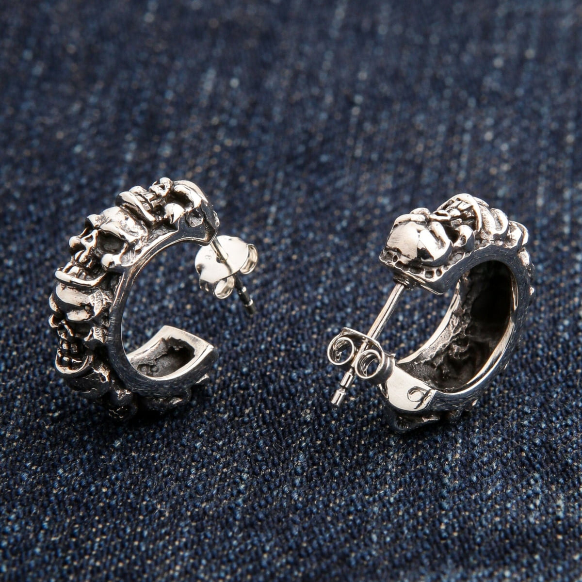 The genius of these earrings lies in their unrelenting commitment to the gothic aesthetic. Each substantial hoop is a macabre tapestry, its entire outer surface covered in a multitude of tiny, intricately detailed skulls. This is not a simple engraving; each skull is a three-dimensional sculpture, creating a rugged, armor-like texture that is incredible to see and touch. A deep, oxidized finish brings out every sinister grin and hollow eye socket, making the polished silver highlights gleam with dark energy. Secured with a sturdy post-and-clutch back, these hoops are a powerful statement of the biker code: a reminder of mortality, a symbol of brotherhood, and an emblem of pure, unapologetic rebellion.