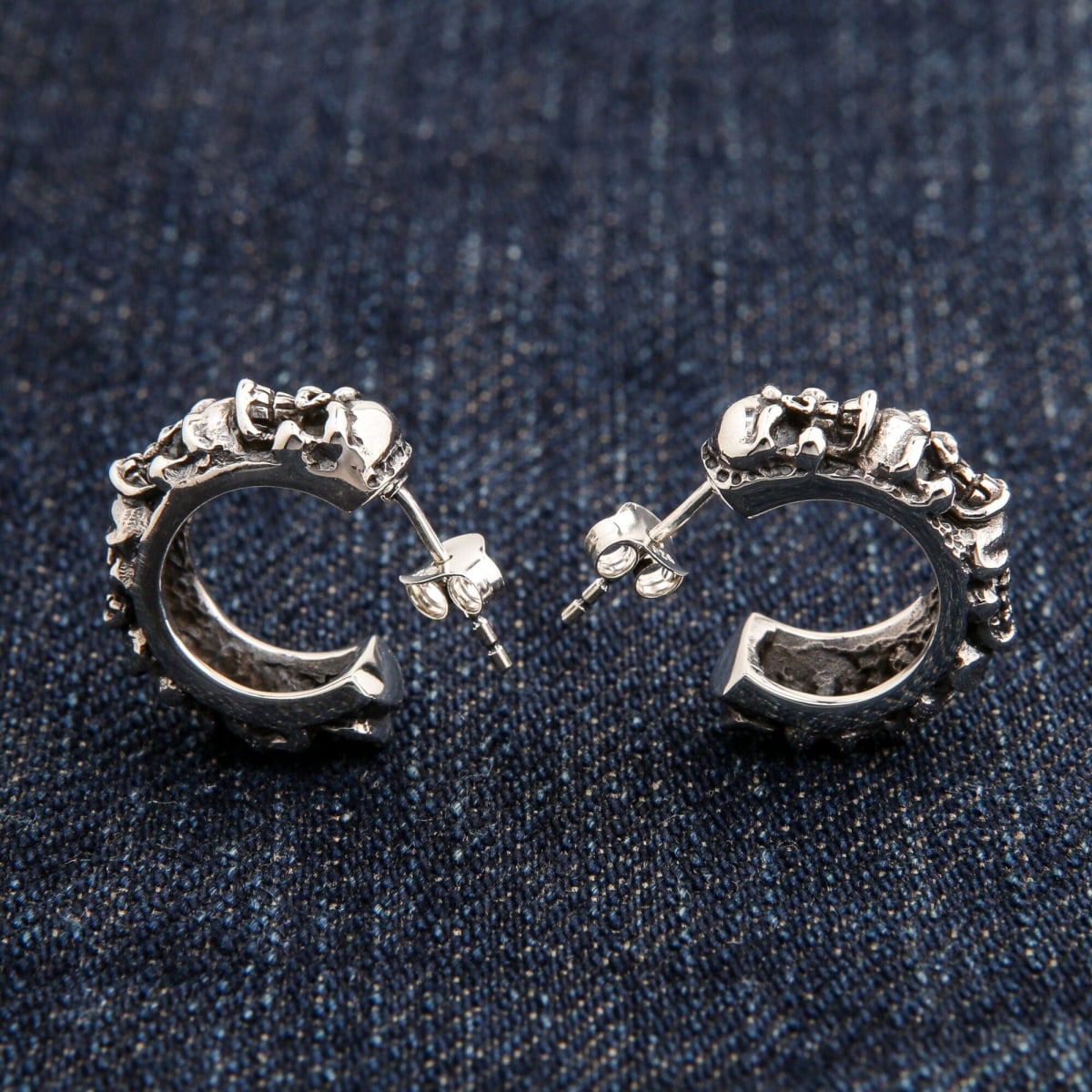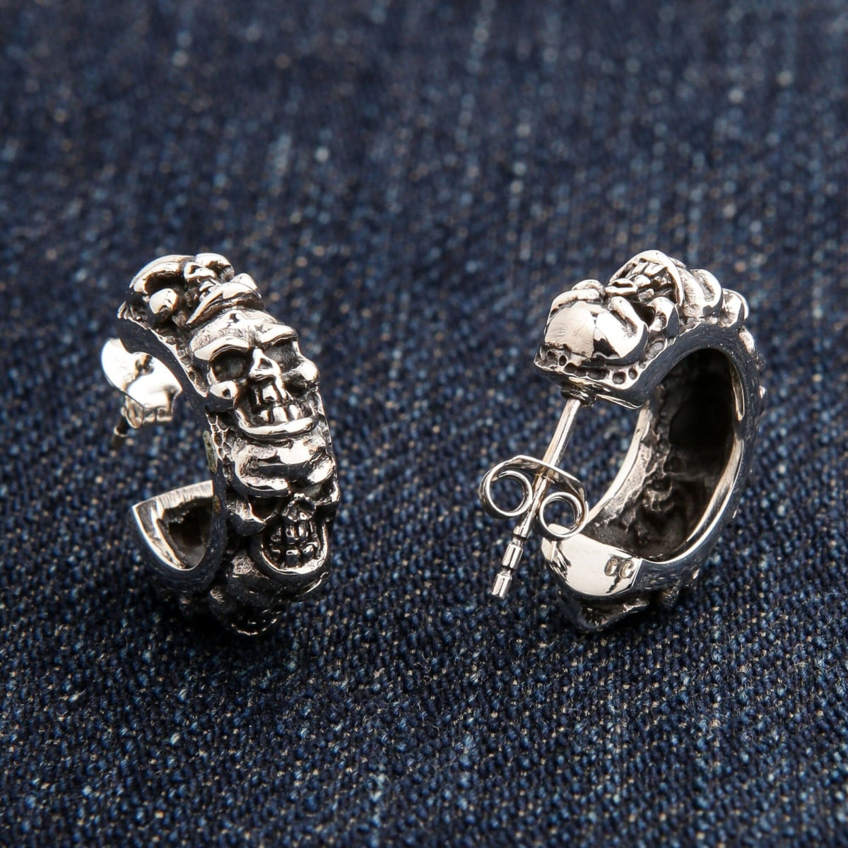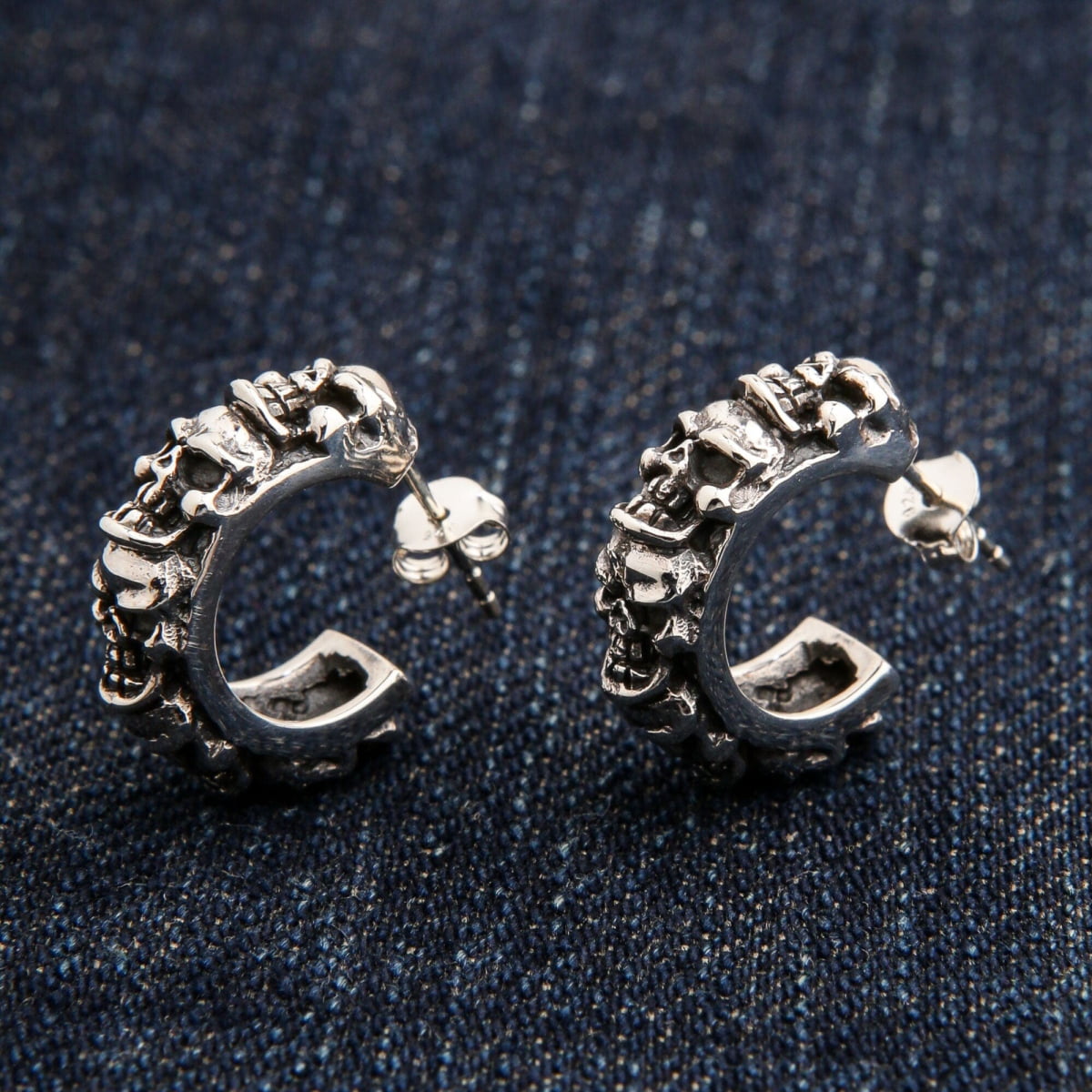 The genius of these earrings lies in their unrelenting commitment to the gothic aesthetic. Each substantial hoop is a macabre tapestry, its entire outer surface covered in a multitude of tiny, intricately detailed skulls. This is not a simple engraving; each skull is a three-dimensional sculpture, creating a rugged, armor-like texture that is incredible to see and touch. A deep, oxidized finish brings out every sinister grin and hollow eye socket, making the polished silver highlights gleam with dark energy. Secured with a sturdy post-and-clutch back, these hoops are a powerful statement of the biker code: a reminder of mortality, a symbol of brotherhood, and an emblem of pure, unapologetic rebellion.