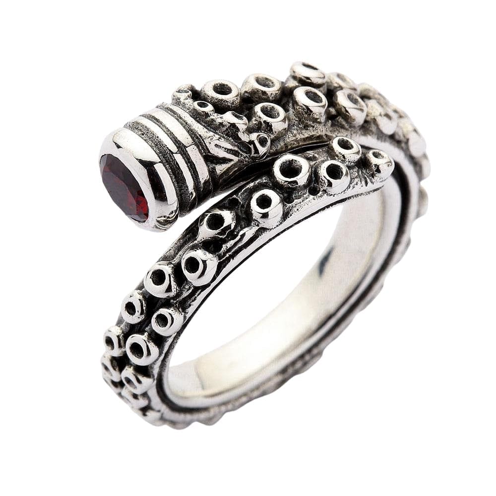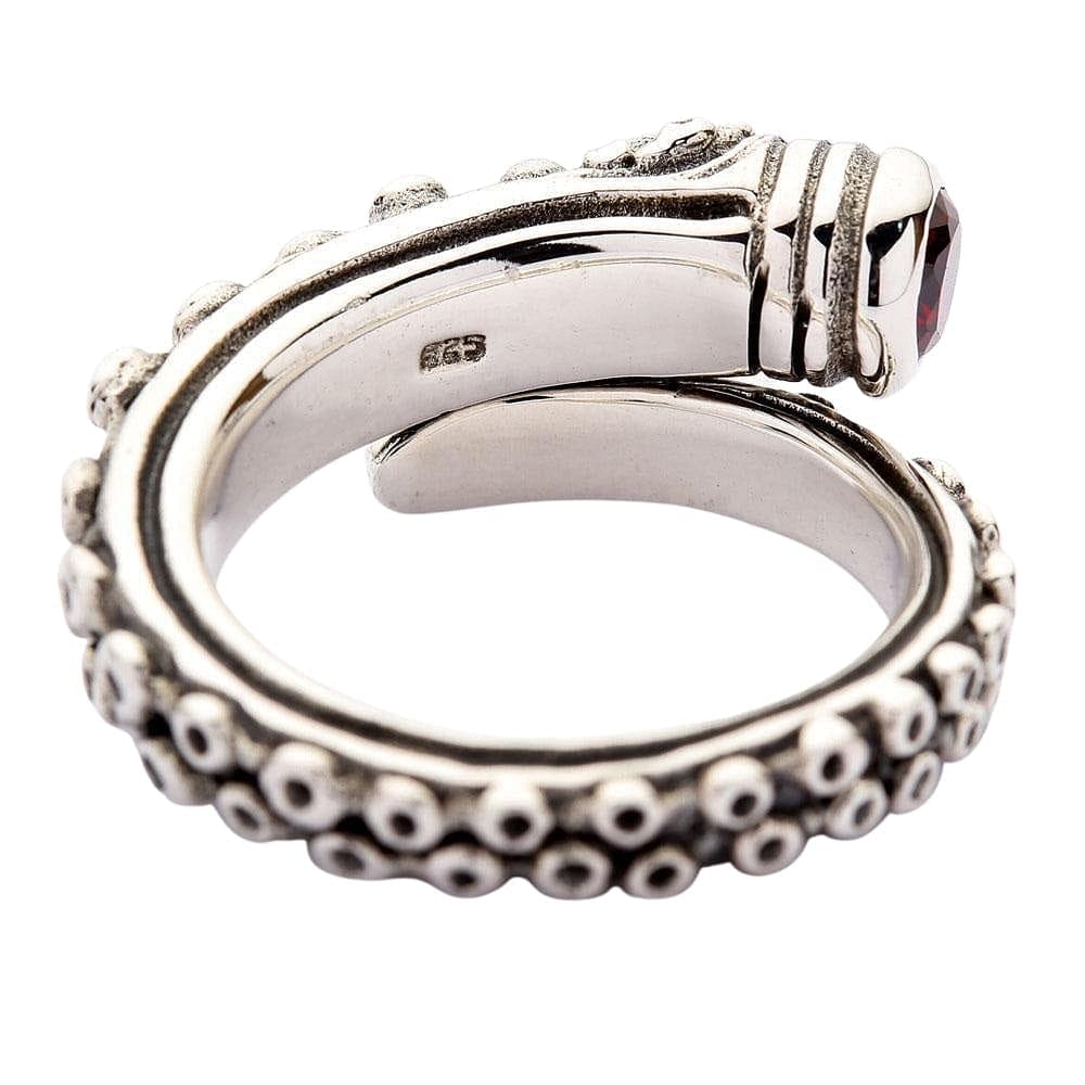 This ring is a tribute to the power and grace of the ocean's most intelligent dweller. The entire band is a single, powerful tentacle, wrapping around your finger in a dynamic embrace. Every single suction cup is rendered with stunning realism and highlighted with a dark, oxidized finish for incredible depth and texture. Capping the end of this formidable limb is a single, faceted red CZ stone, set like a captured jewel or a mysterious, glowing eye. This stunning spark of color adds a sense of danger and passion to the cool silver. The clever open-wrap design not only looks incredible but also allows for a comfortable, adjustable fit, making this 13-gram statement piece as adaptable as the creature that inspired it.