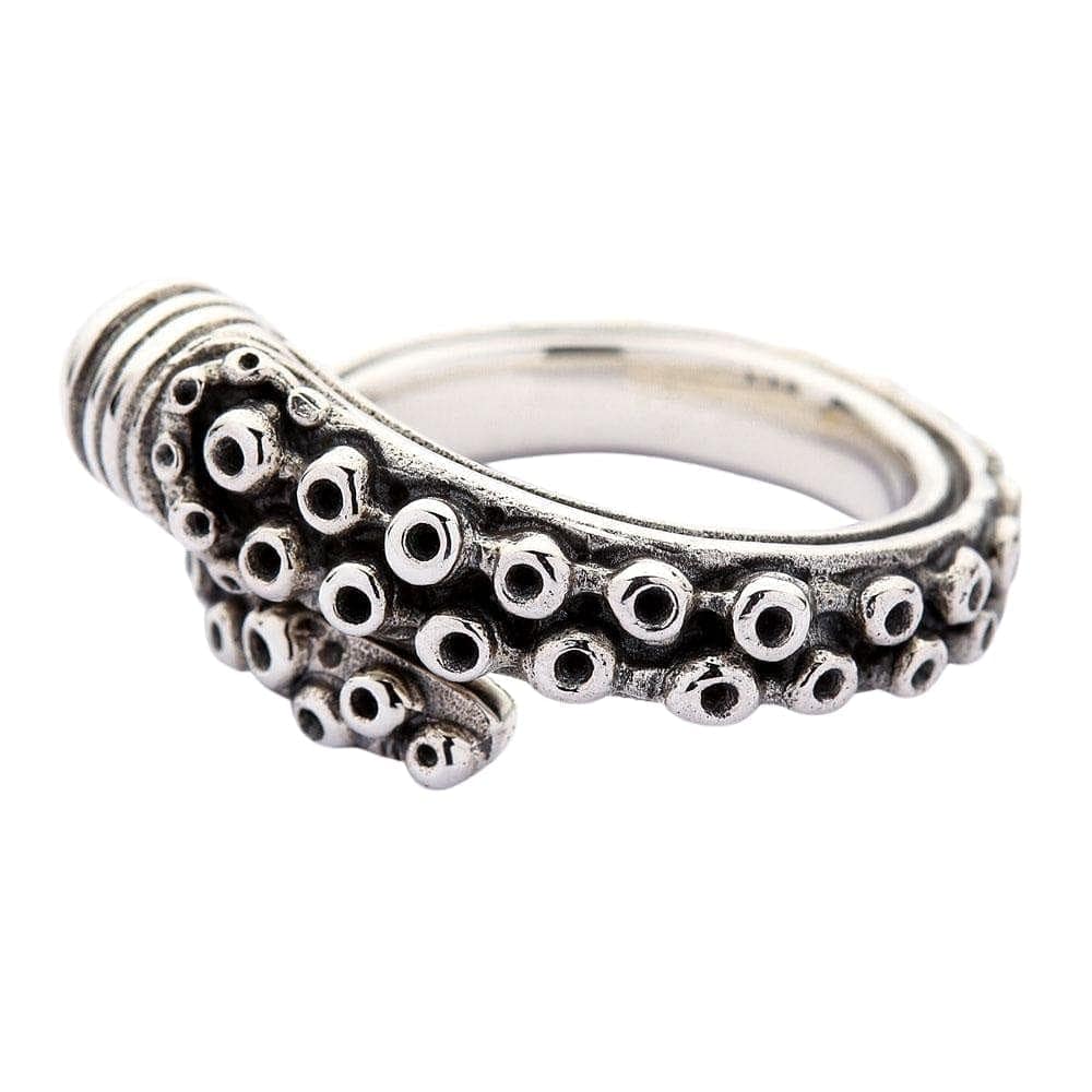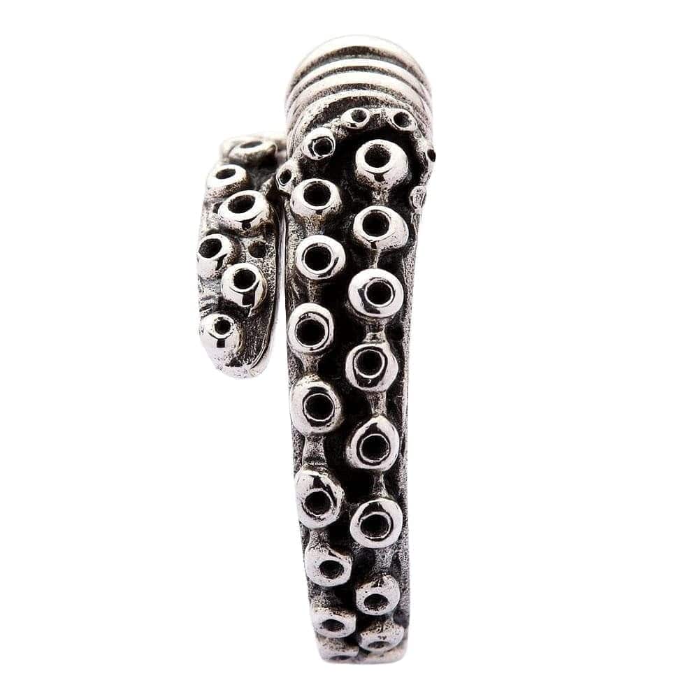 š Realistic Tentacle Design: A stunning and fluid sculpt of a single octopus tentacle that wraps around the finger, featuring incredibly detailed, oxidized suction cups.