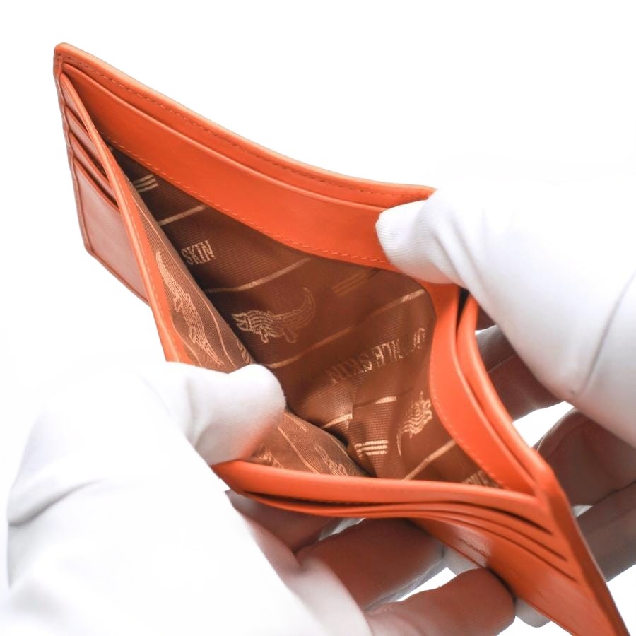 Highly Functional Interior: Despite its sleek bifold design, the interior is built for maximum organization. It opens to reveal a matching smooth orange leather interior, complete with 10 credit card slots and two full-length bill compartments. It’s designed to hold all your essentials securely and neatly.