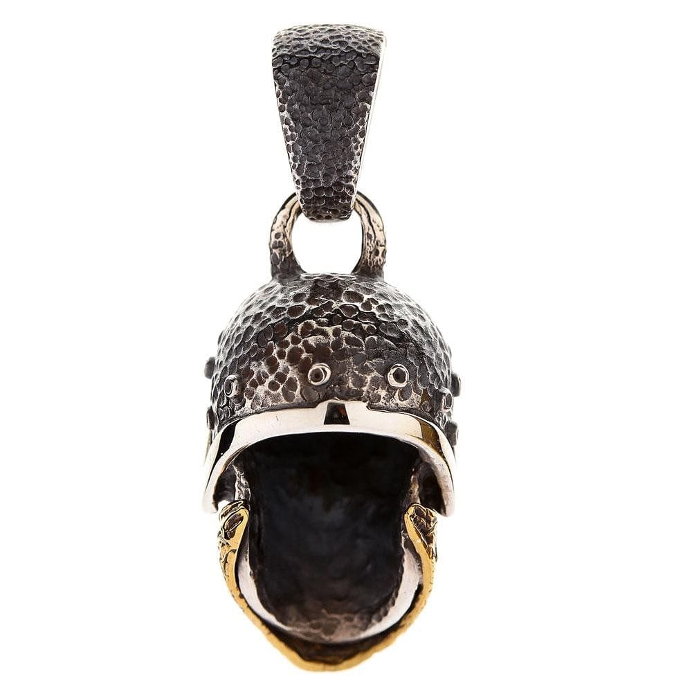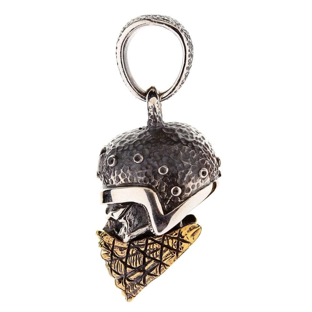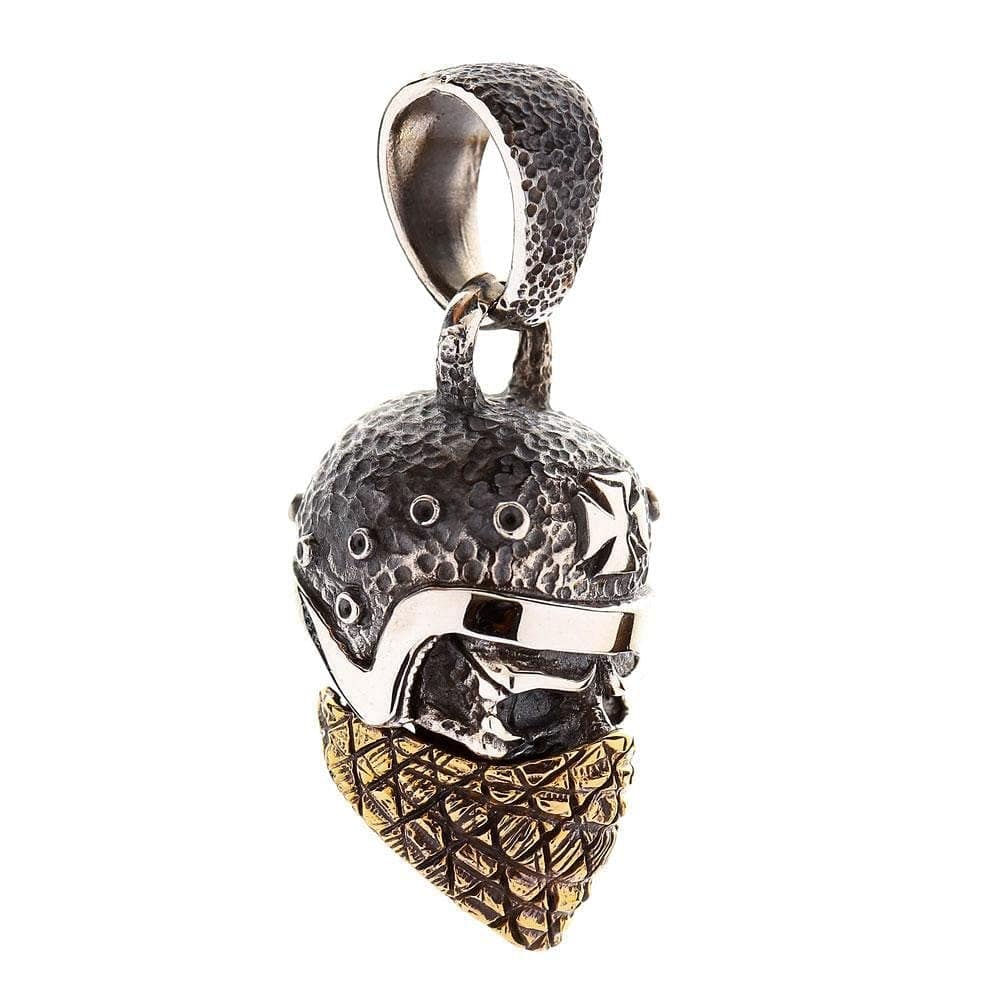 This pendant is a masterclass in classic biker symbolism. The foundation is a grim sterling silver skull, the ultimate symbol of fearlessness and mortality. It's fitted with a vintage-style biker helmet, complete with a bold Iron Cross—a timeless emblem of honor and rebellion in motorcycle culture. Providing a stunning visual contrast, a brass bandana with a detailed quilted pattern covers the lower face, giving the skull a mysterious, outlaw identity. The craftsmanship is as rugged as the design, with a hammered texture on the helmet and deep, oxidized details. Weighing a colossal 31 grams, this heavyweight pendant has the substantial feel of true, road-worthy gear.