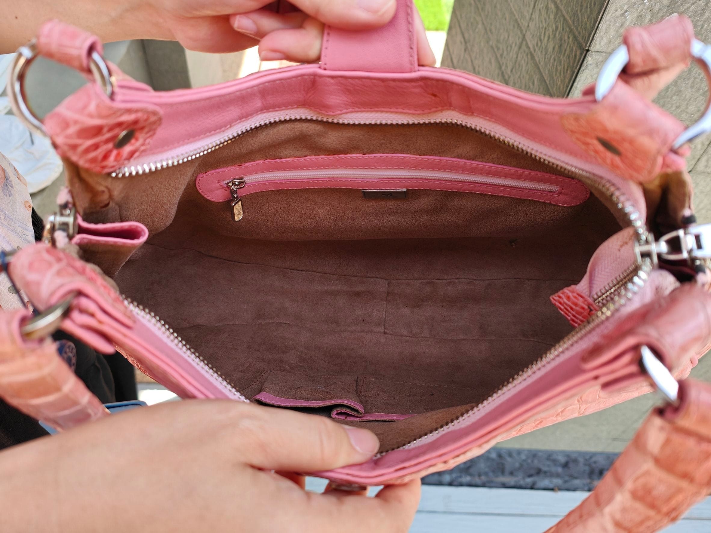 The soul of this bag lies in the unparalleled texture of its material. The exterior is crafted from genuine crocodile hornback leather, the most visually dramatic part of the hide. The distinctive, bony scutes create a rugged, three-dimensional surface that is as durable as it is eye-catching. This incredible texture is then dyed a soft, elegant pink, creating a beautiful contrast between raw strength and delicate femininity. Every piece is painstakingly hand-stitched by an expert artisan, ensuring it's not only beautiful but built to last. The spacious interior is lined with a soft woolen fabric and features zippered pockets to keep your essentials organized and protected in absolute style.