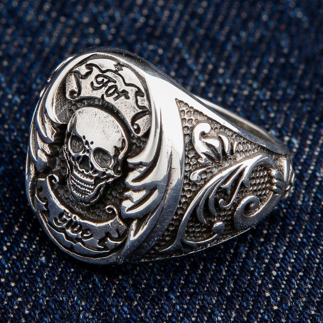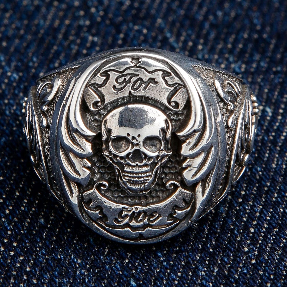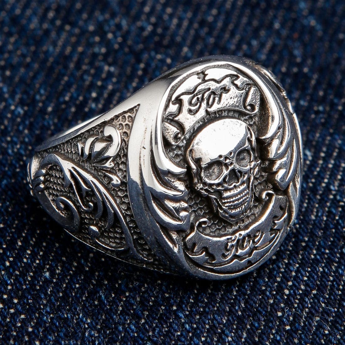Make a promise that's set in stone—or, in this case, solid silver. Our striking Por Vida Skull Ring is more than a piece of biker jewelry; it's a powerful statement of loyalty. 'Por Vida,' the timeless Spanish motto for 'For Life,' is boldly declared on this ring, representing an unbreakable bond of brotherhood and undying commitment.