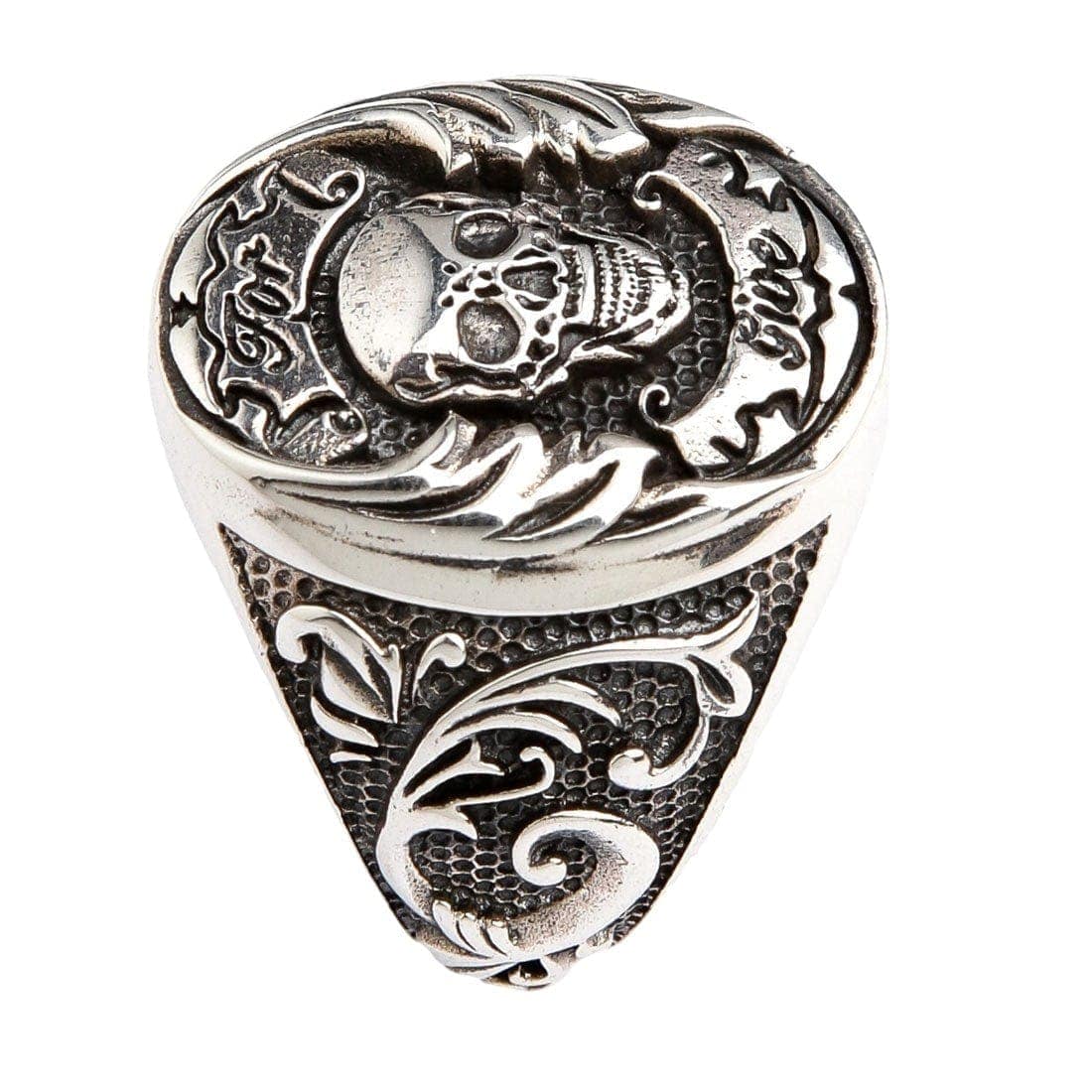 Expertly handcrafted from a substantial 19 grams of solid .925 sterling silver, this signet ring has the authentic weight and feel of a true heirloom piece. A deep, oxidized finish is used to create a stunning contrast, making the polished skull and intricate details leap out. It’s the perfect symbol for your club, your family, or your personal code of honor. Find more powerful statements in our Biker Rings collection.