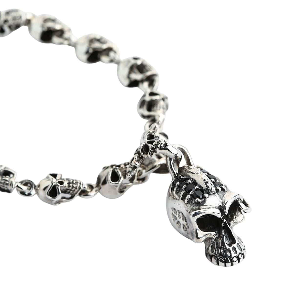 This bracelet is a pure distillation of the punk rock and gothic ethos. A rugged chain composed of individual, grinning skulls—each a classic memento mori—wraps around the wrist with undeniable attitude. The centerpiece is a larger, more menacing skull, its cranium masterfully encrusted with glittering black stones that absorb the light like a black hole.