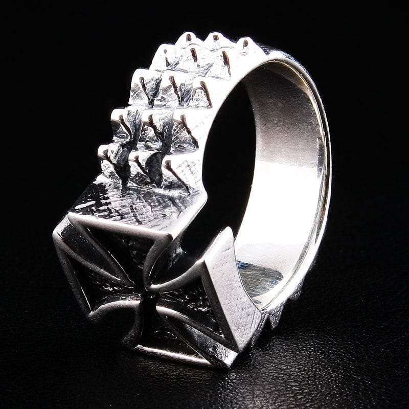 At the heart of this ring lies the iconic Iron Cross. Once a symbol of military honor, it has been reclaimed by bikers, punks, and rockers as a potent emblem of rebellion and fierce independence. This defiant spirit is magnified by the formidable band, which is forged with three rows of sharp, thorn-like studs, creating a look that is both protective and aggressive. The cross itself is a work of art, featuring a rugged, textured interior framed by brilliantly polished, beveled edges. This stunning contrast, combined with a solid 14-gram weight, makes for an uncompromising piece of wearable art that is steeped in counter-culture history.