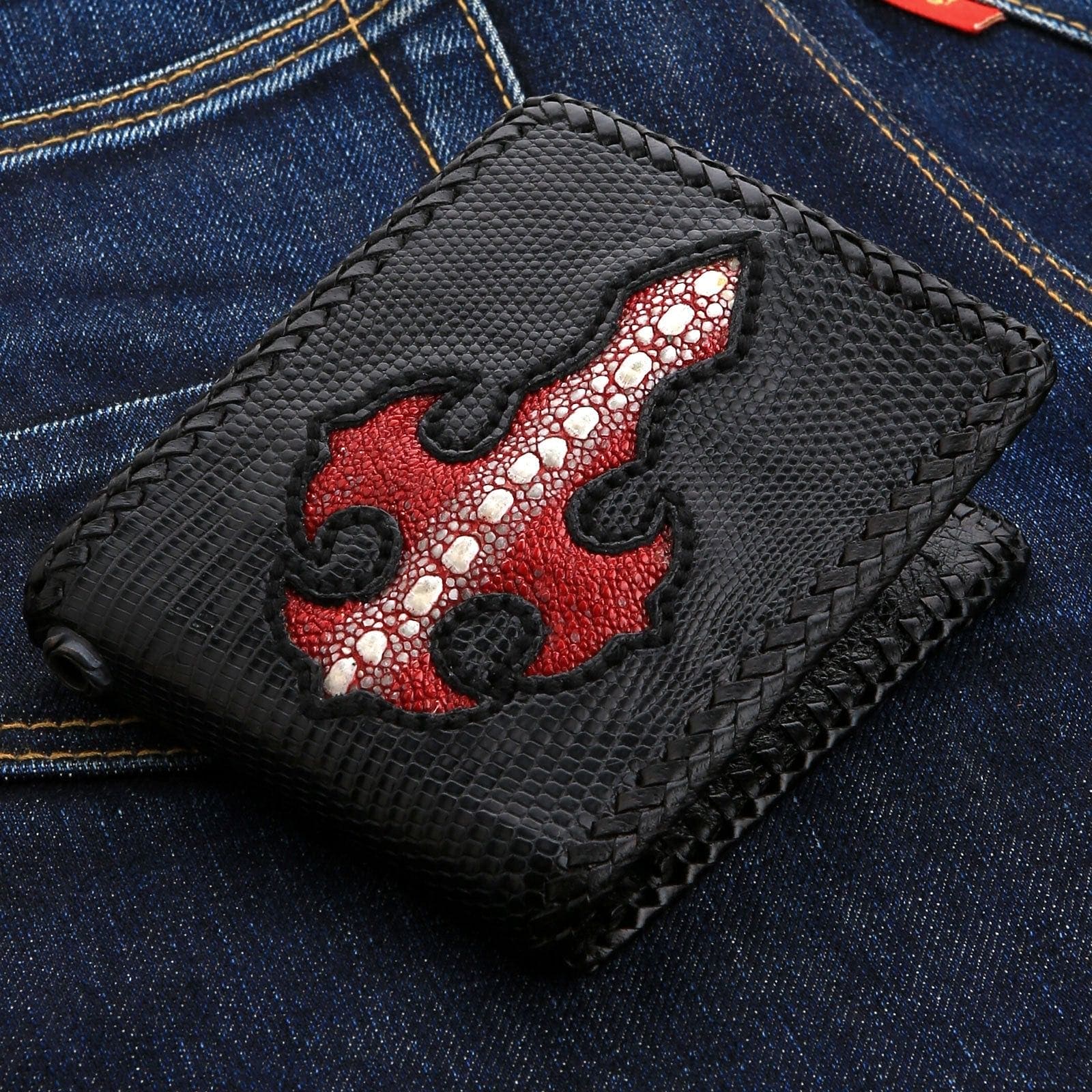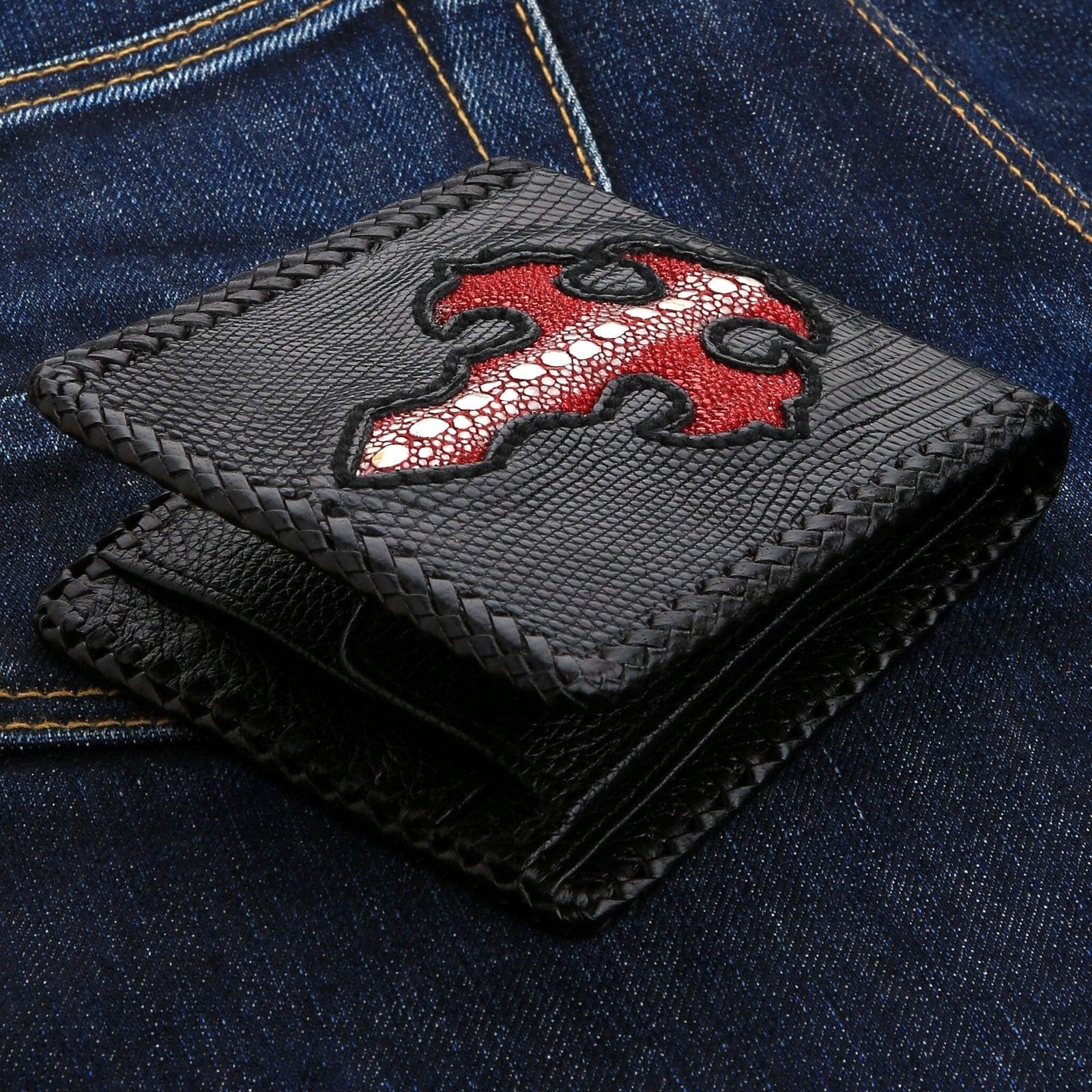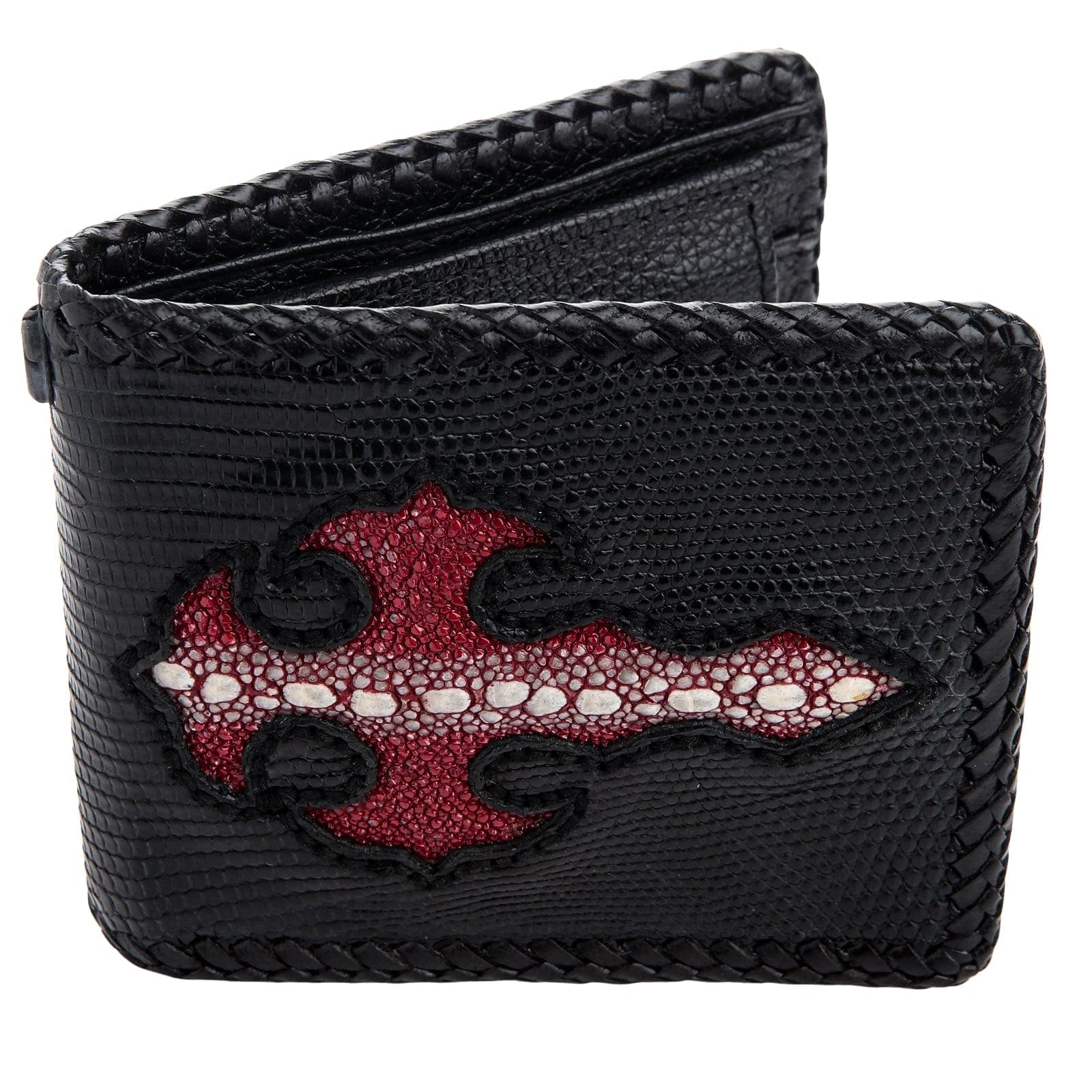 The power of this wallet lies in its fearless combination of exotic materials. The entire body is crafted from genuine black lizard skin, offering a sophisticated, fine-scaled texture. Inlaid into this dark canvas is a bold, gothic-style cross made from fiery red stingray leather. Renowned for its unique, pebble-like surface of bony tubercles and its near-indestructible nature, the stingray inlay provides a stunning pop of color and texture. The entire piece is framed with a meticulously hand-finished braided leather edge, adding to its rugged, custom feel. Inside, a thoughtfully designed layout with a secure coin pocket, card slots, and bill compartments ensures this statement piece is as practical as it is impressive.