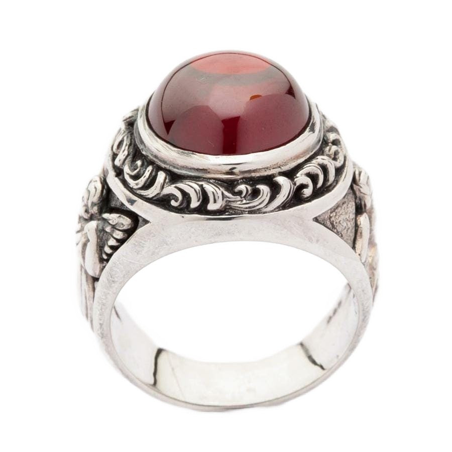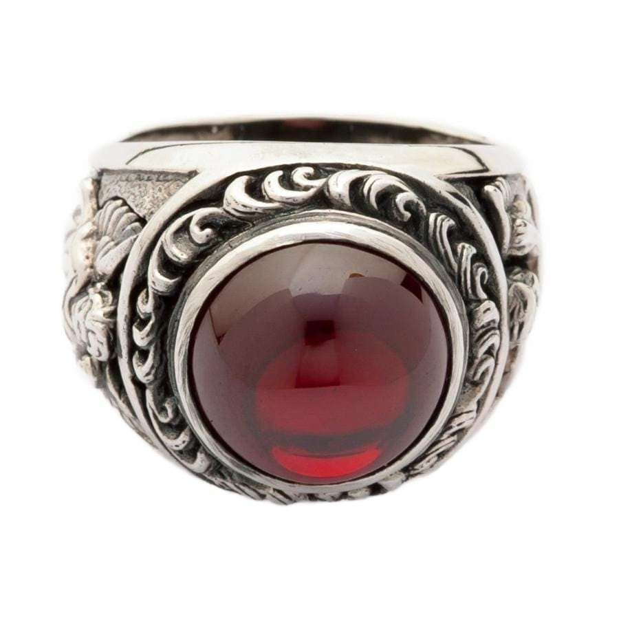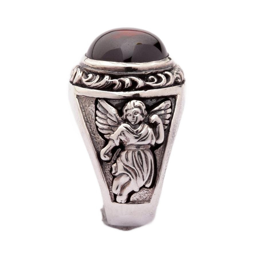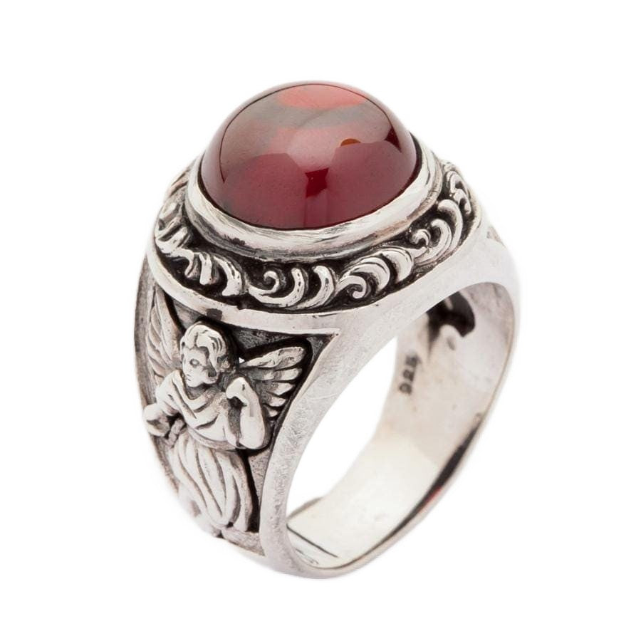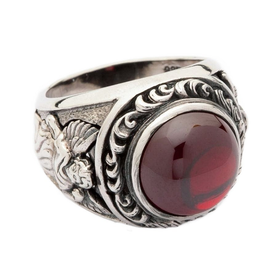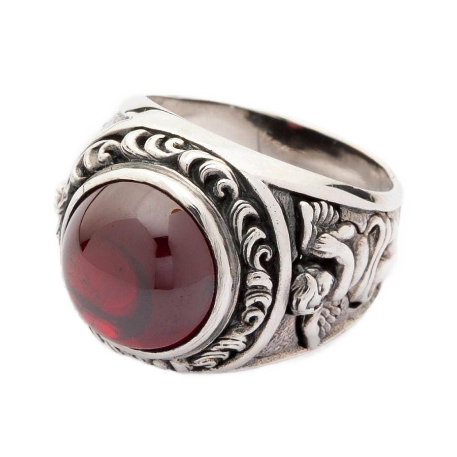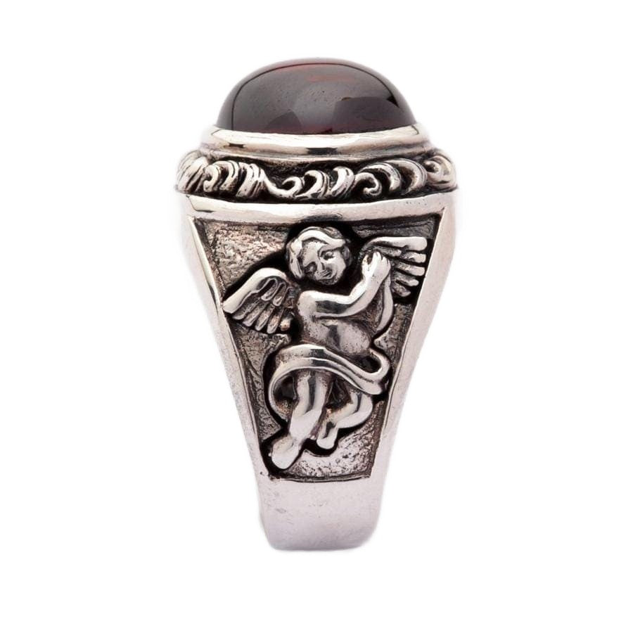 At the heart of this formidable ring sits a large, smooth, and alluring red cabochon stone. Its deep, blood-red hue, polished to a glassy shine, is a powerful symbol of passion and vitality. This magnificent 14mm stone is held in an ornate silver setting, masterfully carved with swirling gothic patterns. Guarding this precious gem on each side is a beautifully detailed Cupid, or cherub, with angelic wings, forever protecting the love it represents. This fusion of classical romance and gothic artistry creates a truly unforgettable piece of jewelry.