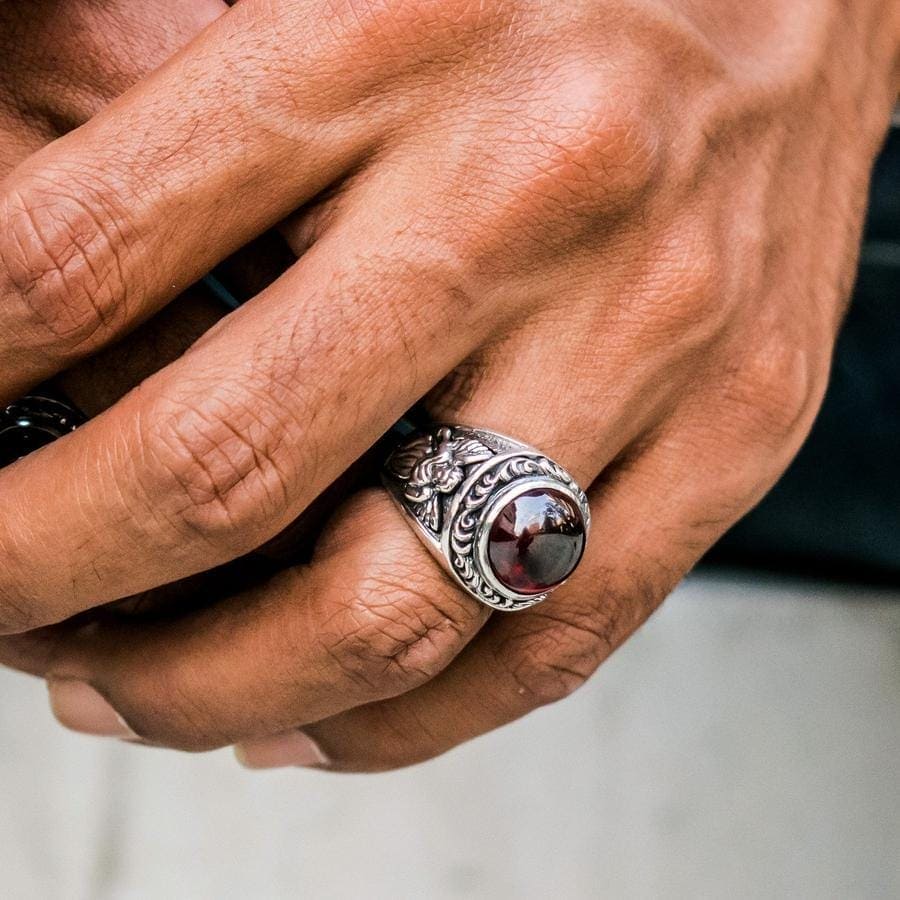 🌹 Captivating Red Cabochon Stone: A large, 14mm x 14mm smooth red cabochon gemstone (Garnet-style CZ) sits as the magnificent, blood-red focal point.
