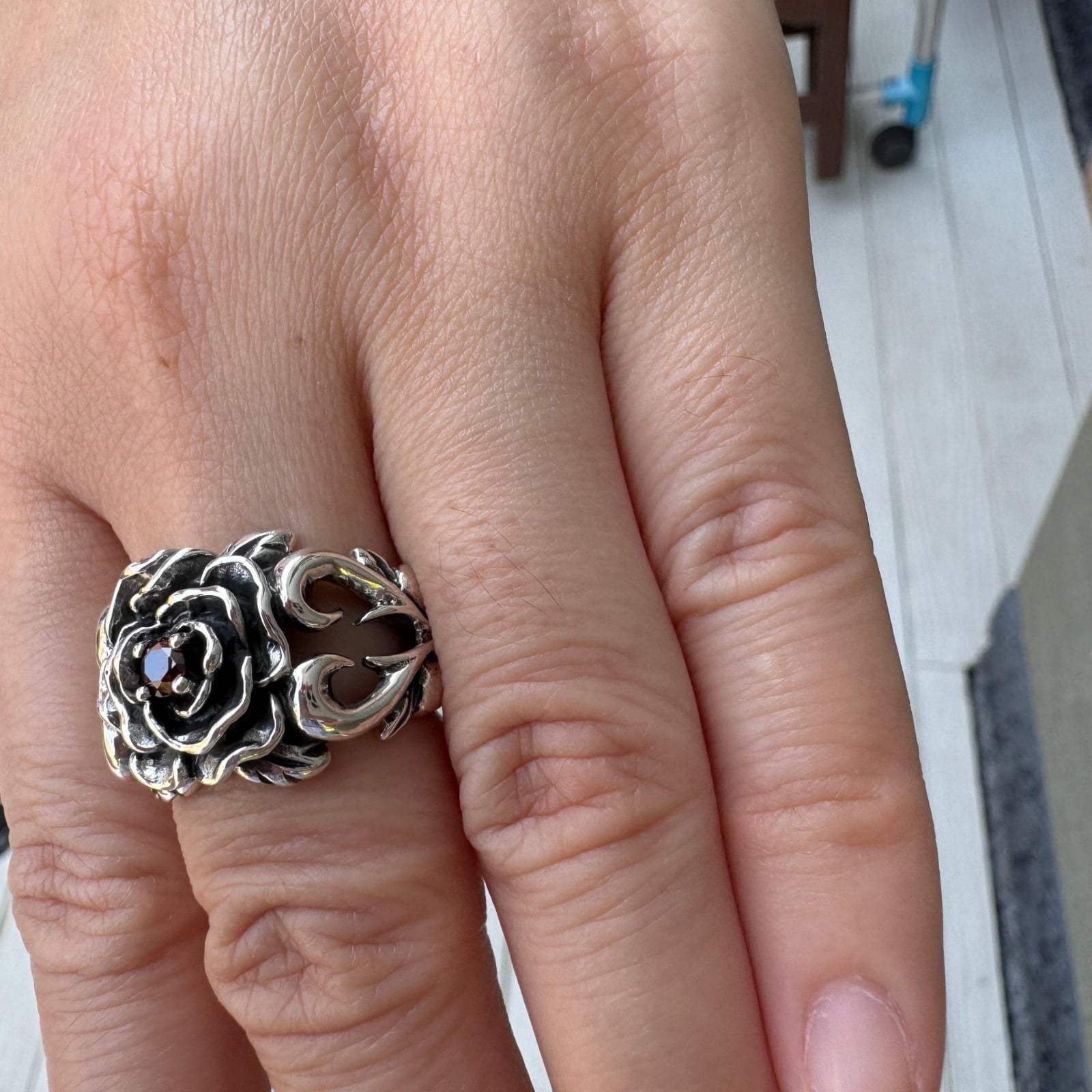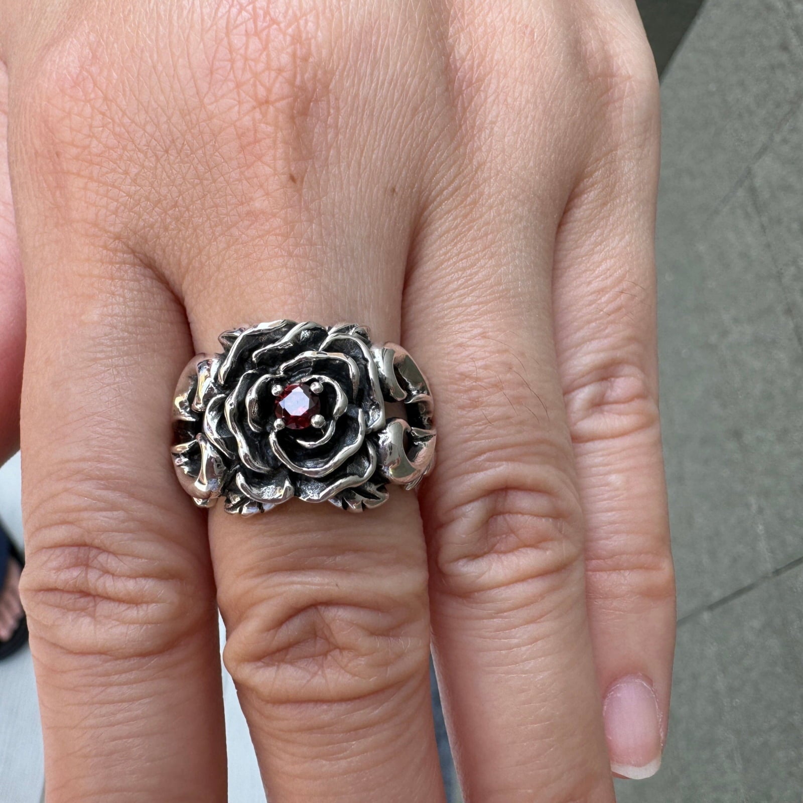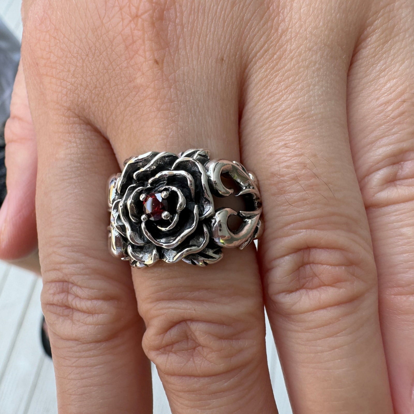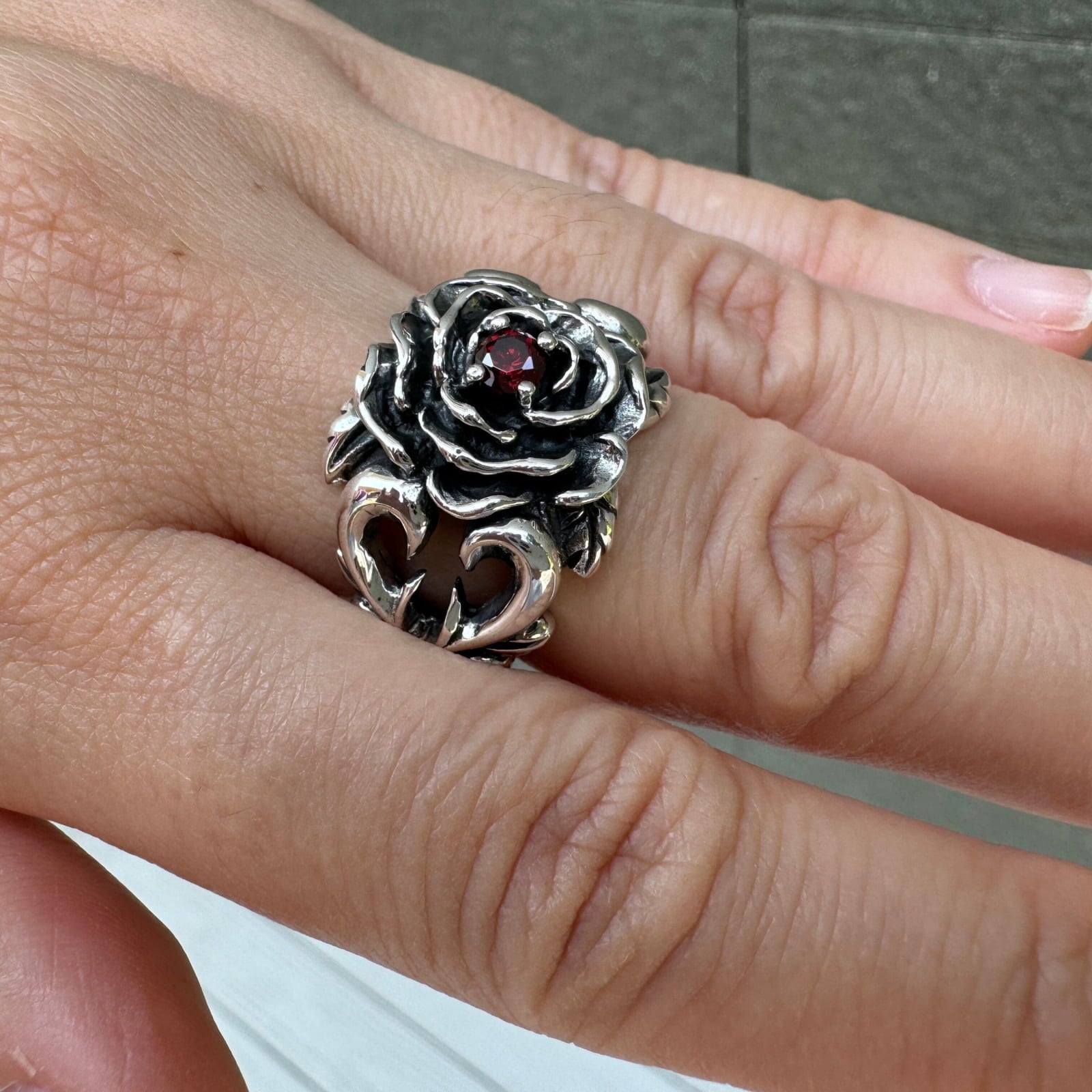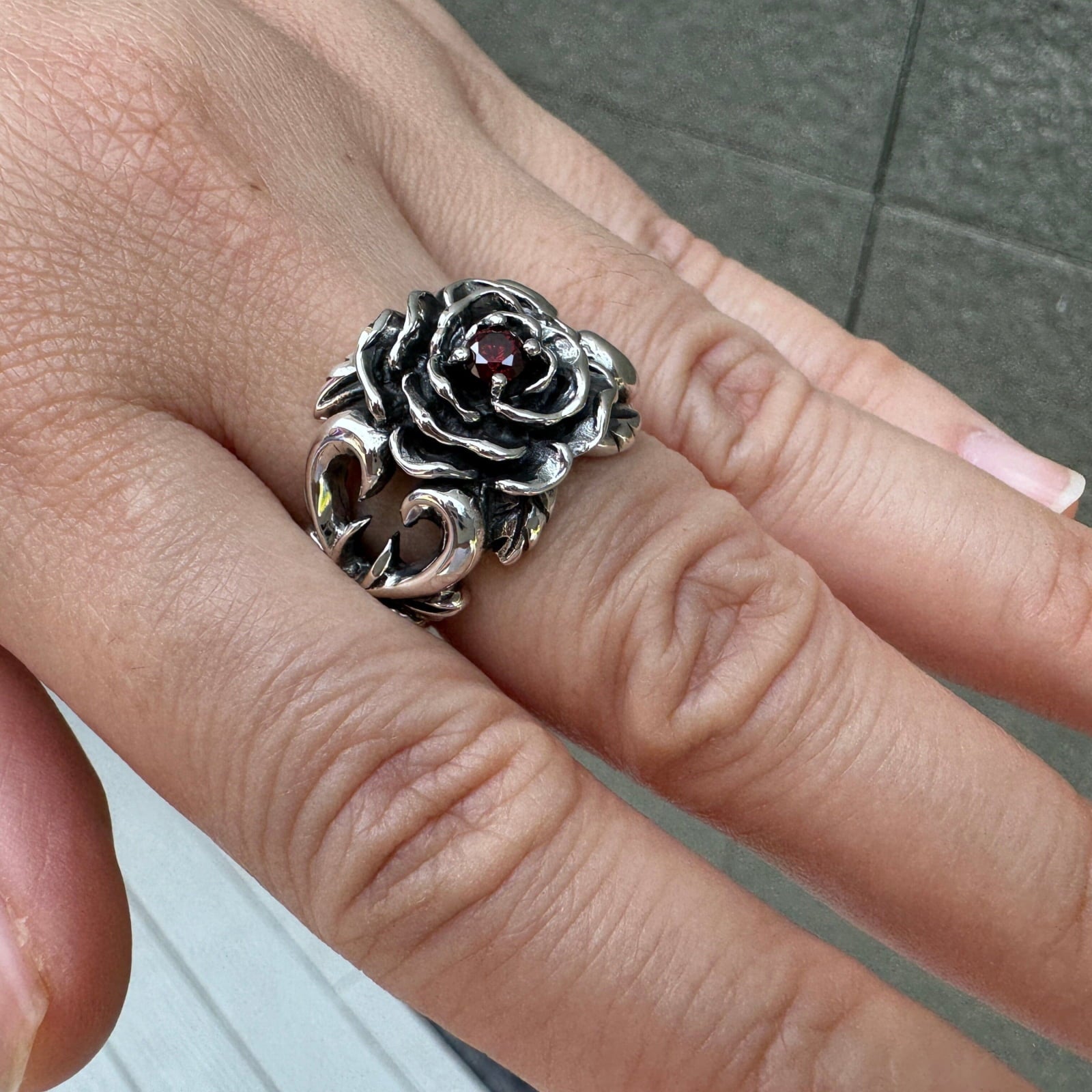 Q: Is the red stone in the ring a real garnet? A: Yes, absolutely. The centerpiece of this sterling silver rose ring is a genuine, high-quality red garnet. We use real gemstones to give the piece an authentic beauty and the deep, blood-red color that perfectly complements its dark romantic design.