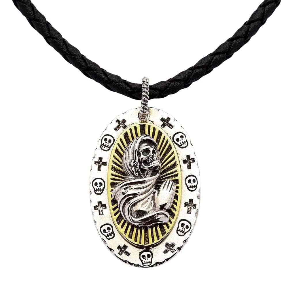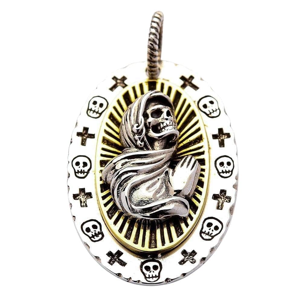 Invoke the powerful guardianship of the Holy Death with this stunning Santa Muerte pendant. Meticulously handcrafted from sterling silver and brass, this necklace is a profound statement of faith and a potent talisman for protection. It's a beautiful tribute to the beloved and powerful folk saint, designed for the devotee, the biker, and anyone who seeks a powerful and unconventional guardian on their life's journey.