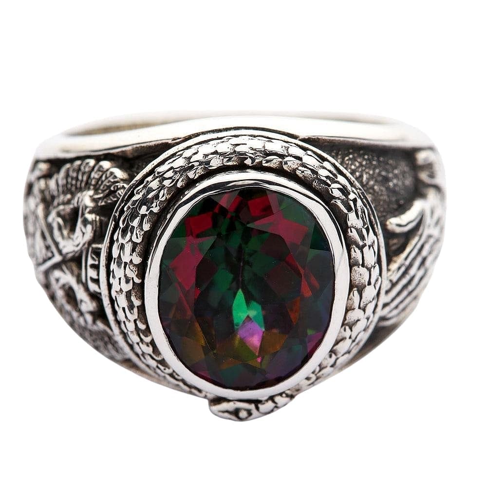 š Mesmerizing Mystic Topaz: Features a large, oval-cut genuine Mystic Topaz gemstone that flashes with a stunning iridescent rainbow of deep green, red, and purple hues as it catches the light.