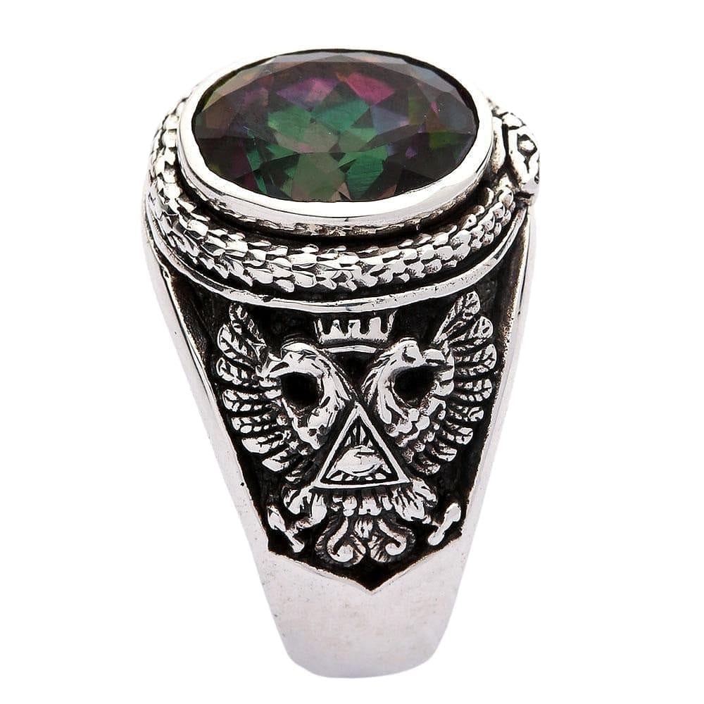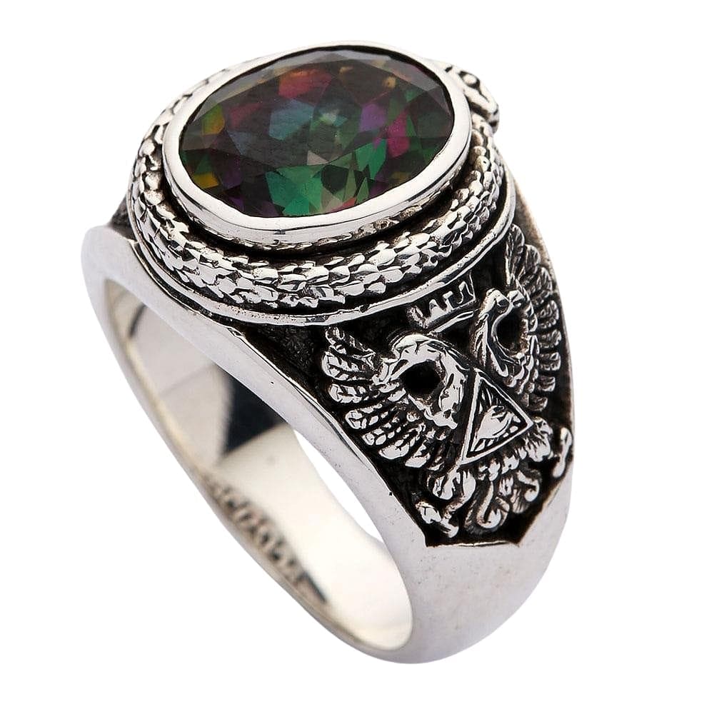 Wear a profound symbol of enlightenment and fraternal brotherhood with this magnificent Scottish Rite Masonic ring. This is more than a ring; it's a testament to a deep philosophical journey, masterfully crafted from solid .925 sterling silver. Centered with a mesmerizing Mystic Topaz gemstone, it is a powerful statement of wisdom and honor for the distinguished Mason and the seeker of light.