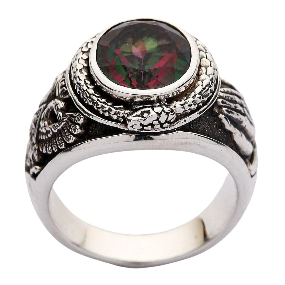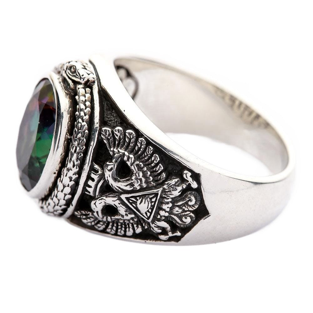 The stunning, color-shifting Mystic Topaz at the center represents enlightenment and hidden knowledge, and it is held within a unique bezel formed by a snake eating its tail (Ouroboros), the ancient symbol for eternity and rebirth. As a masterpiece of Masonic Jewelry, this is an heirloom-quality ring, built to be worn with pride by any brother of the craft.