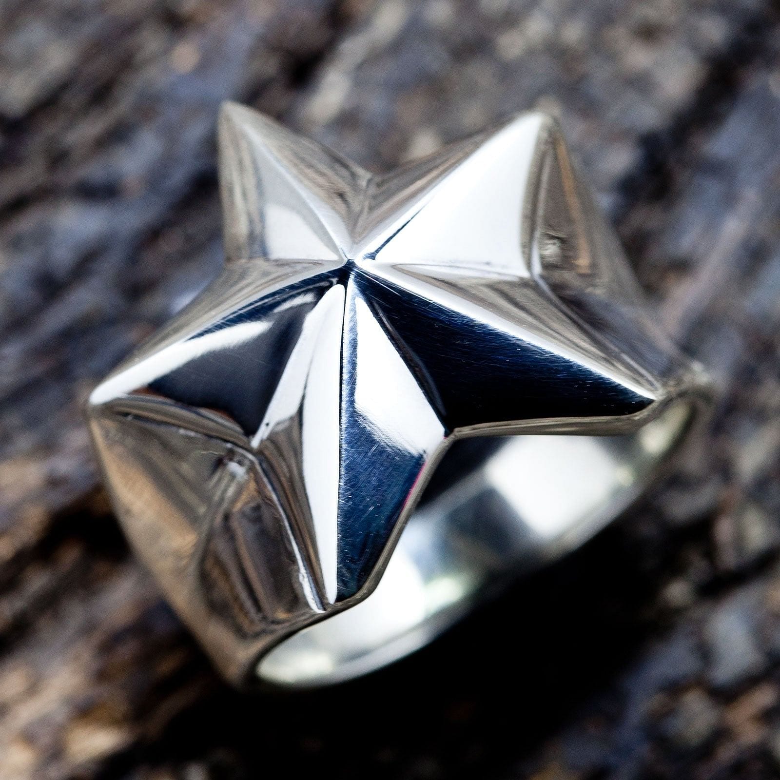Step into the spotlight and command the stage with our massive Men's Silver Star Ring. This isn't just an accessory; it's an emblem for the rockstar, a bold statement of ambition, and a tribute to the timeless rebel spirit. Forged from a solid block of sterling silver, its sharp lines and brilliant shine are designed to be seen.
