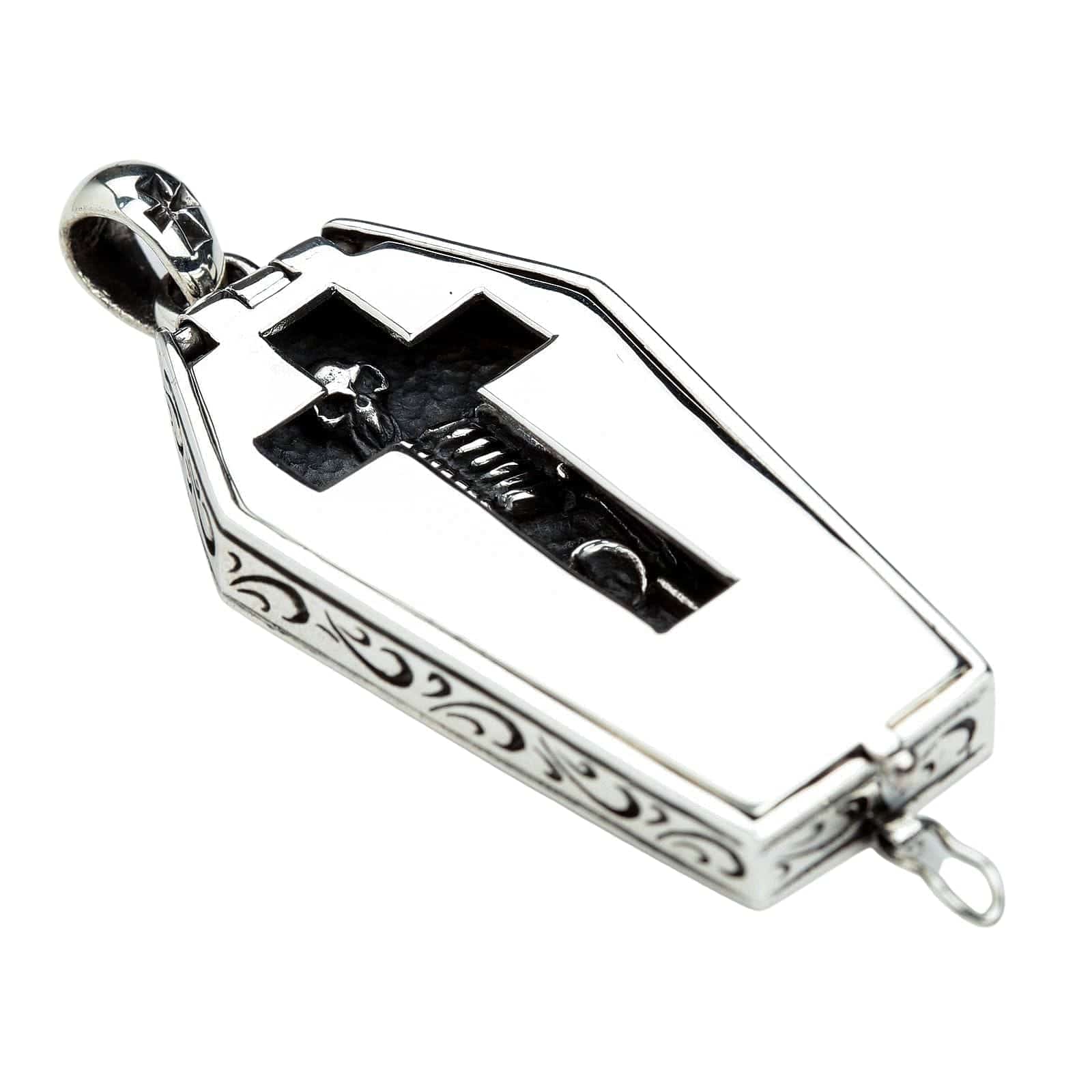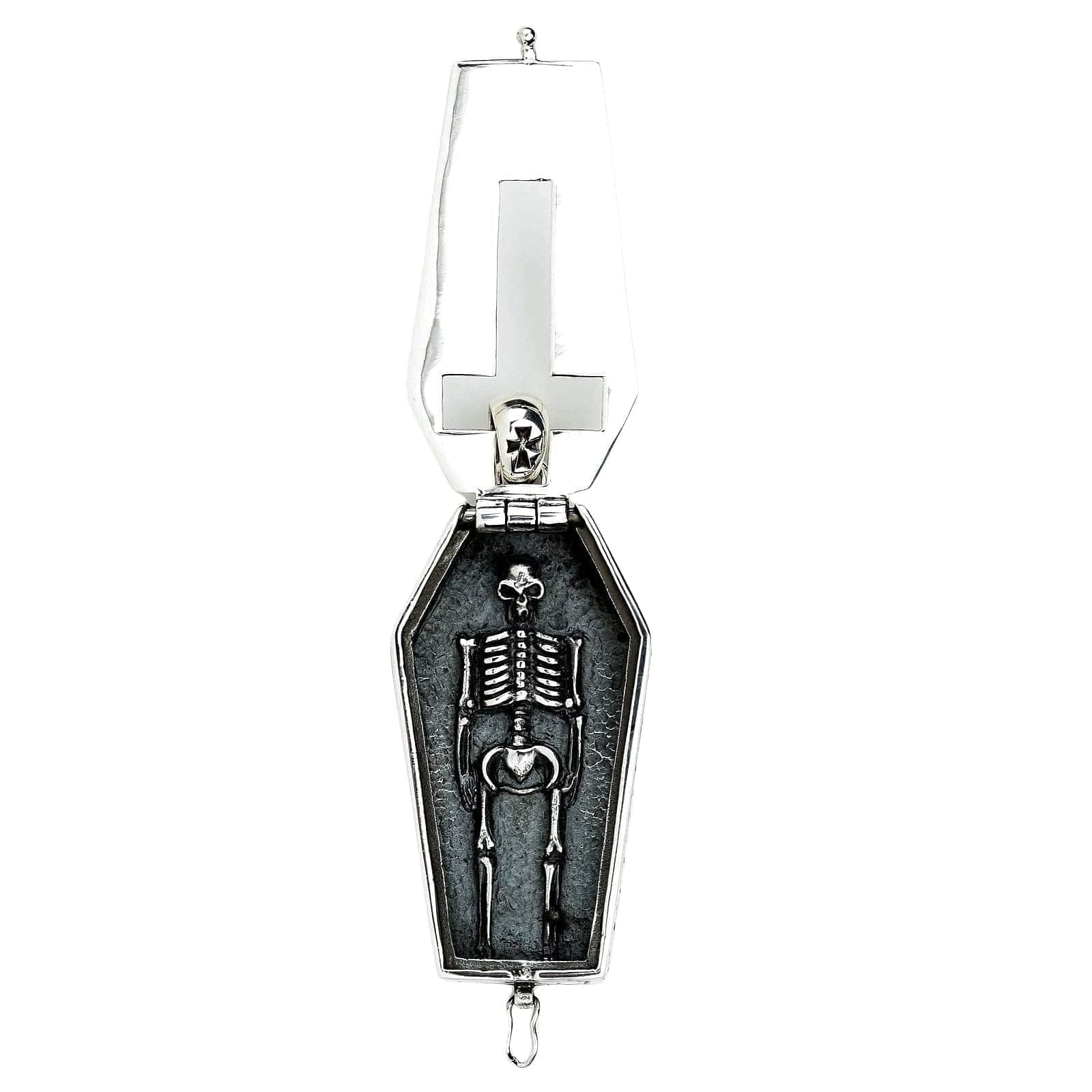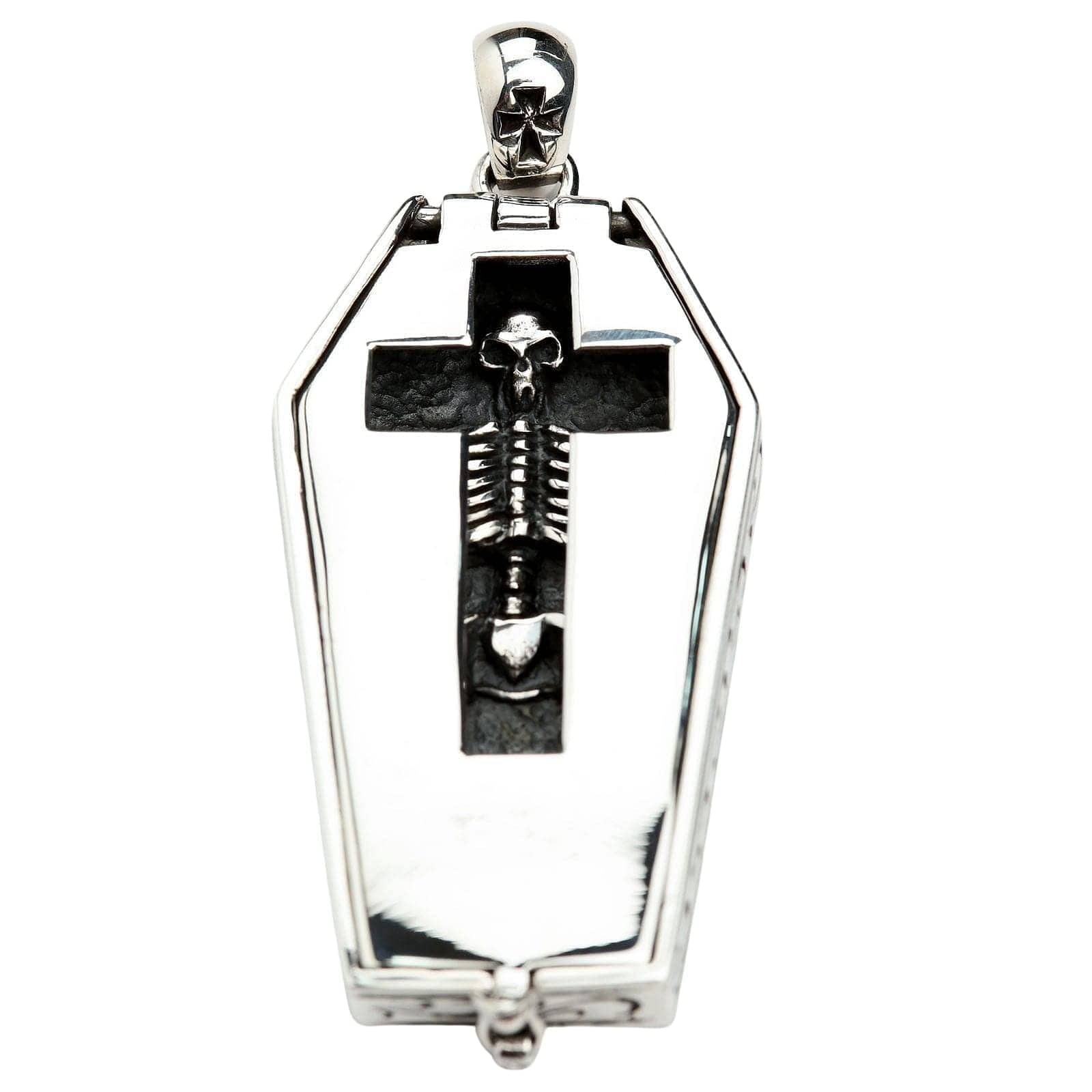 Unveil the darker side of style with the skeleton coffin pendant, a bold piece of goth jewelry handcrafted from premium .925 sterling silver. Designed in the shape of a coffin with a cross-cut lid, this pendant features a hinged opening that reveals an intricately detailed skeleton inside—just like a gothic locket. With substantial weight, impressive size, and meticulous craftsmanship, it’s the perfect sterling silver coffin pendant for those who embrace gothic elegance with an edge.