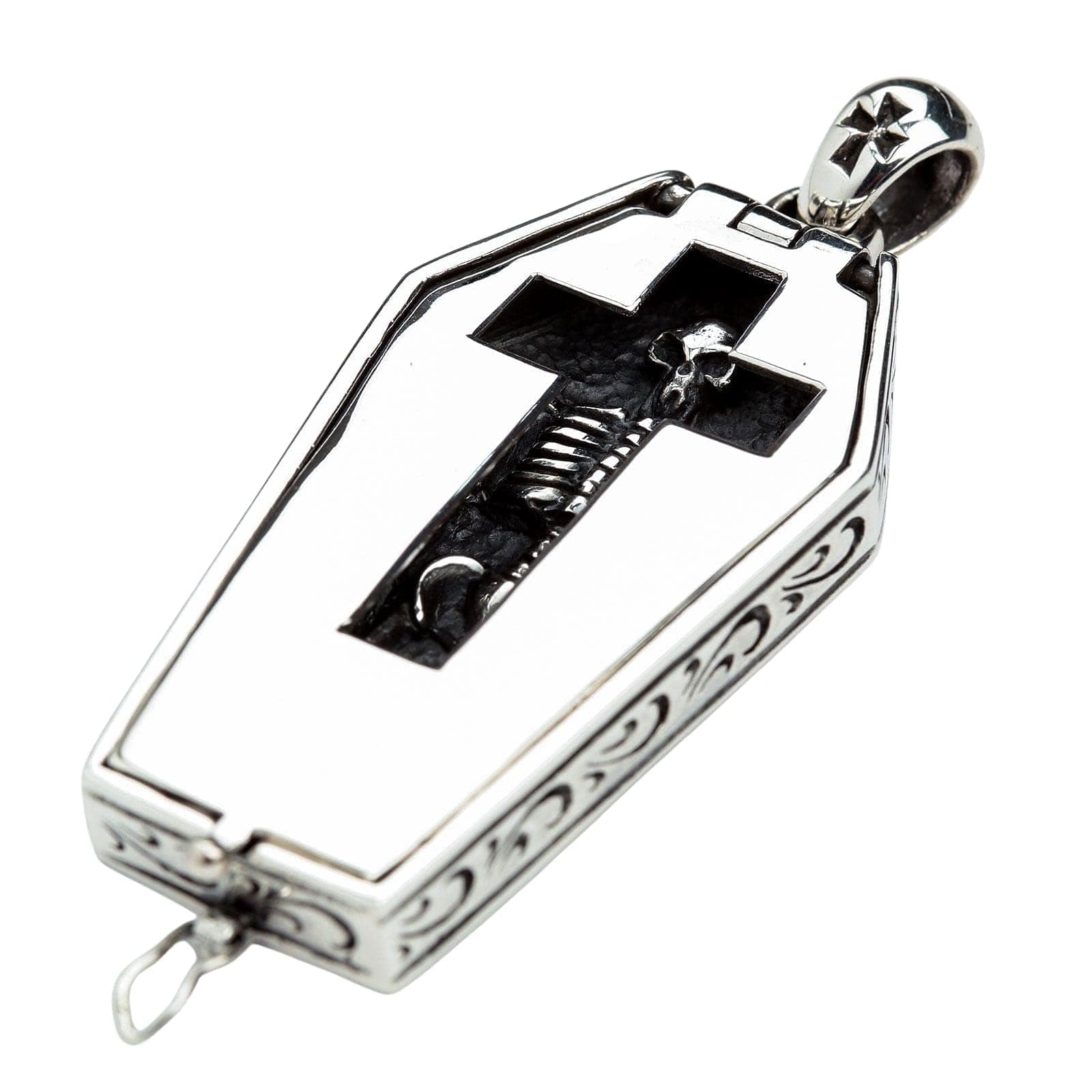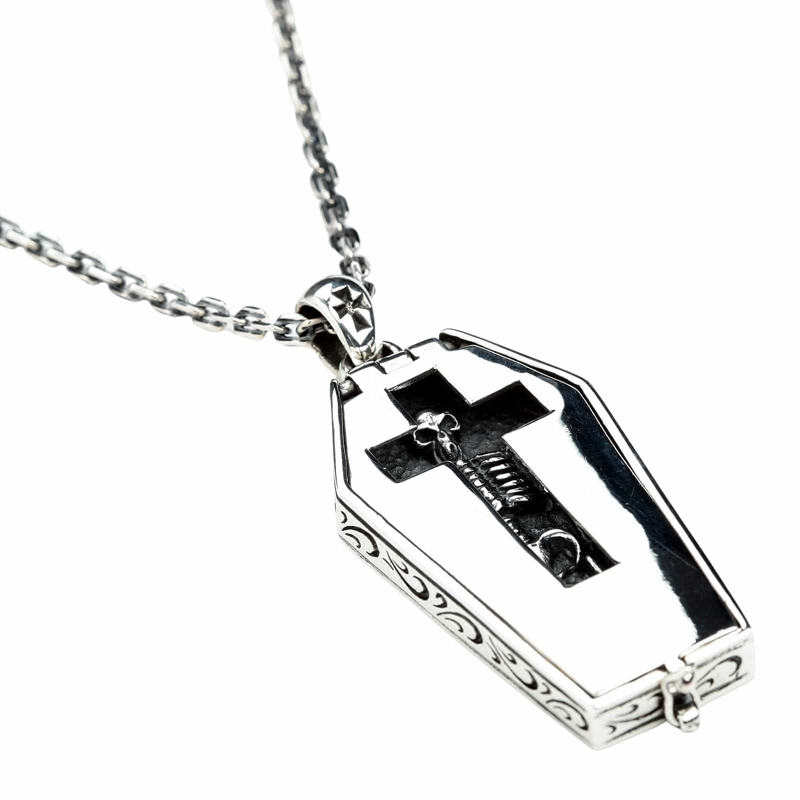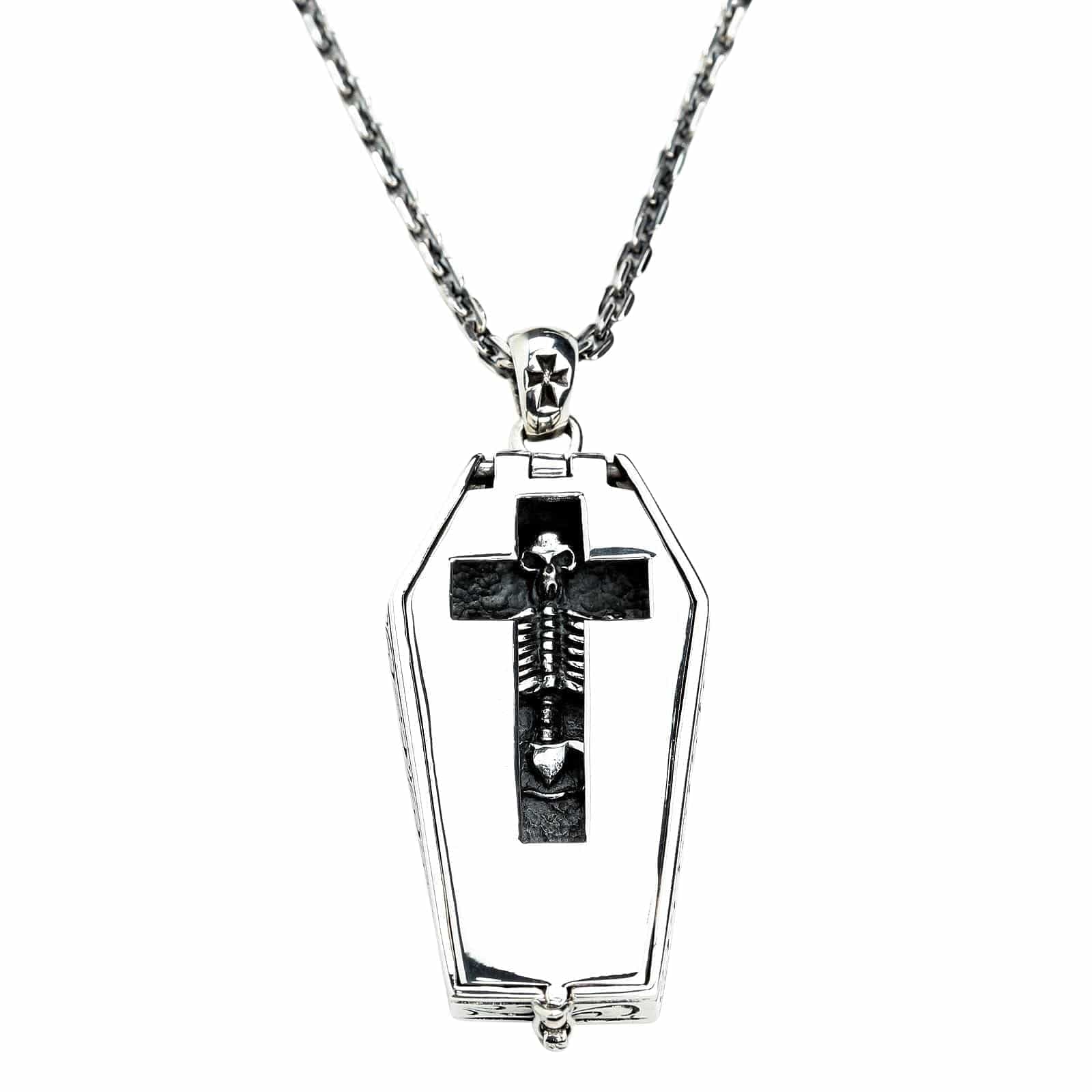 Unveil the darker side of style with the skeleton coffin pendant, a bold piece of goth jewelry handcrafted from premium .925 sterling silver. Designed in the shape of a coffin with a cross-cut lid, this pendant features a hinged opening that reveals an intricately detailed skeleton inside—just like a gothic locket. With substantial weight, impressive size, and meticulous craftsmanship, it’s the perfect sterling silver coffin pendant for those who embrace gothic elegance with an edge.