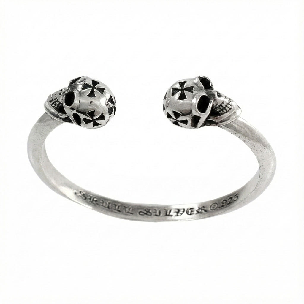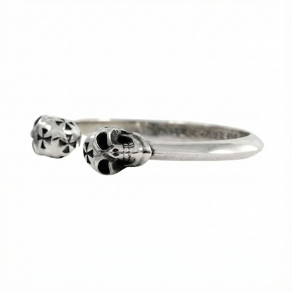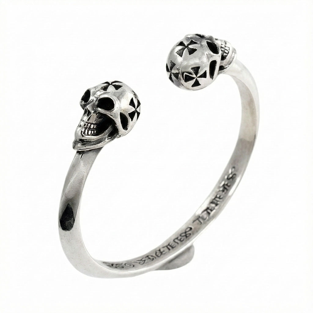 Confront mortality with style. Our Skull Cross Sterling Silver Men's Biker Cuff is a bold testament to the rebel spirit. Designed for those who live life on their own terms, this piece features two menacing skulls facing off at the opening of the cuff. Each skull is branded with a distinct Cross motif on the forehead—a symbol that can represent faith, protection, or the iron cross of biker heritage.