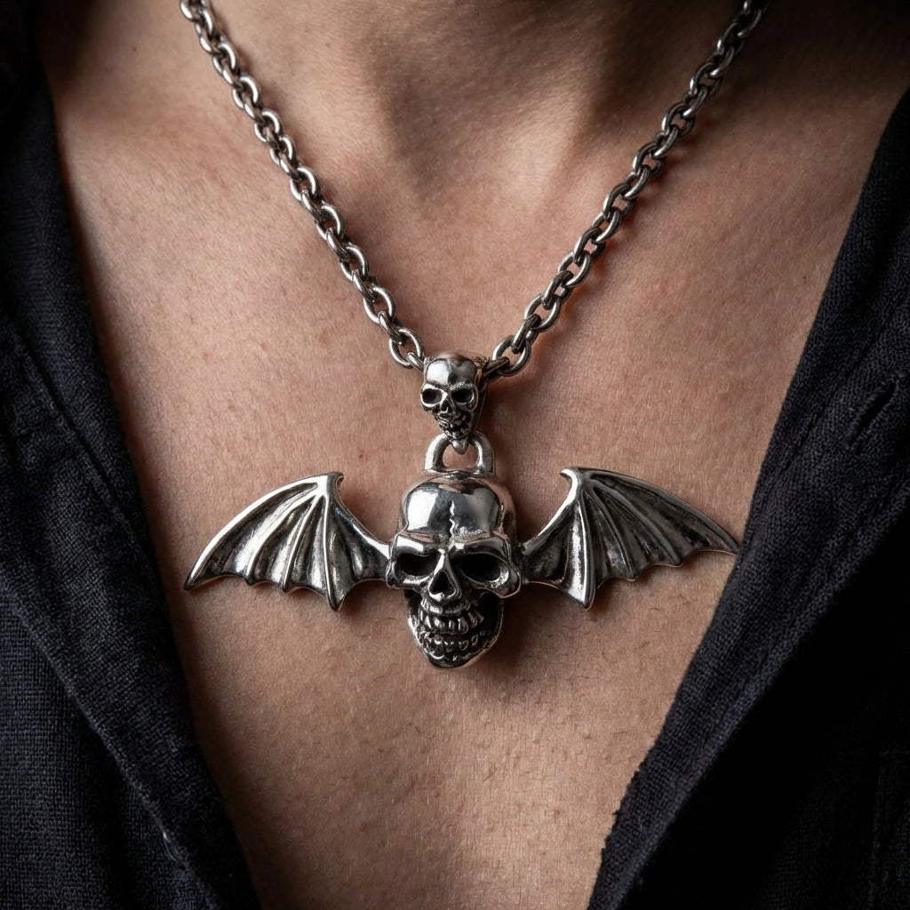 If you collect skull pendants and want variety in shape — Most skull pendants are round or vertical. This one spreads horizontally because of the wing span. The double skull detail — one main, one on the bail — adds a design layer you don't see on single-element skull pieces.