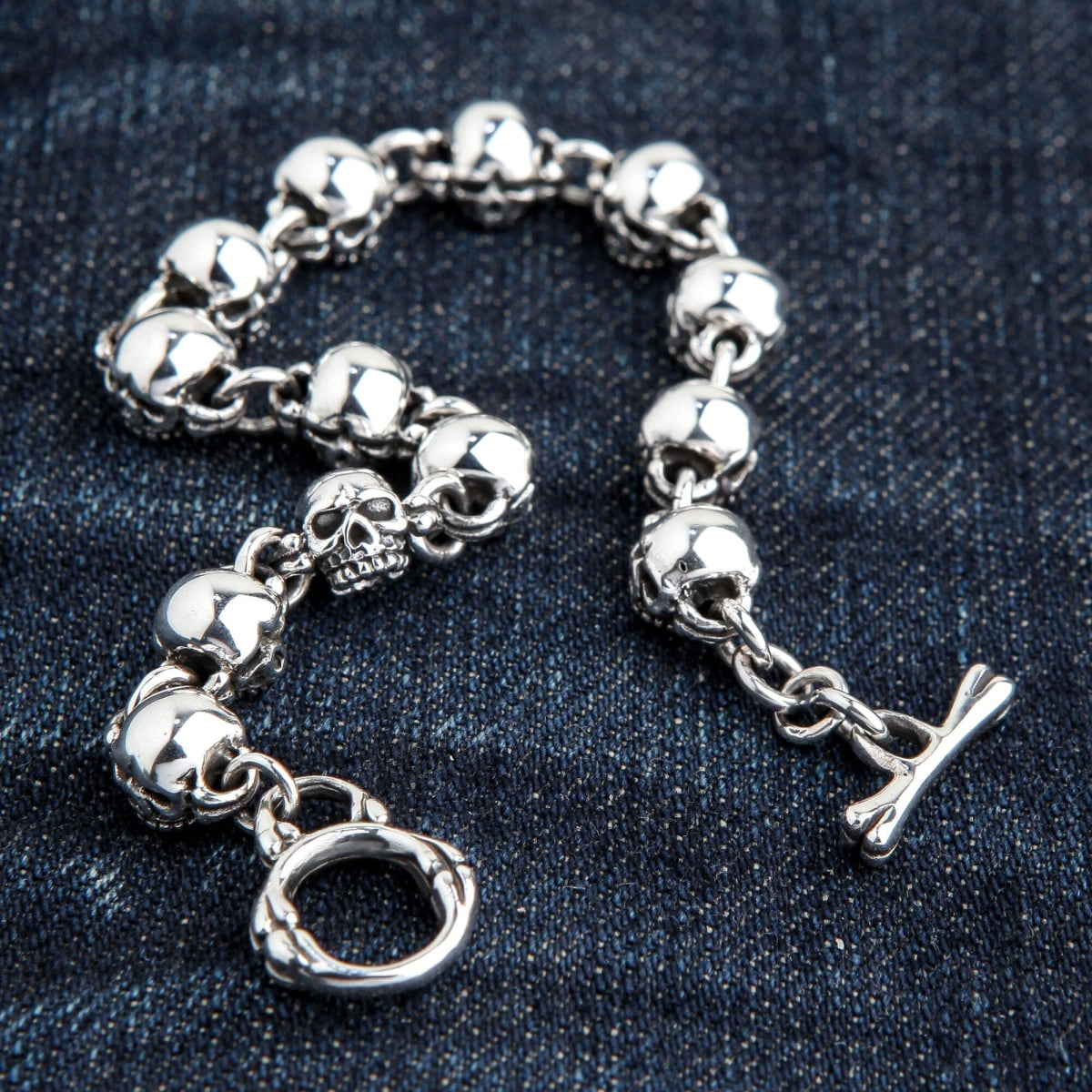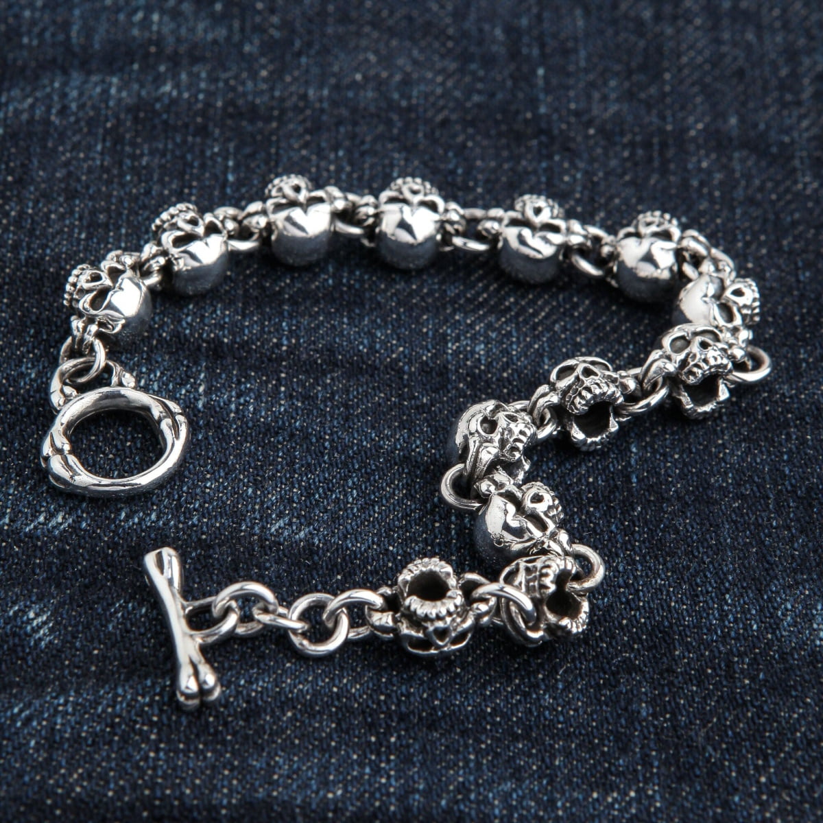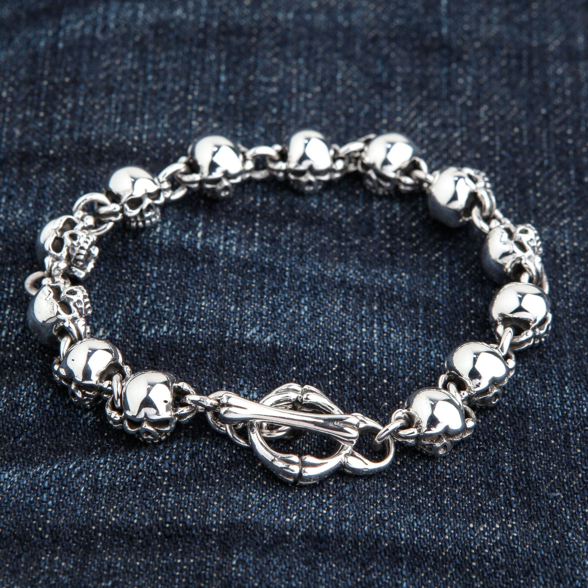 The genius of this bracelet lies in its unique construction. The entire chain is meticulously assembled from a series of individual, three-dimensional small skulls, each one glaring with a dark, rebellious energy. This creates an unparalleled texture and a continuous, powerful statement of the macabre. The bracelet is secured with an equally thematic bone-shaped T-bar clasp that passes through a sturdy O-ring, ensuring a secure fit. This endless chain of skulls is a potent memento mori, a symbol of fearlessness in the face of fate. Weighing a substantial 48 grams, this solid silver masterpiece has the authoritative presence to match its powerful symbolism.