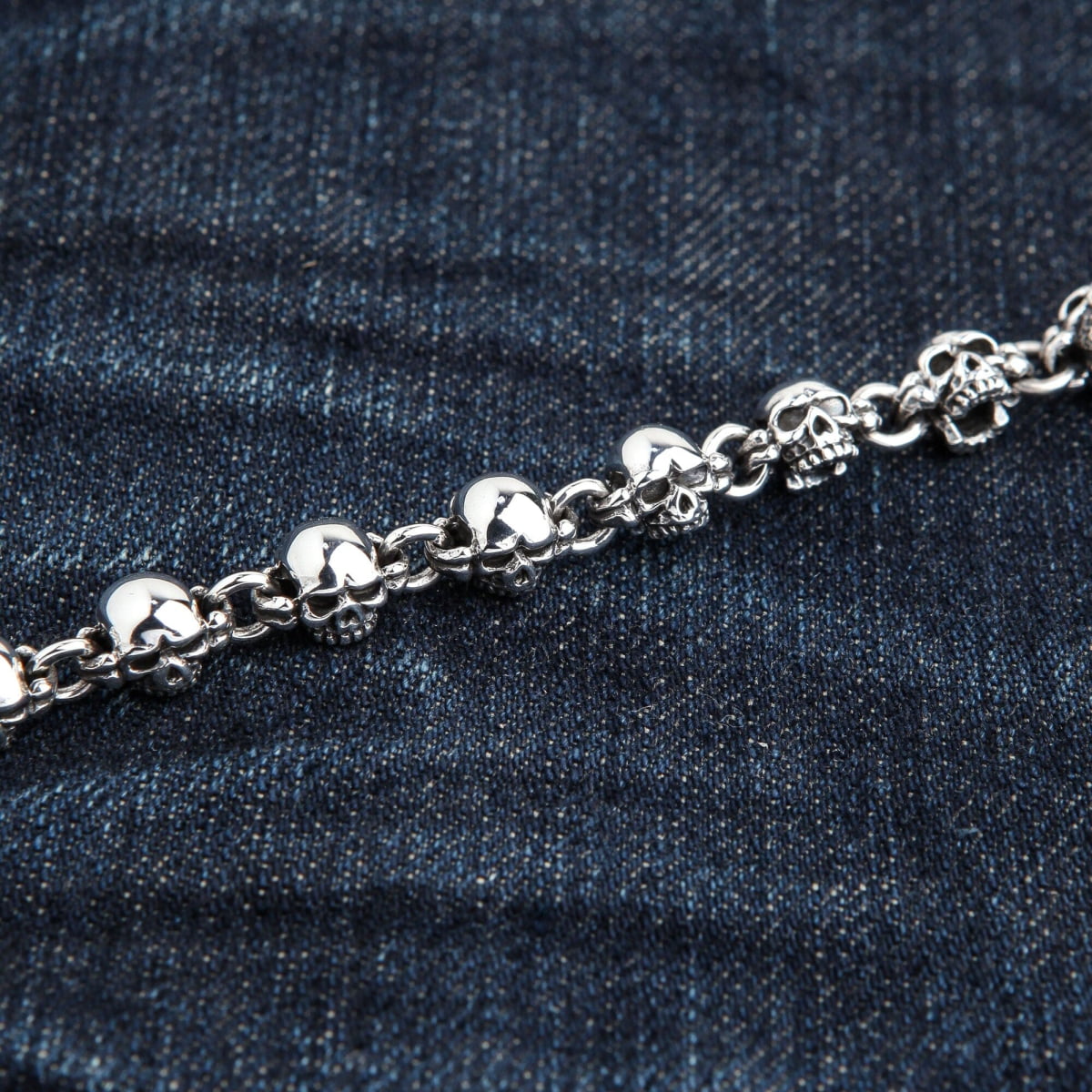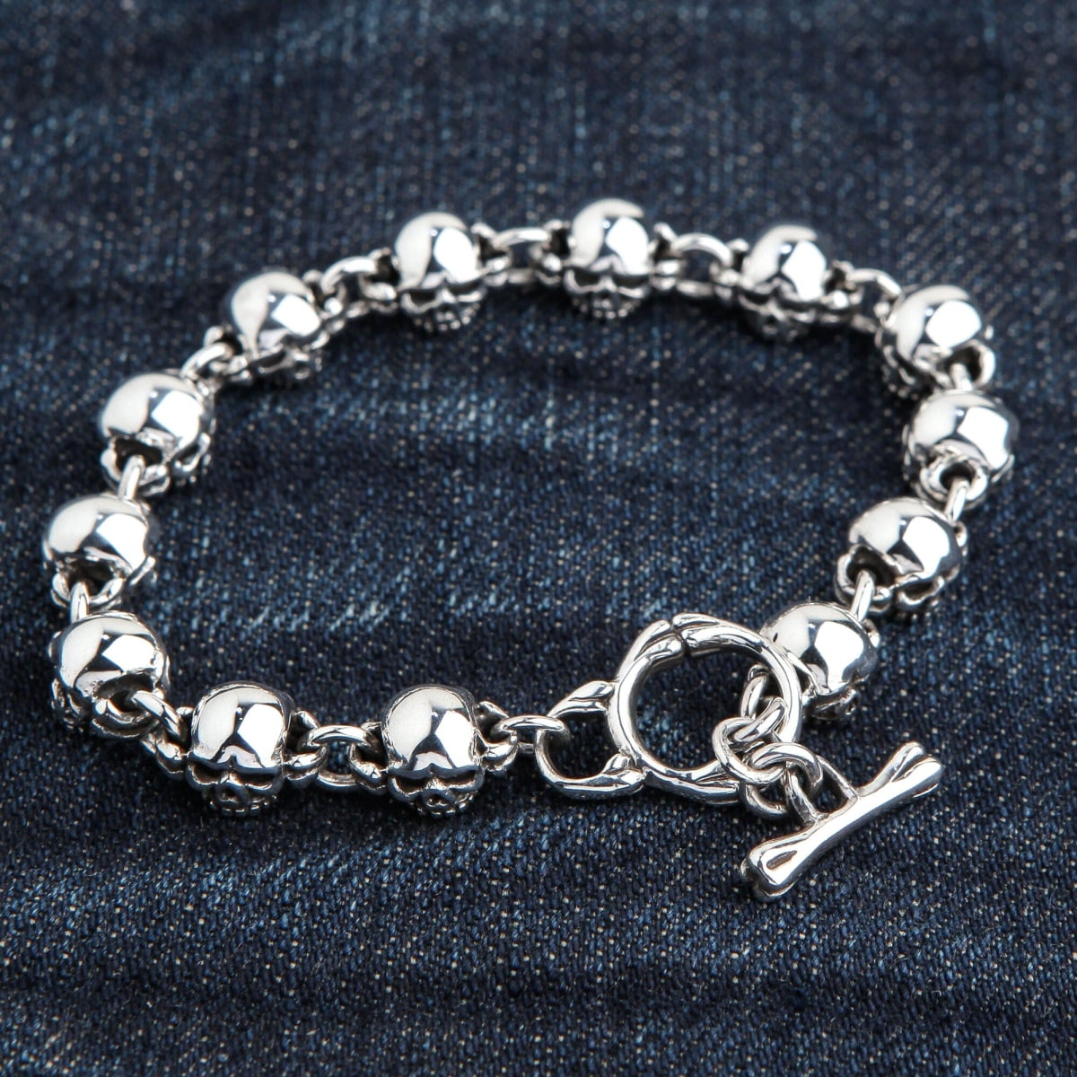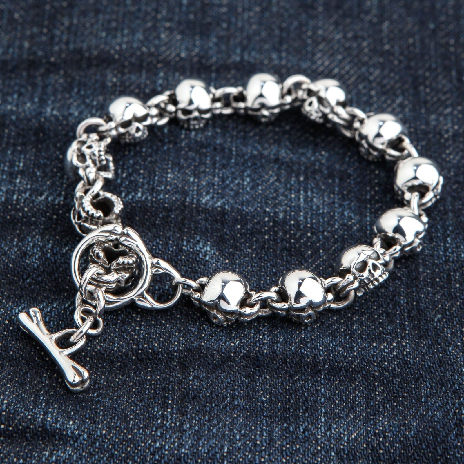 The genius of this bracelet lies in its unique construction. The entire chain is meticulously assembled from a series of individual, three-dimensional small skulls, each one glaring with a dark, rebellious energy. This creates an unparalleled texture and a continuous, powerful statement of the macabre. The bracelet is secured with an equally thematic bone-shaped T-bar clasp that passes through a sturdy O-ring, ensuring a secure fit. This endless chain of skulls is a potent memento mori, a symbol of fearlessness in the face of fate. Weighing a substantial 48 grams, this solid silver masterpiece has the authoritative presence to match its powerful symbolism.