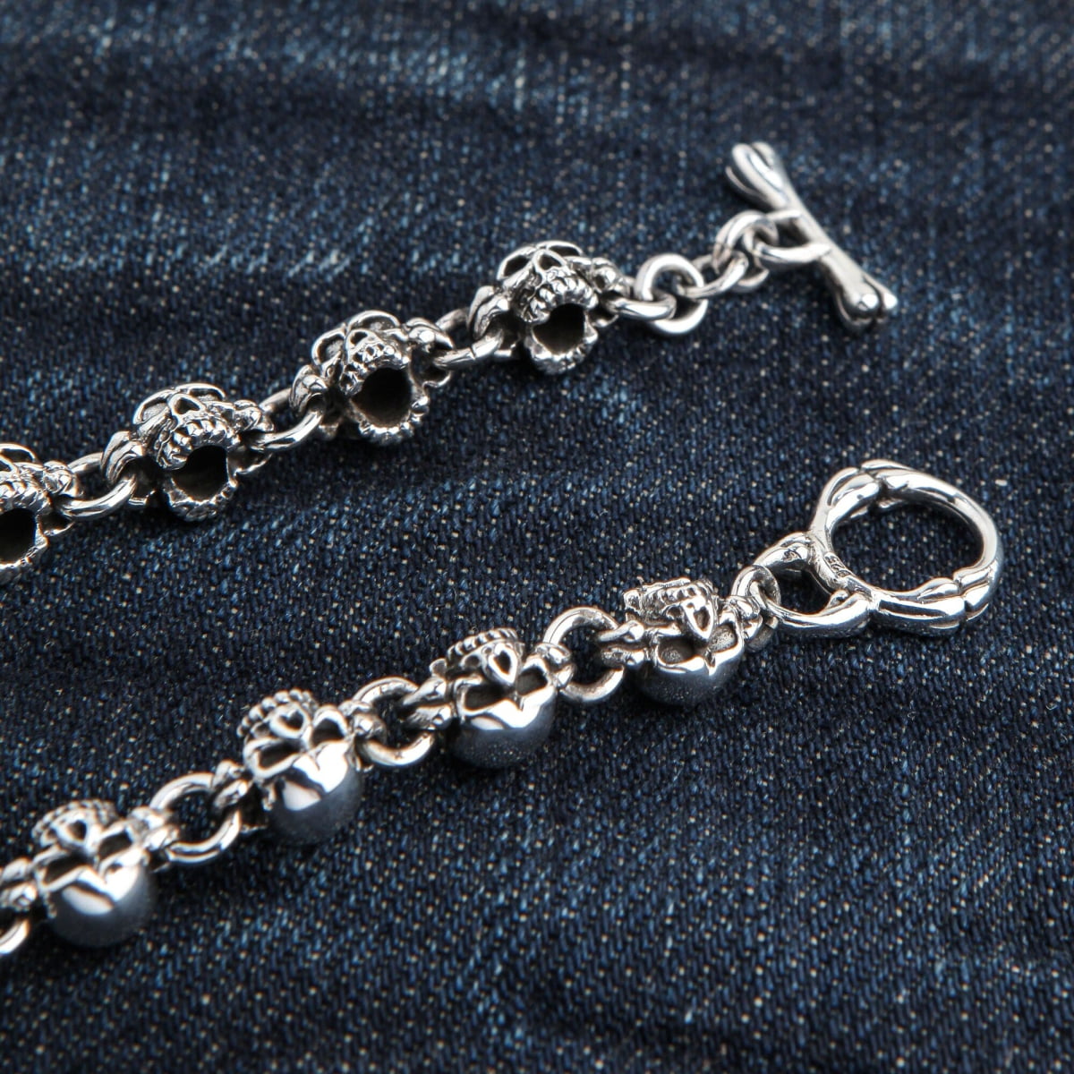 2. Is this a solid, substantial bracelet? Yes, absolutely. Despite being made of 'small skulls,' the bracelet has a total weight of approximately 48 grams. It is a very solid and substantial piece, designed for those who appreciate the powerful feel of high-quality statement jewelry.