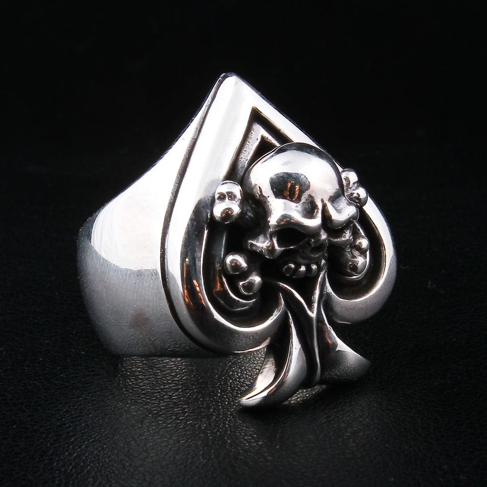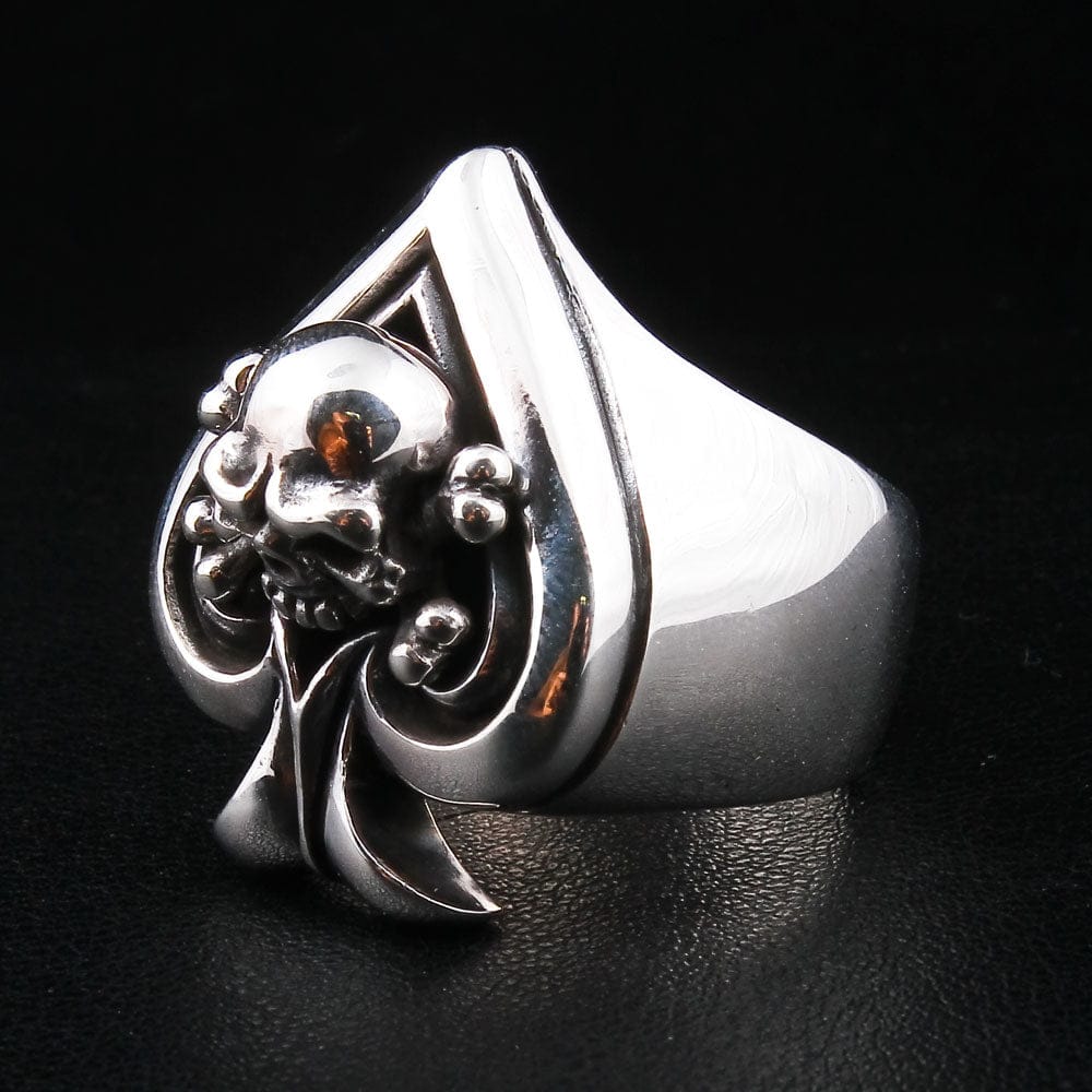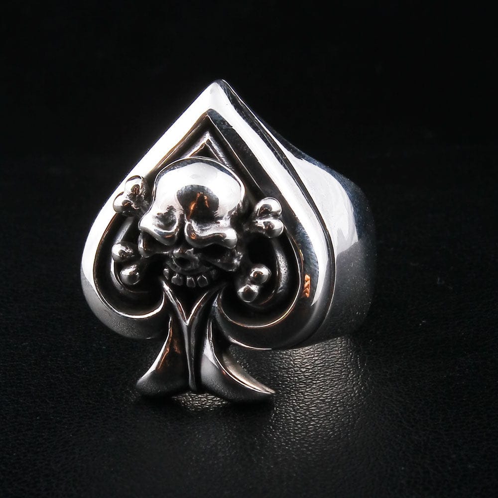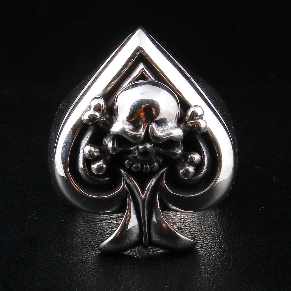 The Ace of Spades has a legendary reputation. Known as the 'death card,' it has been a symbol of both fortune and finality for centuries. Famously adopted by the iconic rock band Motörhead and its legendary frontman Lemmy Kilmister, it has become a permanent fixture in biker and heavy metal culture. At the heart of the spade sits the menacing skull and crossbones—the classic Jolly Roger—amplifying the ring's message of danger and defiance.