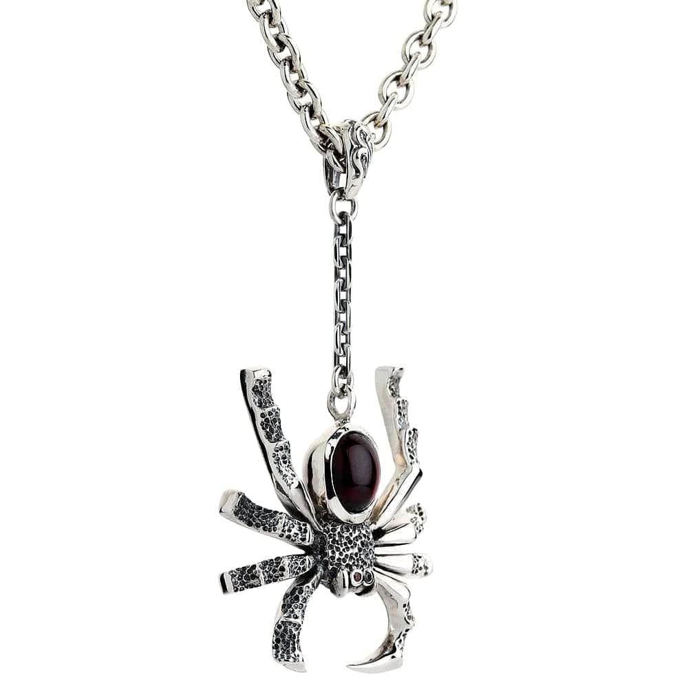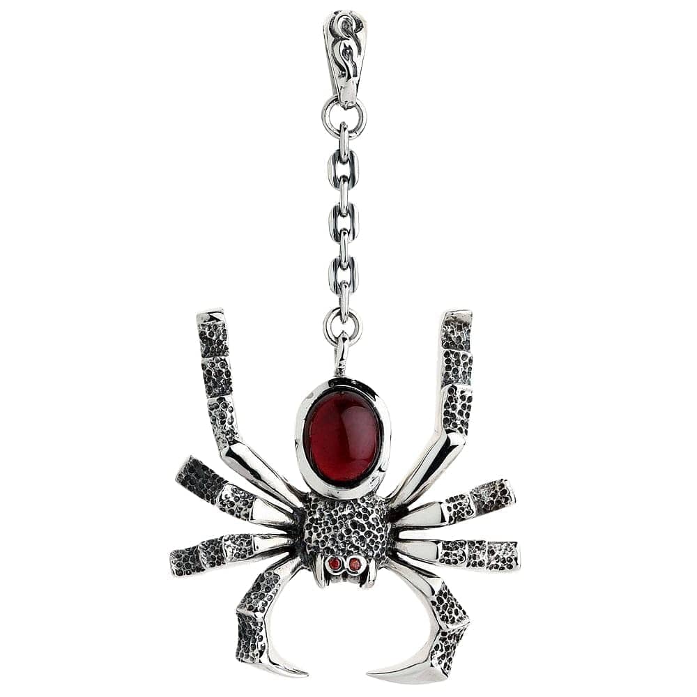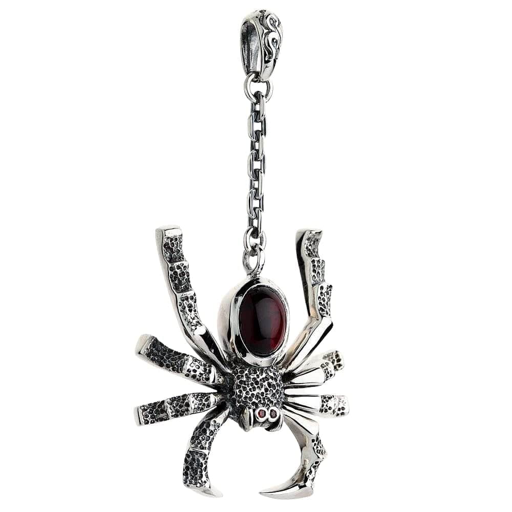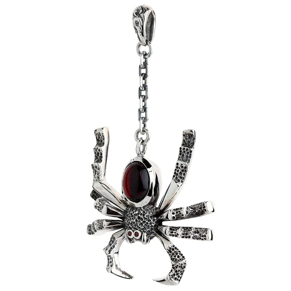 The genius of this piece lies in its dynamic, dangling design. The formidable spider doesn't sit static; it hangs from a short, sturdy chain, allowing it to move and catch the light with a startlingly lifelike quality. The body of this magnificent arachnid is a massive, smooth cabochon of genuine red garnet, its deep, blood-red hue suggesting a creature flush with vital energy. Smaller garnets are set for its eyes, giving it a piercing gaze. Its eight legs are rendered with a rugged, textured finish, contrasting with its wickedly sharp, polished mandibles. Weighing a substantial 27 grams, this solid silver masterpiece is a tribute to the ultimate creator and predator—the patient weaver of fate.
