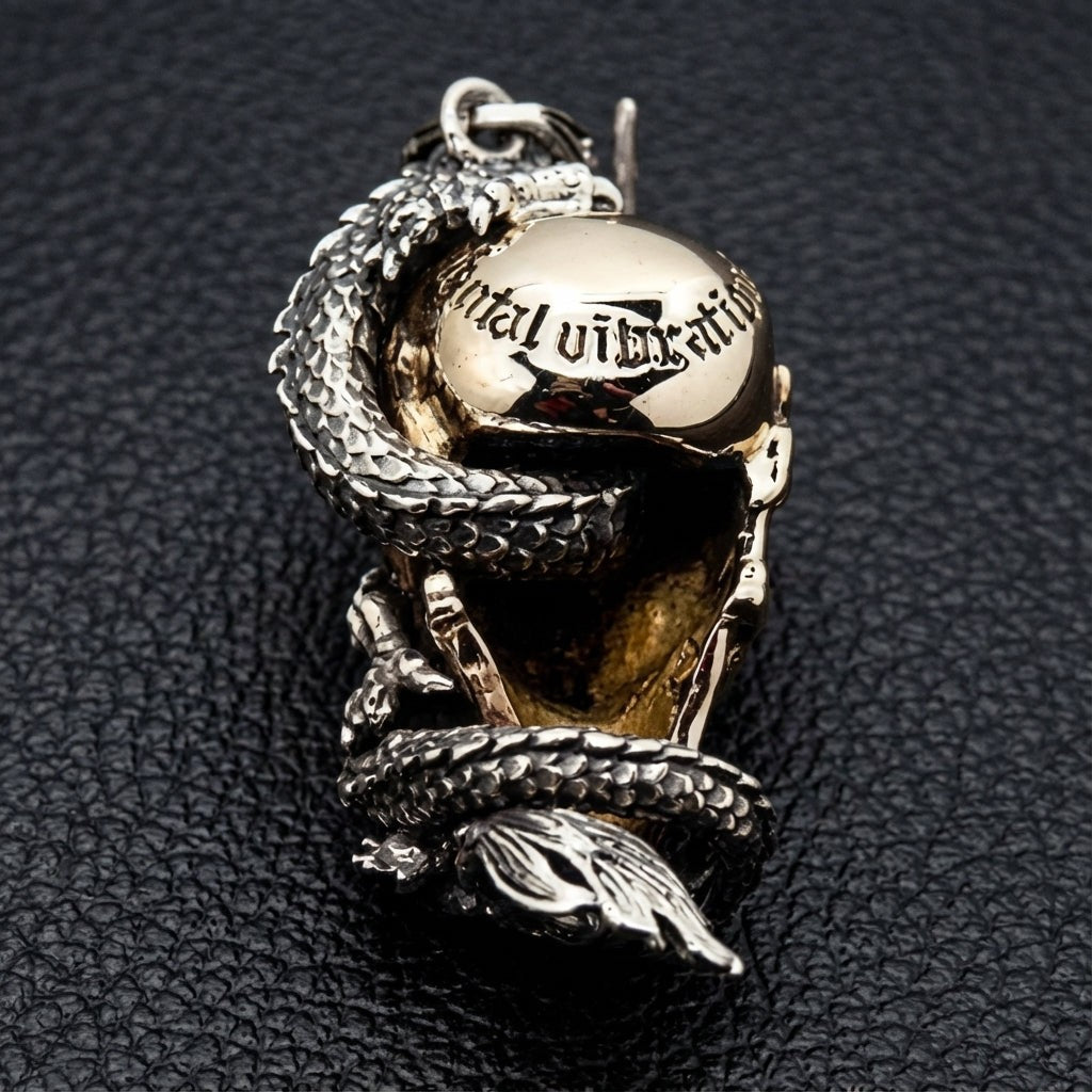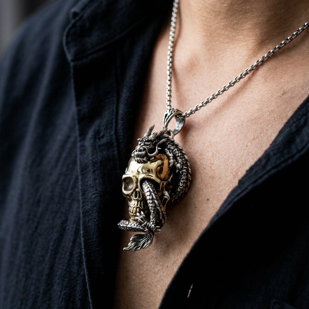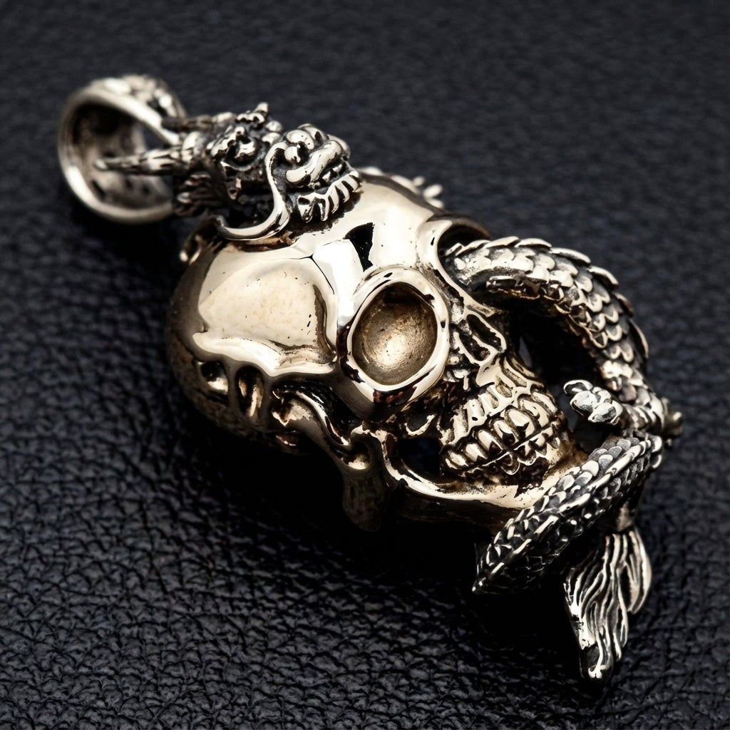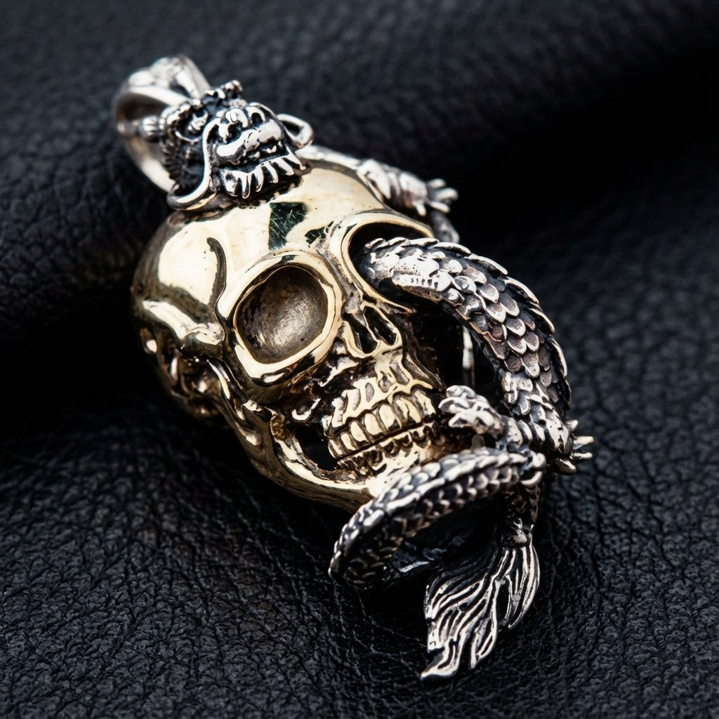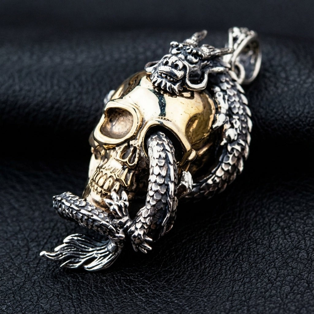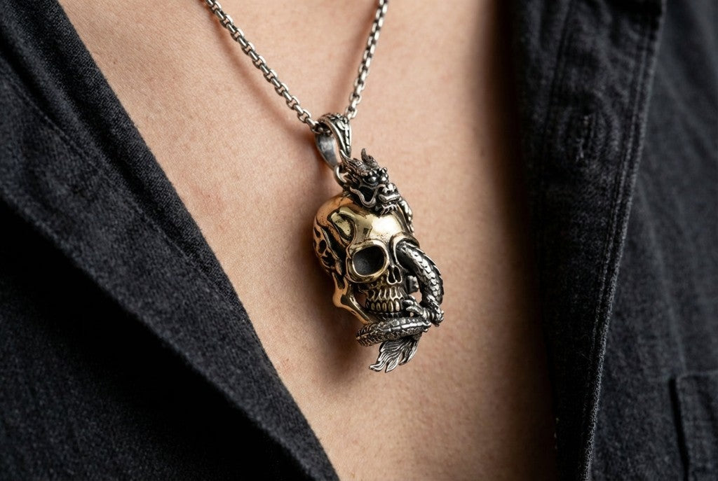 Designed for people who prefer jewelry with personality, this pendant blends dark symbolism and craftsmanship in one piece. The dragon’s scaled body curves around the skull, creating depth and contrast that stands out whether you wear it with a simple chain, a biker necklace, or layered streetwear styling. The warm tone of brass against cool sterling silver gives it that unmistakable two-tone finish collectors look for in skull jewelry.