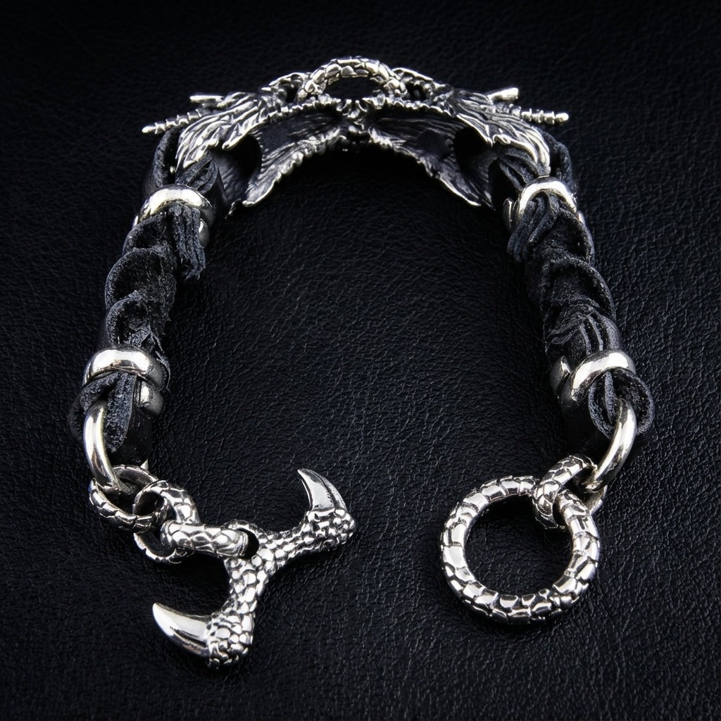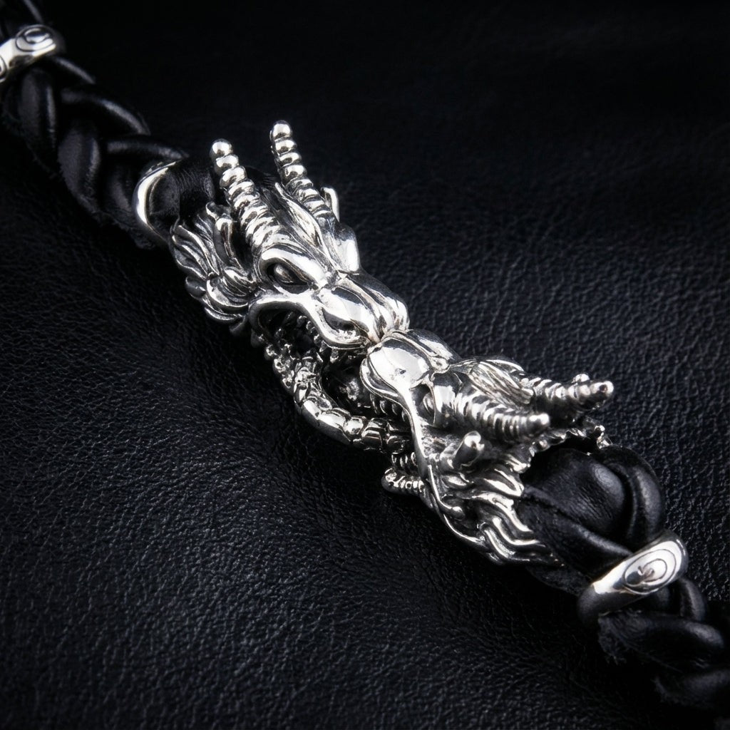 Sterling Silver Dual Dragon Head Braided Leather Bracelet for Men