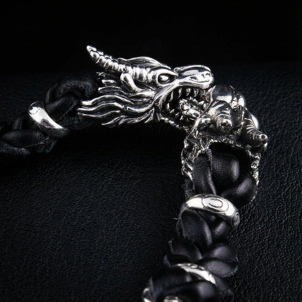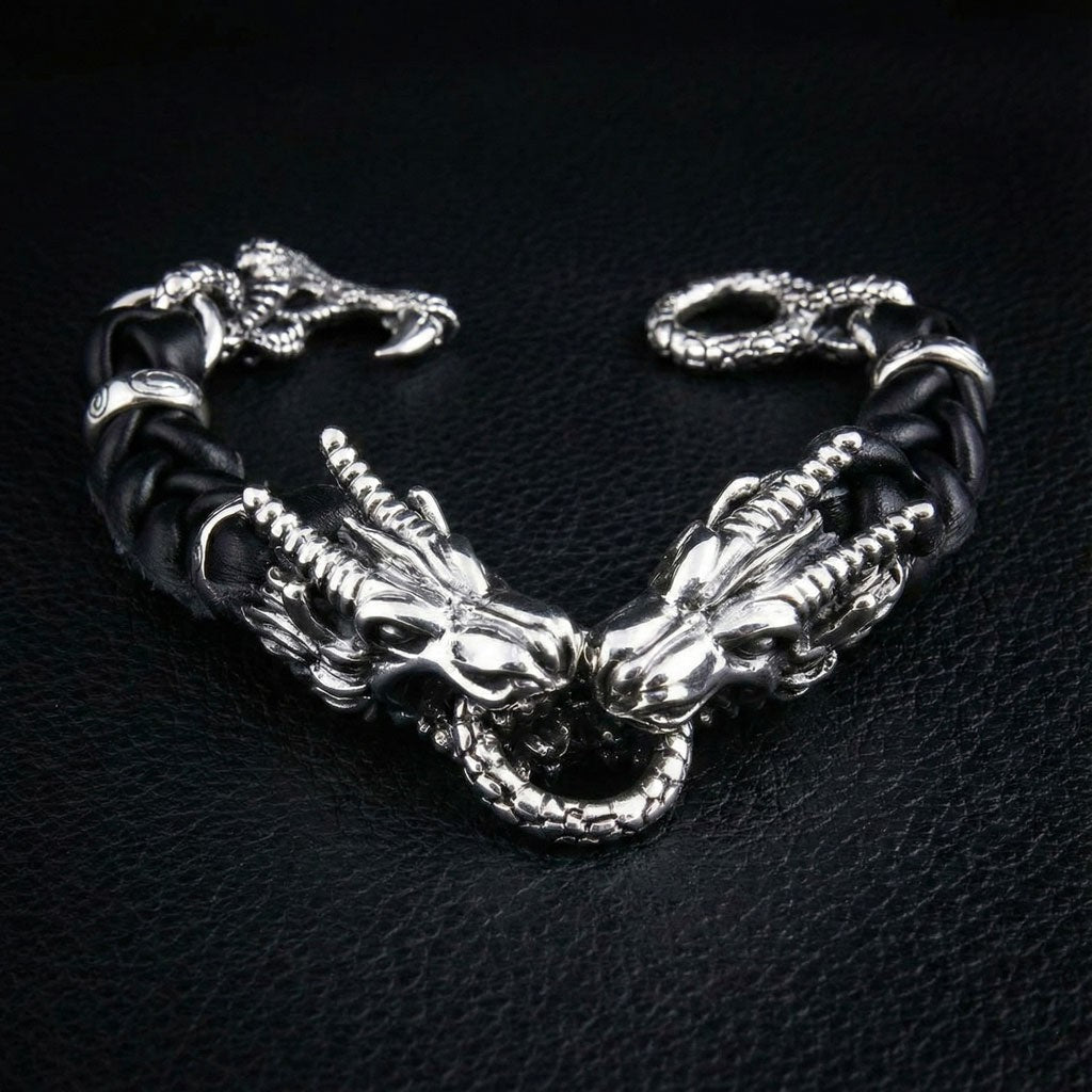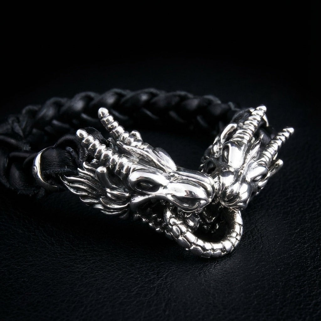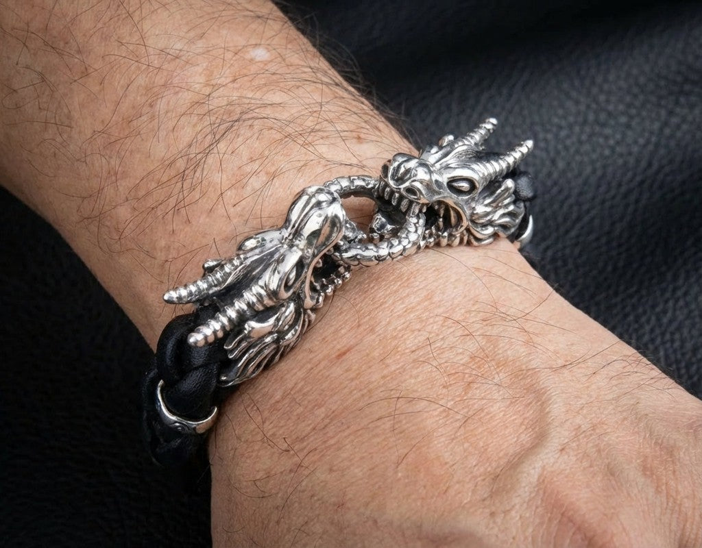 Command attention with this extraordinary sterling silver dragon bracelet that masterfully combines ancient mythological symbolism with modern craftsmanship. This men's leather dragon bracelet features two magnificently detailed dragon heads meeting at the center, their fierce expressions and intricate scales capturing the legendary power these creatures represent. Whether you're drawn to Norse mythology, Asian dragon symbolism, or simply appreciate bold masculine jewelry, this handcrafted silver bracelet delivers an unmistakable statement piece.