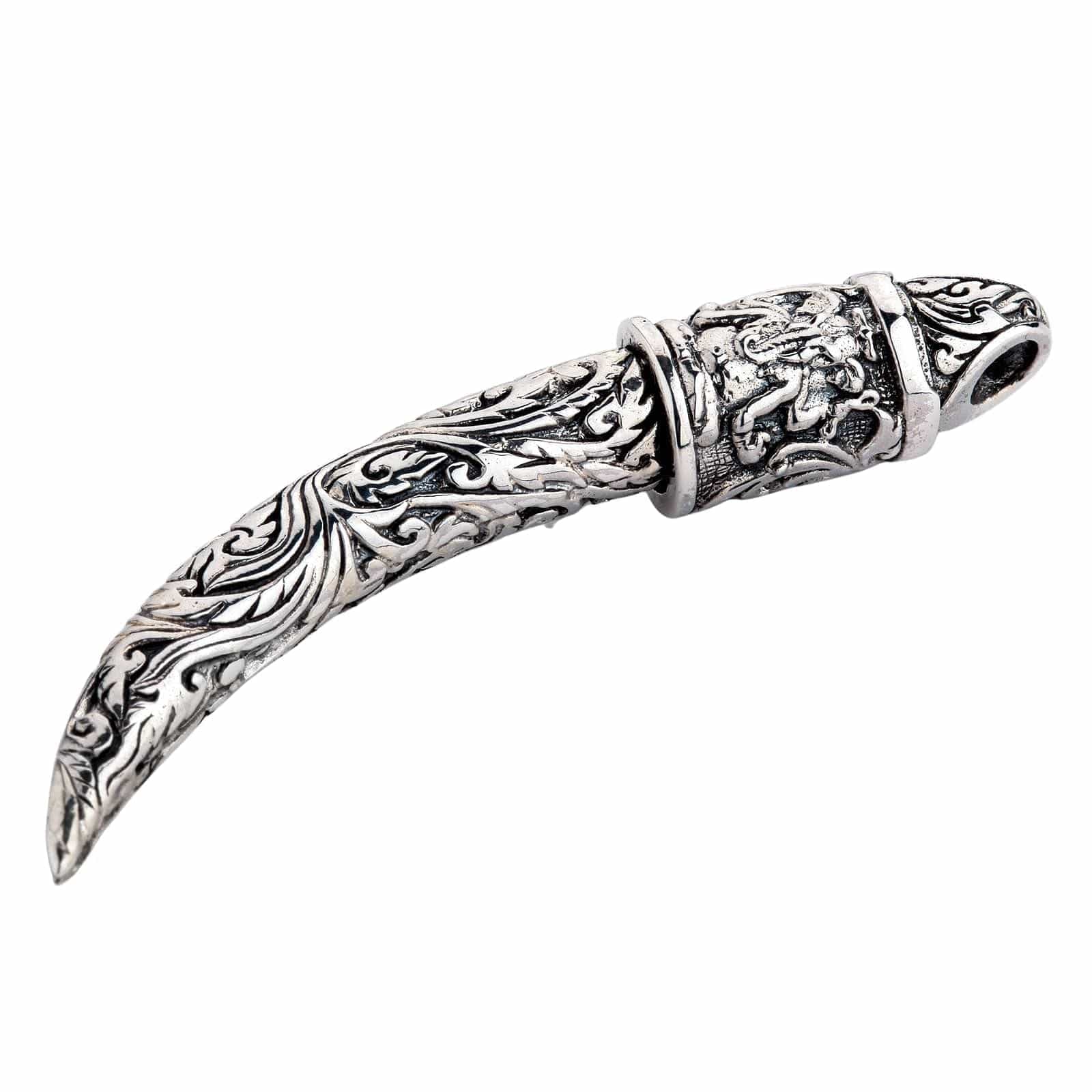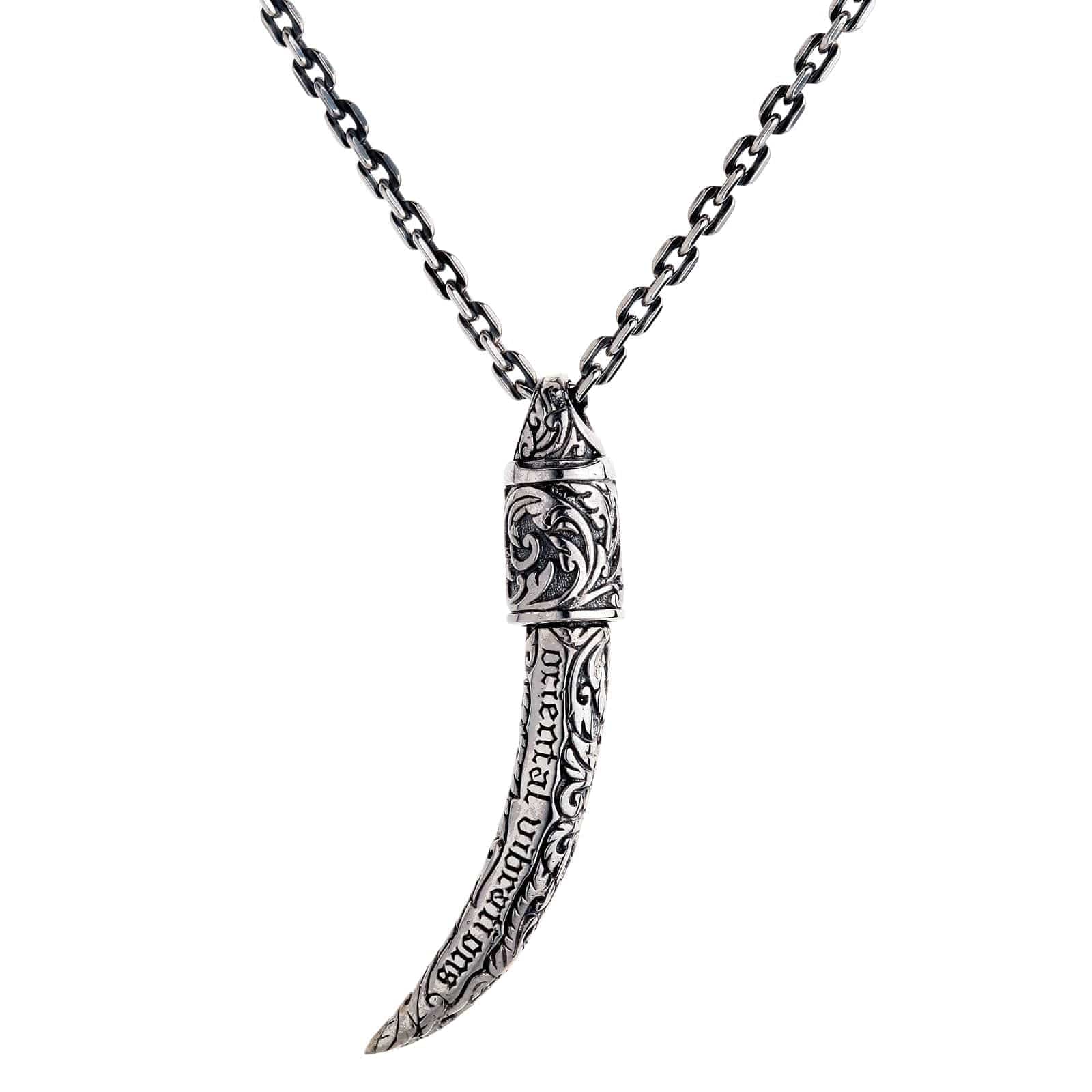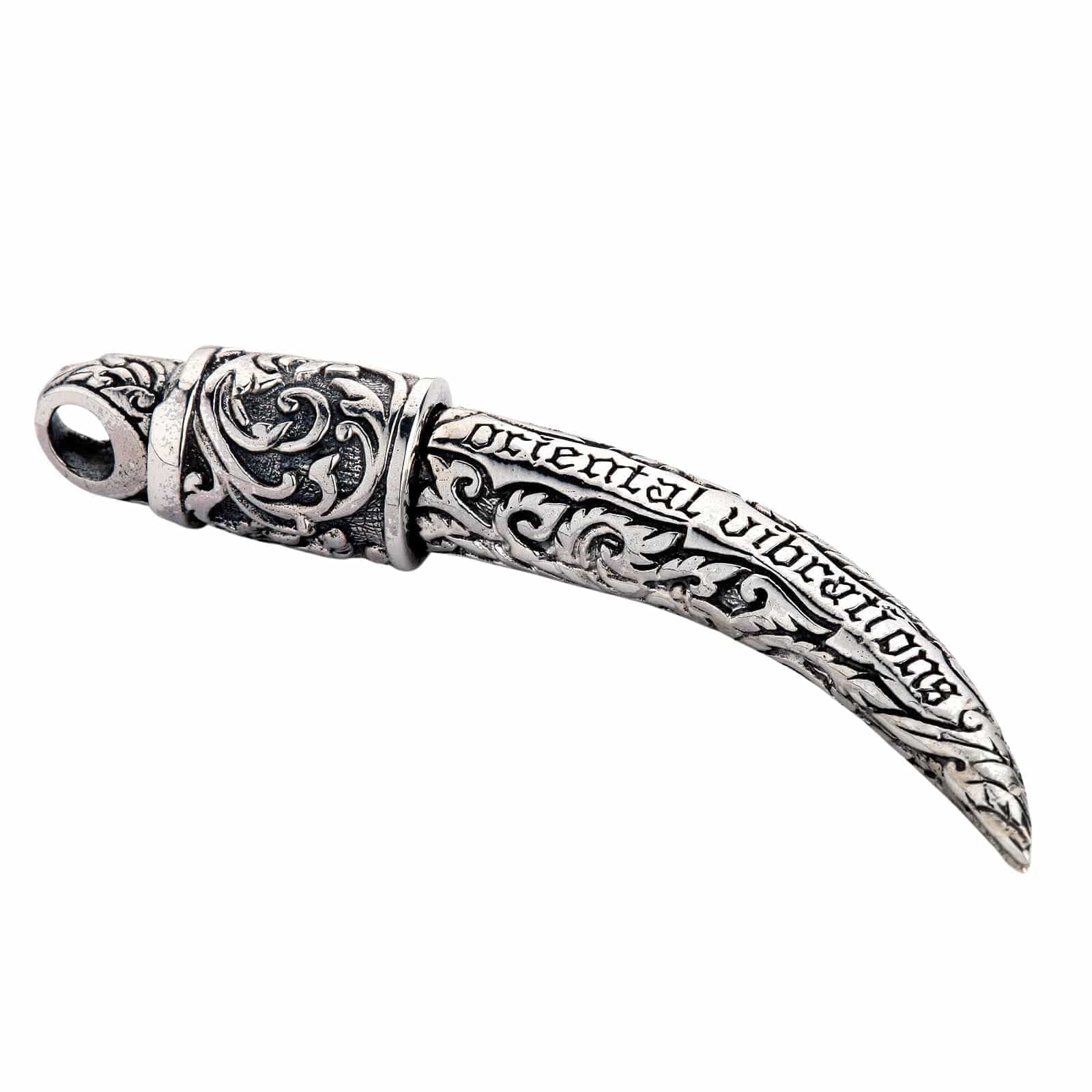 The body of the tusk is covered in beautiful, oriental-inspired engravings and the mantra "oriental vibrations," reinforcing its spiritual energy and unique character. It's a powerful tool for anyone seeking strength, focus, and a clear path forward in their journey. This sterling silver tusk pendant is a work of art, a wearable relic built to be a cherished part of your spiritual and stylistic collection.