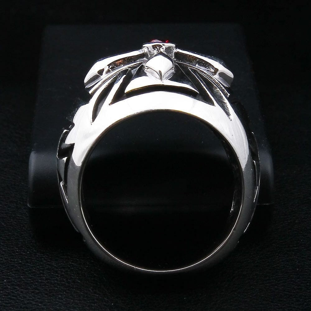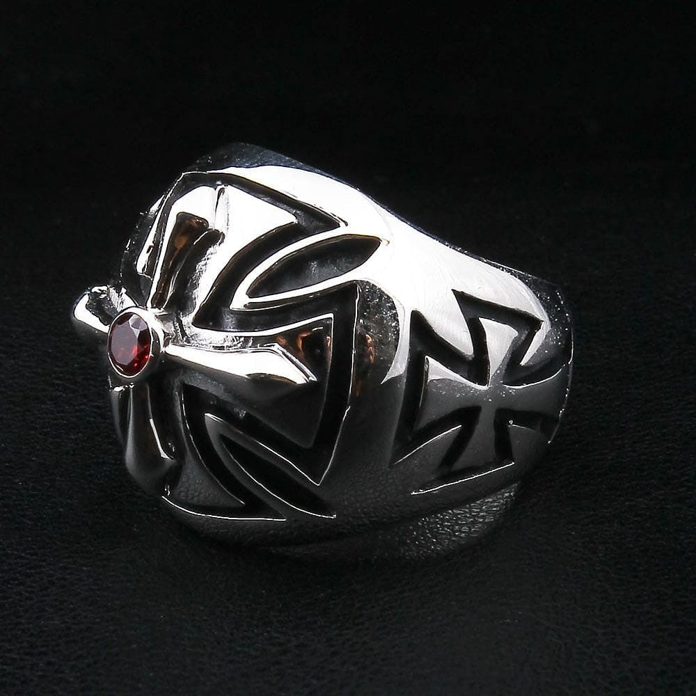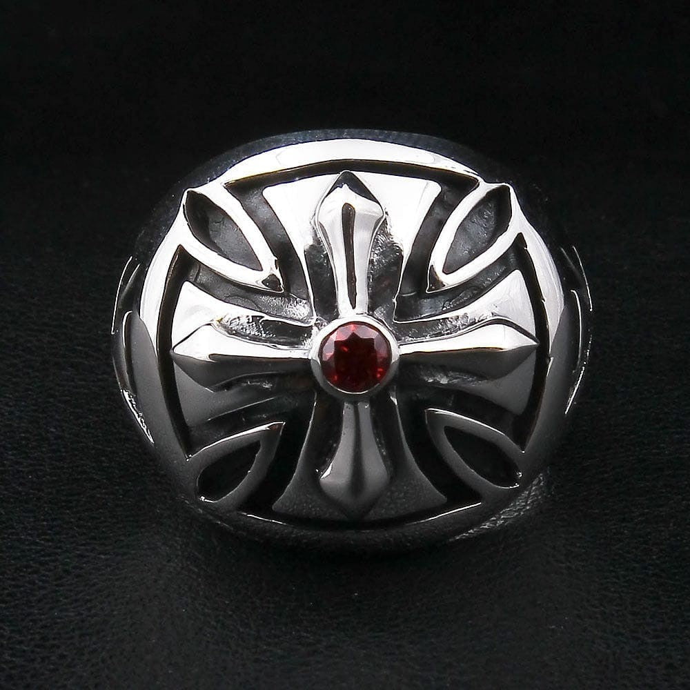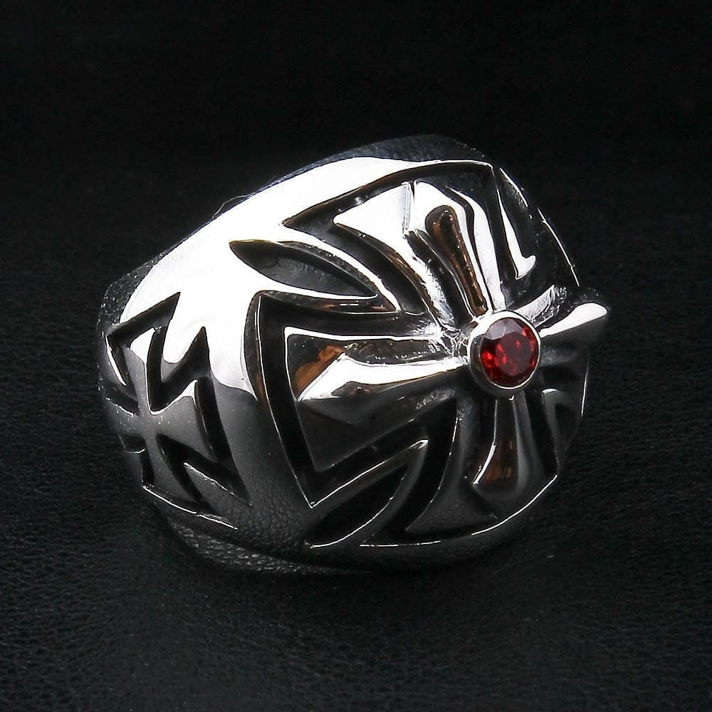 925 Sterling Silver Iron Cross Ring with Red Garnet Stone