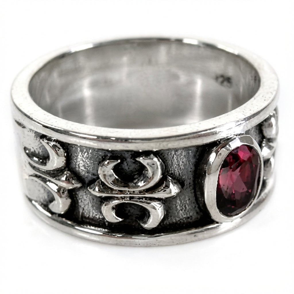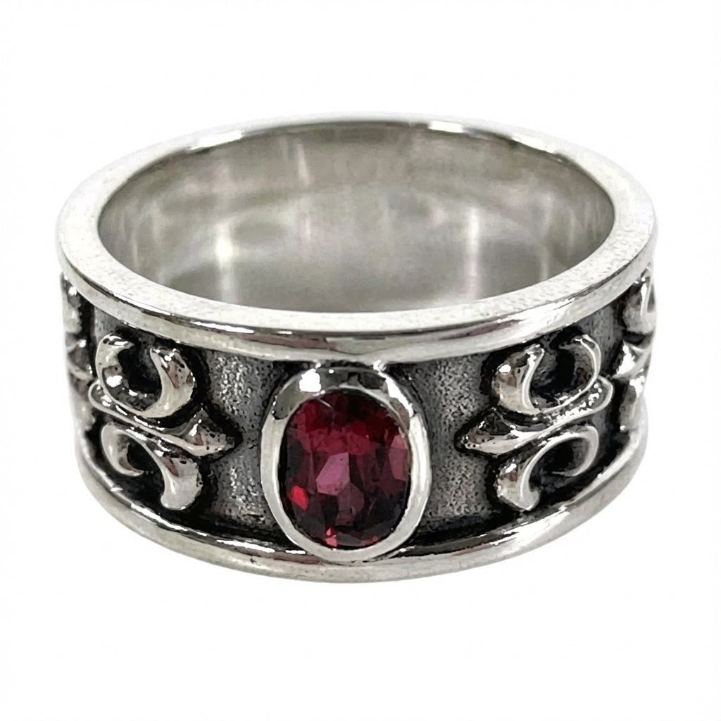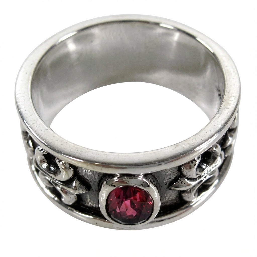 Sterling Silver Ruby Men's Band Ring with Fleur De Lis Design