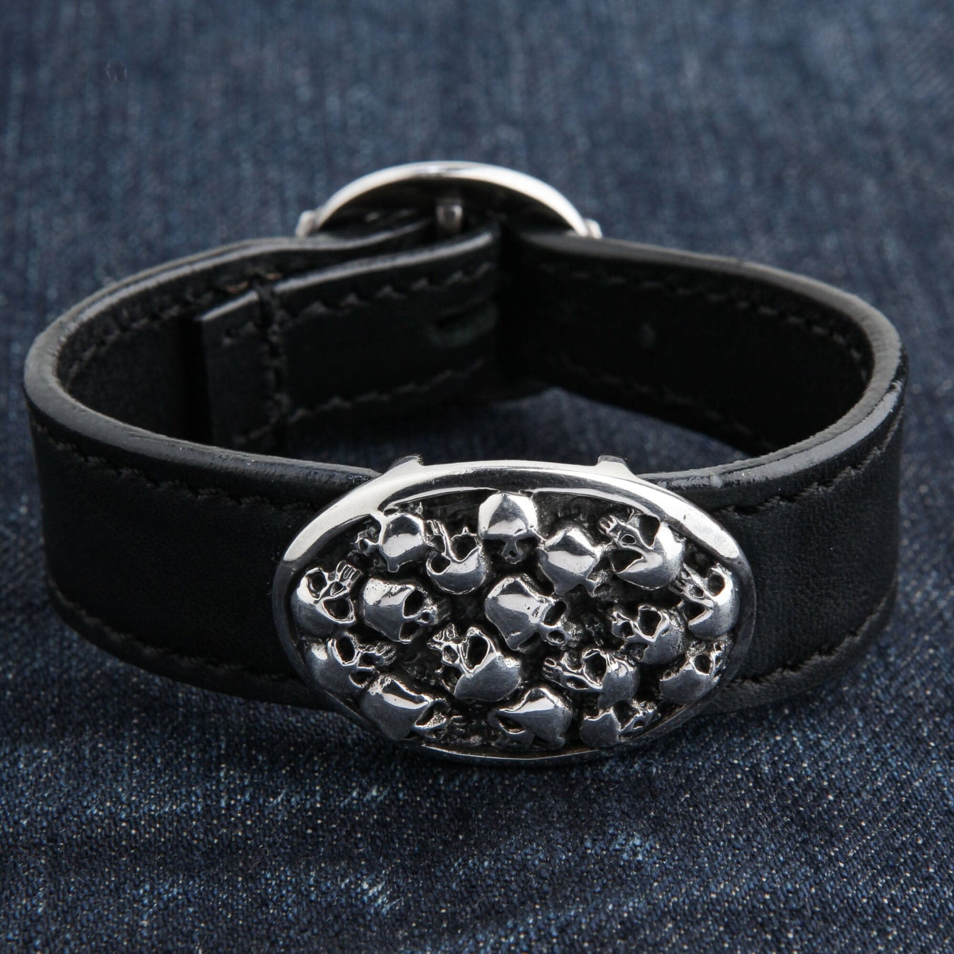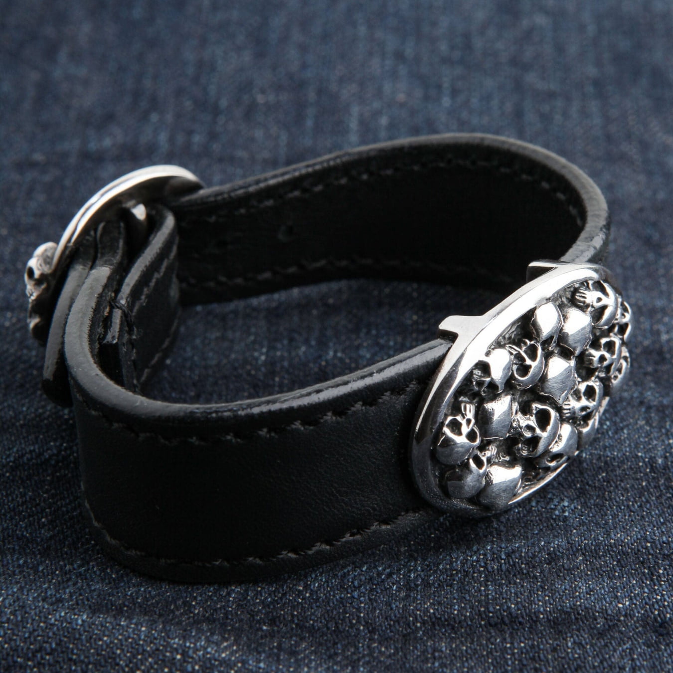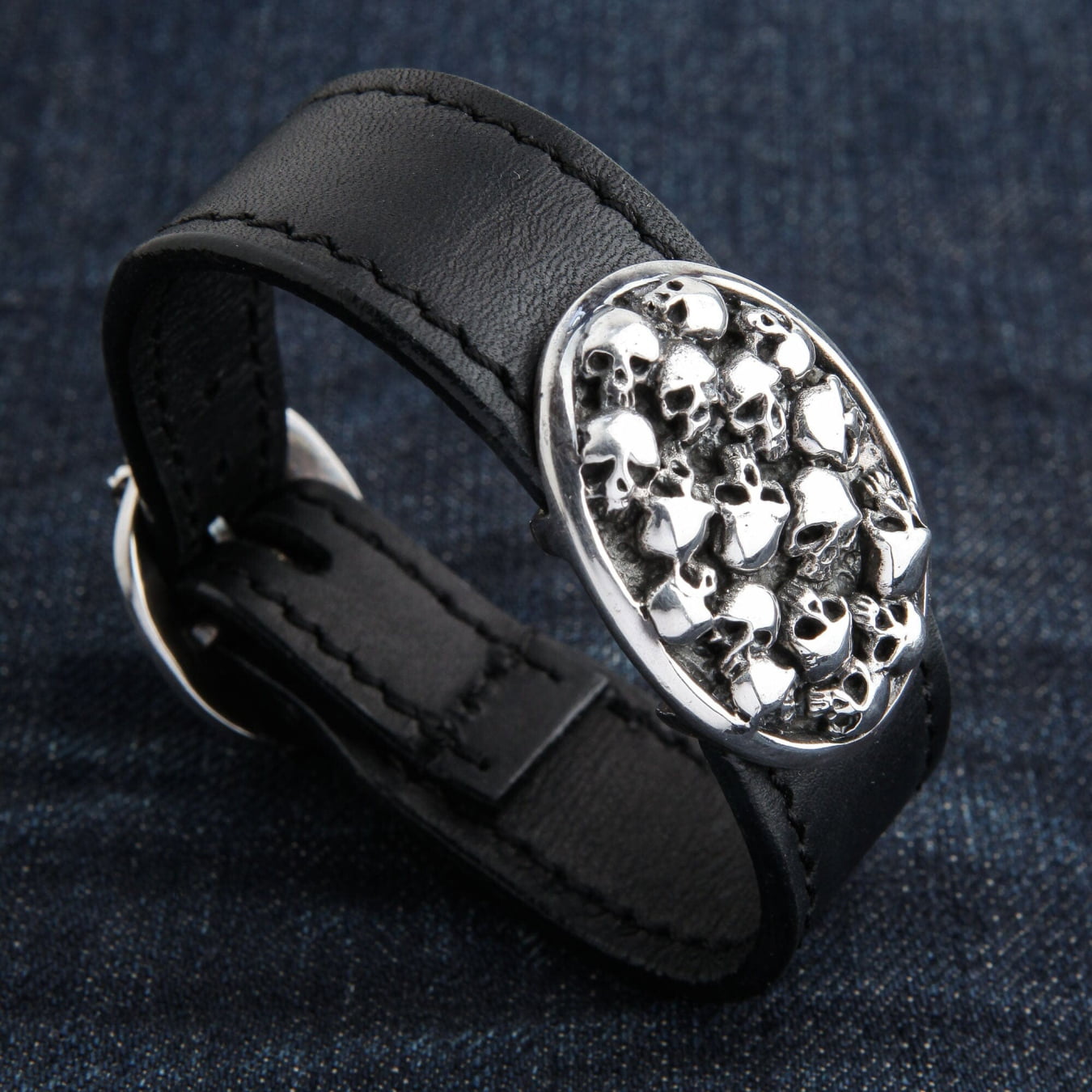 The centerpiece of this biker leather bracelet is a large, oval silver plate, densely packed with a "pile of skulls"—an intricate design often called a "skull stack" that gives the piece a stunning, three-dimensional texture. The craftsmanship doesn't stop there; even the adjustable buckle strap is crafted from solid silver and adorned with its own menacing skulls. This is a true piece of handcrafted leather and silver art, set on a rugged, 1-inch wide black leather band.