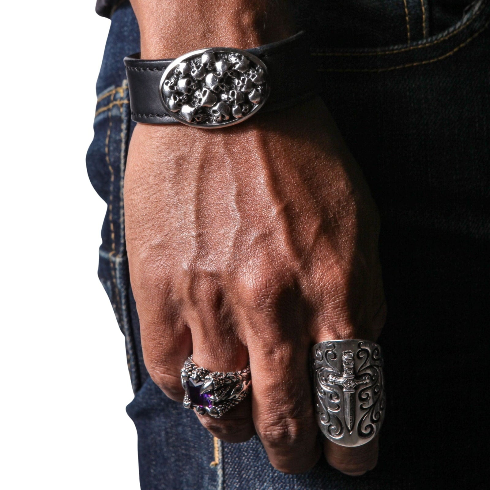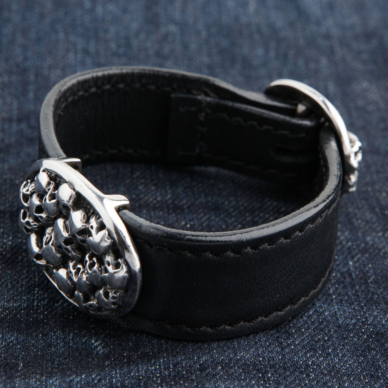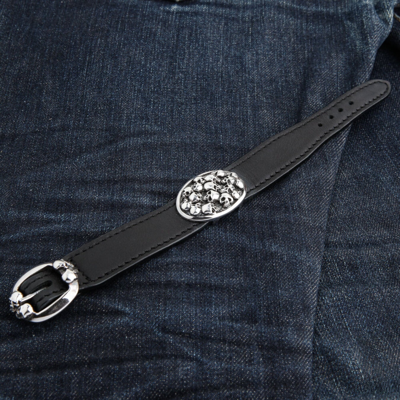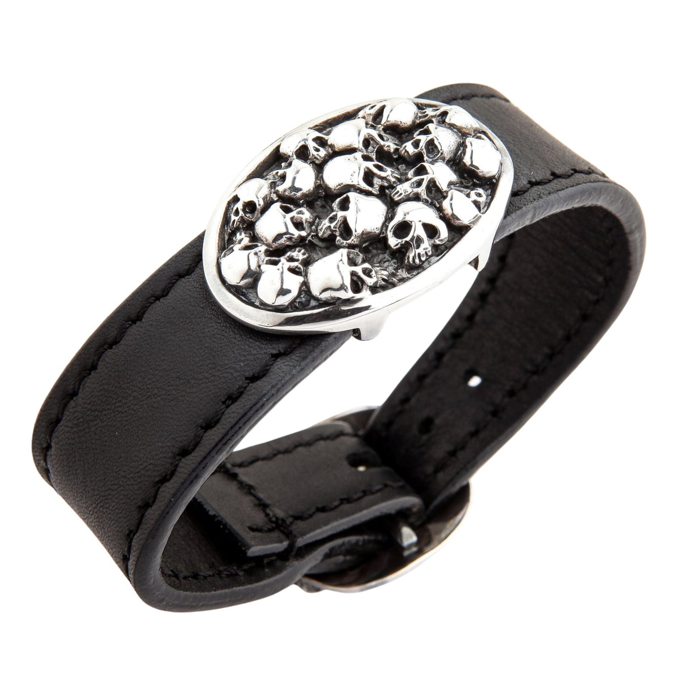 The centerpiece of this biker leather bracelet is a large, oval silver plate, densely packed with a "pile of skulls"—an intricate design often called a "skull stack" that gives the piece a stunning, three-dimensional texture. The craftsmanship doesn't stop there; even the adjustable buckle strap is crafted from solid silver and adorned with its own menacing skulls. This is a true piece of handcrafted leather and silver art, set on a rugged, 1-inch wide black leather band.