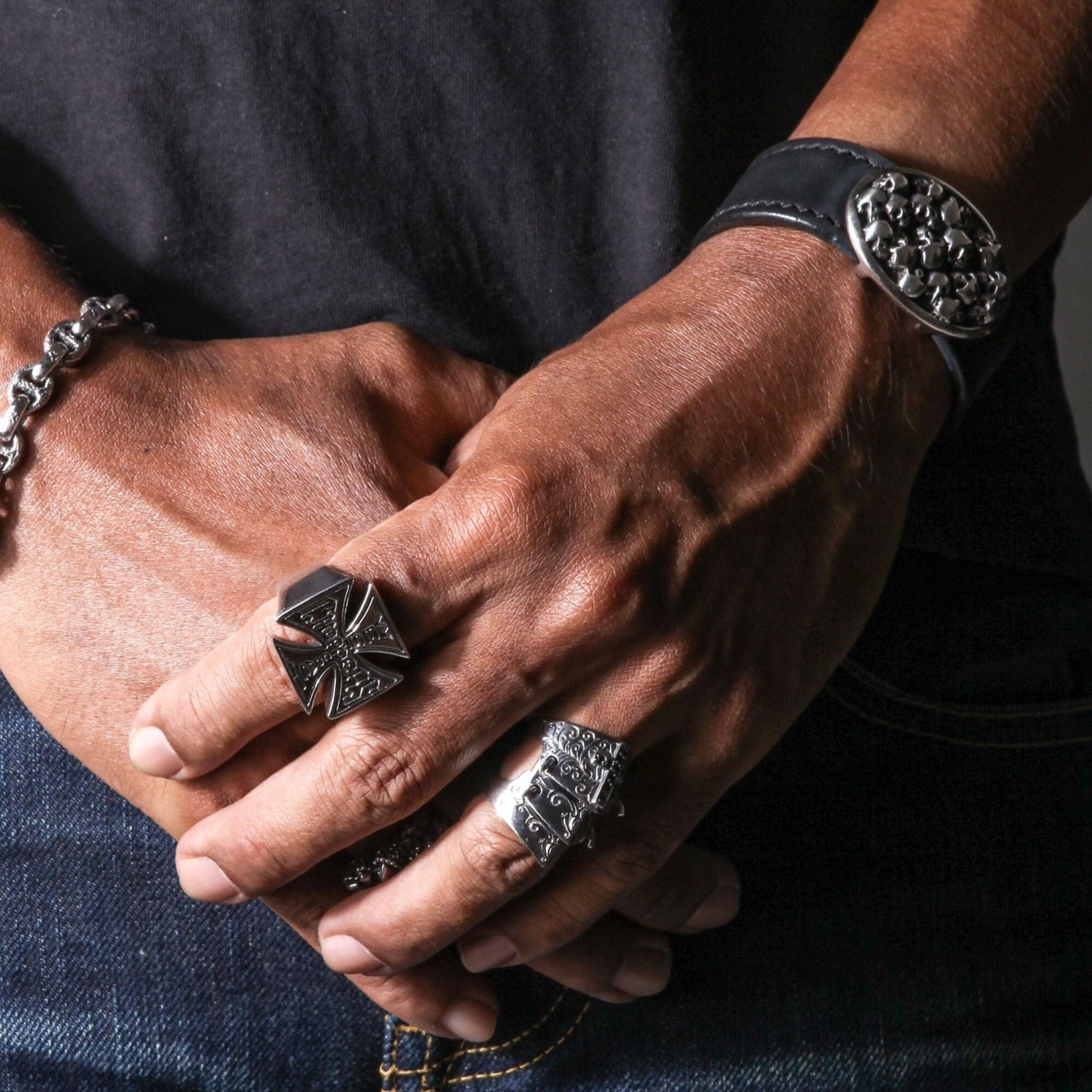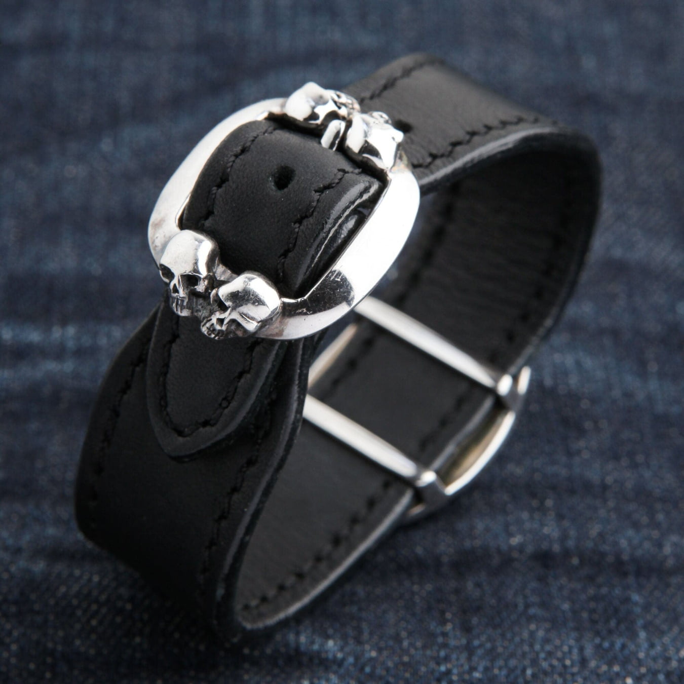 A: This is the essence of Biker Jewelry and men's gothic wristwear. It's a cornerstone piece for our Skull Bracelets and Leather Bracelets collections, perfect for anyone looking to add a bold, rebellious edge to their style.