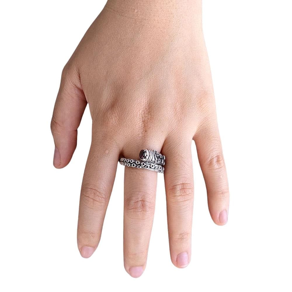 This ring is a tribute to the power and grace of the ocean's most intelligent dweller. The entire band is a single, powerful tentacle, wrapping around your finger in a dynamic embrace. Every single suction cup is rendered with stunning realism and highlighted with a dark, oxidized finish for incredible depth and texture. Capping the end of this formidable limb is a single, faceted red CZ stone, set like a captured jewel or a mysterious, glowing eye. This stunning spark of color adds a sense of danger and passion to the cool silver. The clever open-wrap design not only looks incredible but also allows for a comfortable, adjustable fit, making this 13-gram statement piece as adaptable as the creature that inspired it.