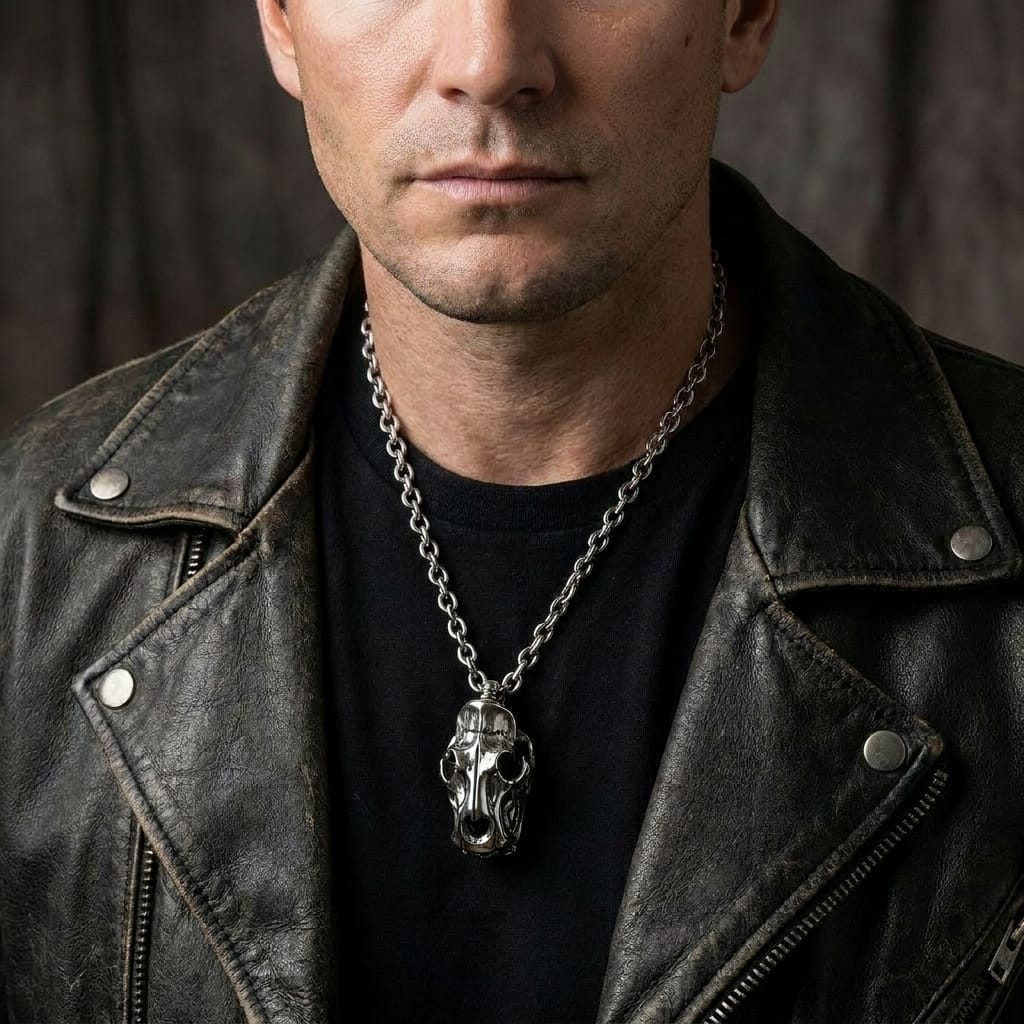If you ride and want bone-aesthetic silver — The oxidized finish creates a realistic aged-bone look across the entire skull. The teeth, eye sockets, and cranial sutures are darkened to mimic a real bone specimen. Combined with the ornate bone-style bail at the top, the pendant reads as an artifact rather than jewelry.