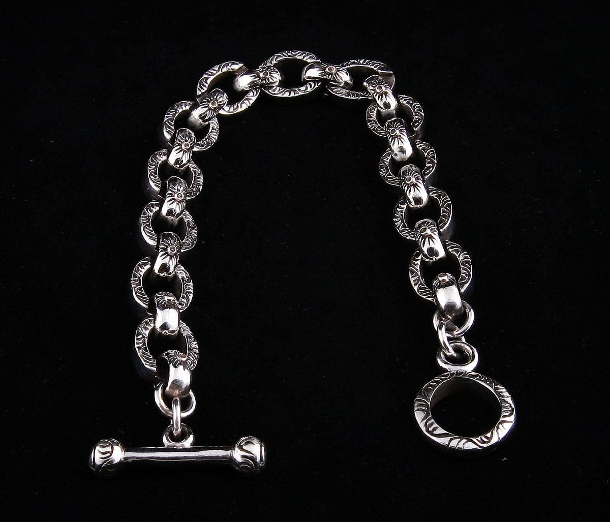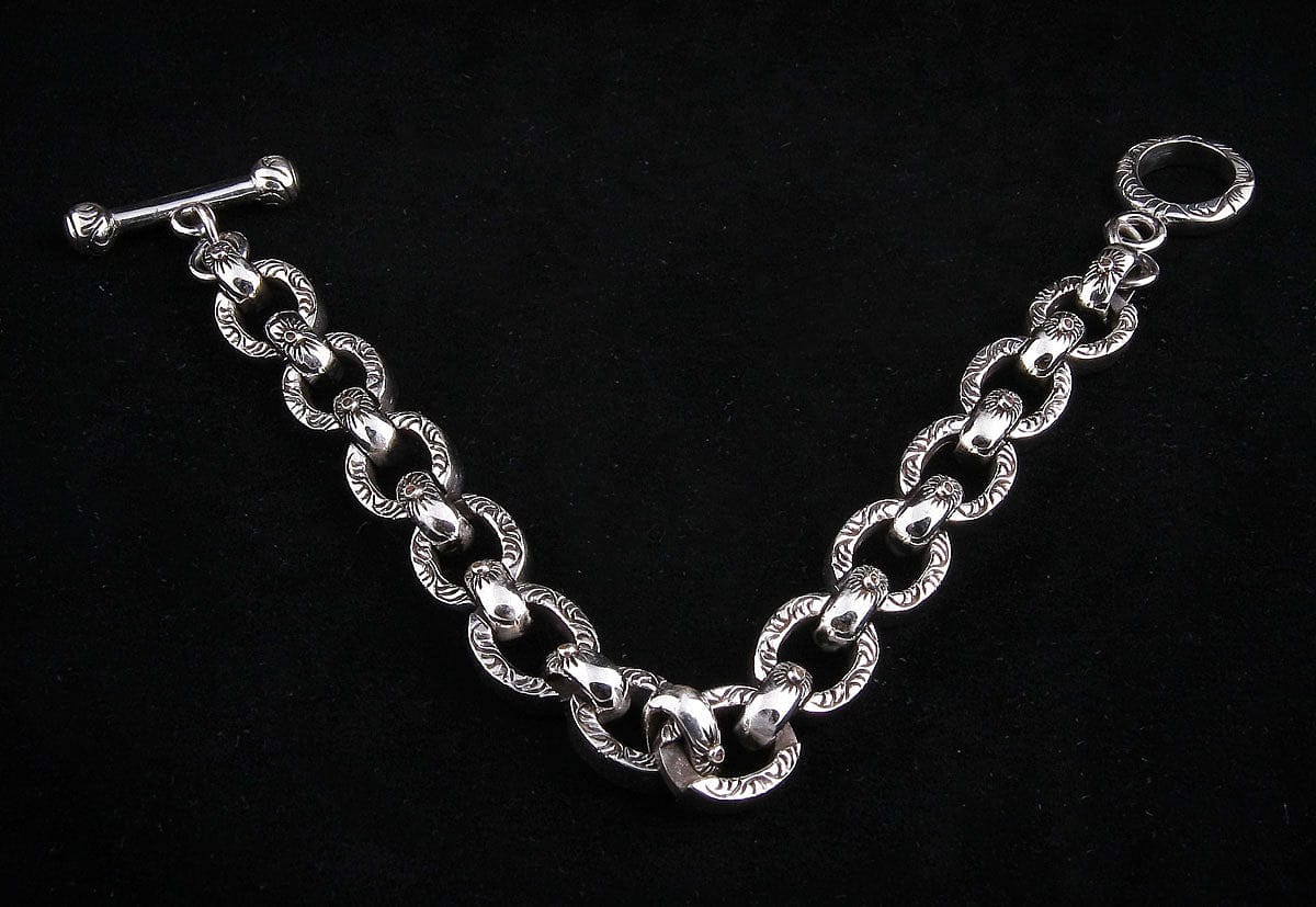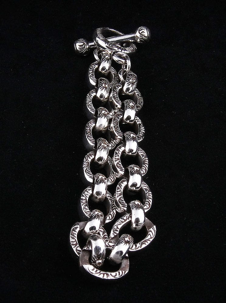 Weighing a solid 48 grams, this men's link bracelet has a satisfying heft that speaks to its superior quality. It is secured with a classic and highly reliable T-bar toggle clasp, which is itself engraved, ensuring the design is complete from end to end. The clasp is both easy to operate and exceptionally secure. Every link is individually cast and polished by our skilled artisans, ensuring this piece of Biker Jewelry is built to withstand the tests of time and the rigors of the road.