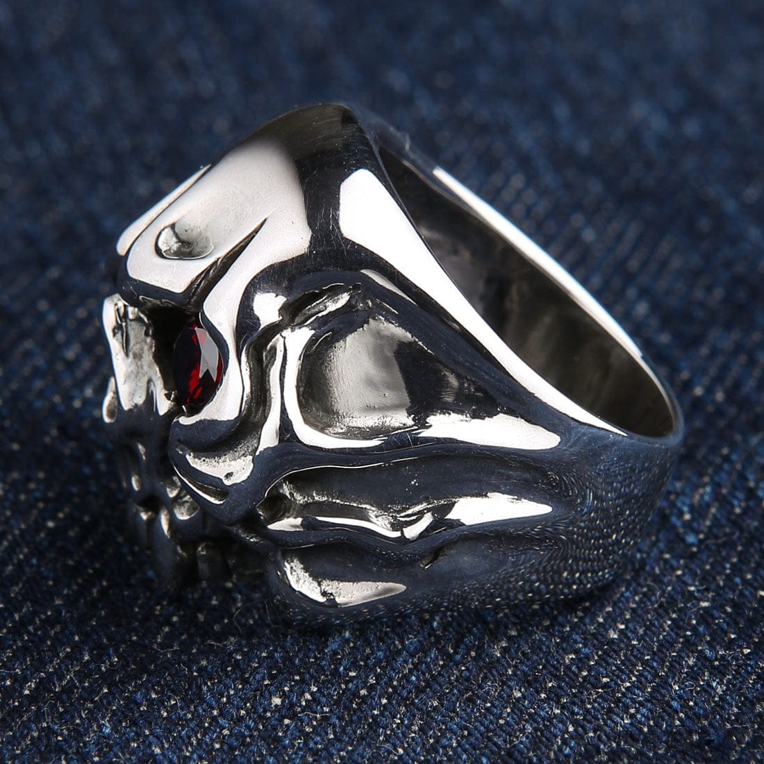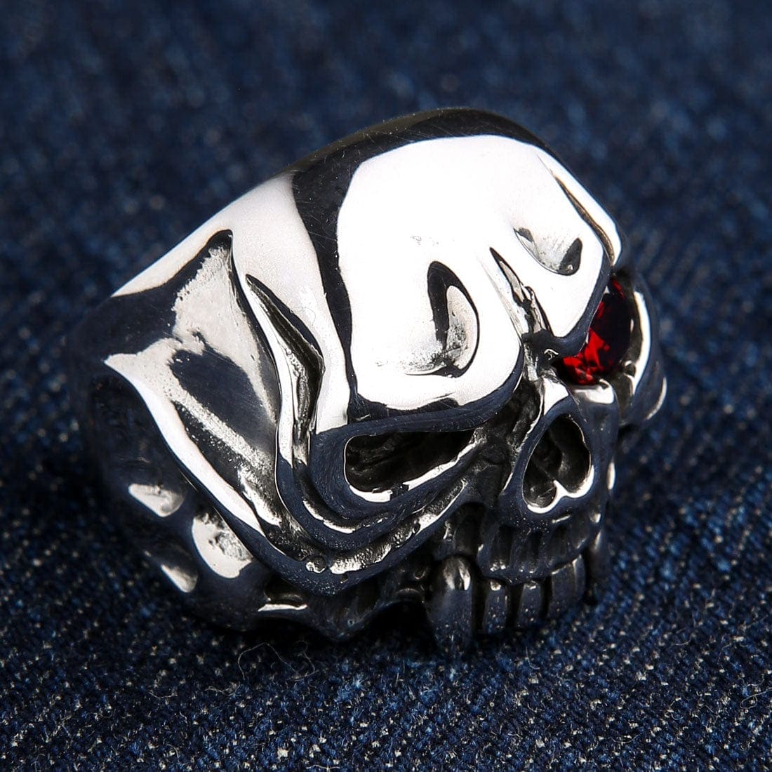 This ring captures the essence of a predator with its unique, fluid design. The skull is rendered in a highly polished, almost liquid-metal style, with a heavy brow and exaggerated features that feel both ancient and futuristic. Two sharp fangs protrude from its mouth, leaving no doubt as to its vampiric nature. The most hypnotic feature is its asymmetrical design—one eye socket is a deep, dark void, while the other burns with the fire of a single, faceted red CZ gemstone. This singular red eye creates an intense, focused gaze, symbolizing the predator's unwavering hunt. With a formidable 23-gram weight, this heavy silver biker ring has a powerful presence that is as substantial as the legends that inspired it.