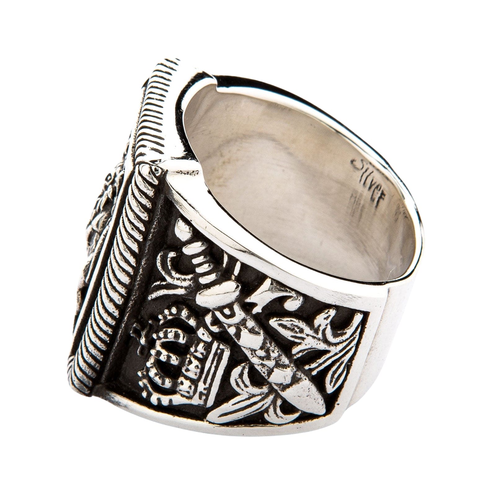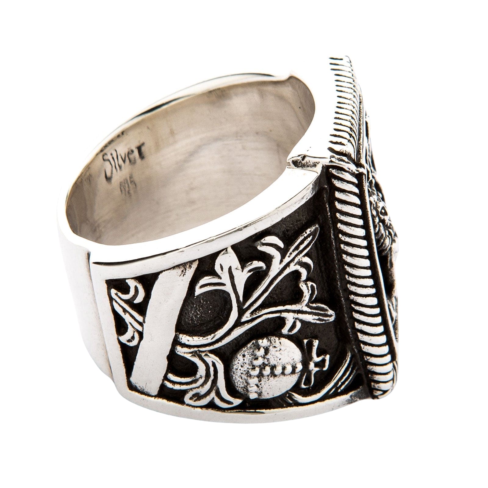 The central crest is framed by a rugged, rope-like border, while the shanks of the ring are adorned with ornate, gothic-style engravings, adding to its authentic, antique artifact feel. This Lion of St. Mark ring is a monument to handcrafted excellence. As a masterpiece of Heraldic Jewelry and a uniquely refined piece of Biker Jewelry, it is an heirloom-quality accessory, built with the strength and prestige of the legend it depicts.