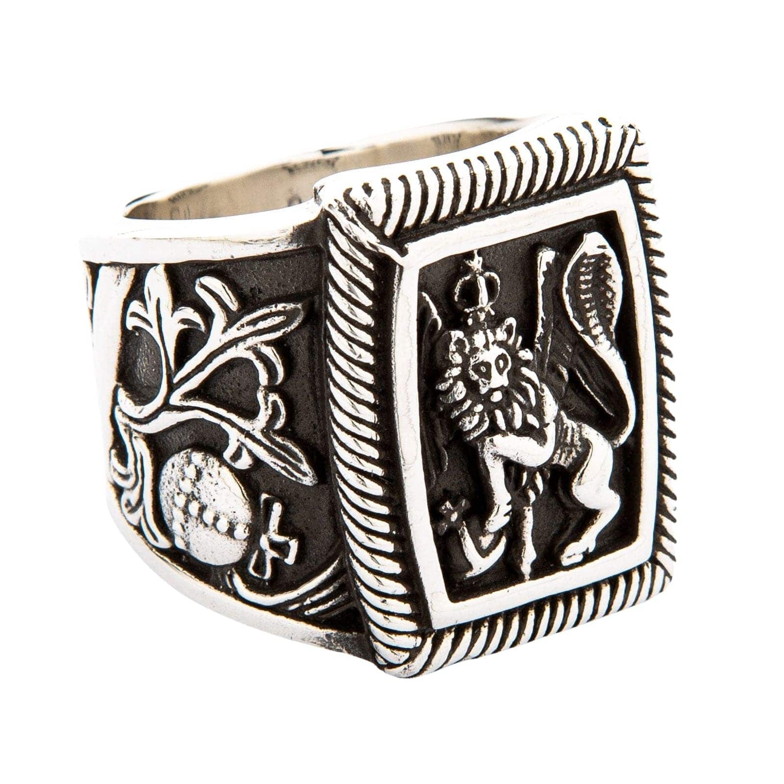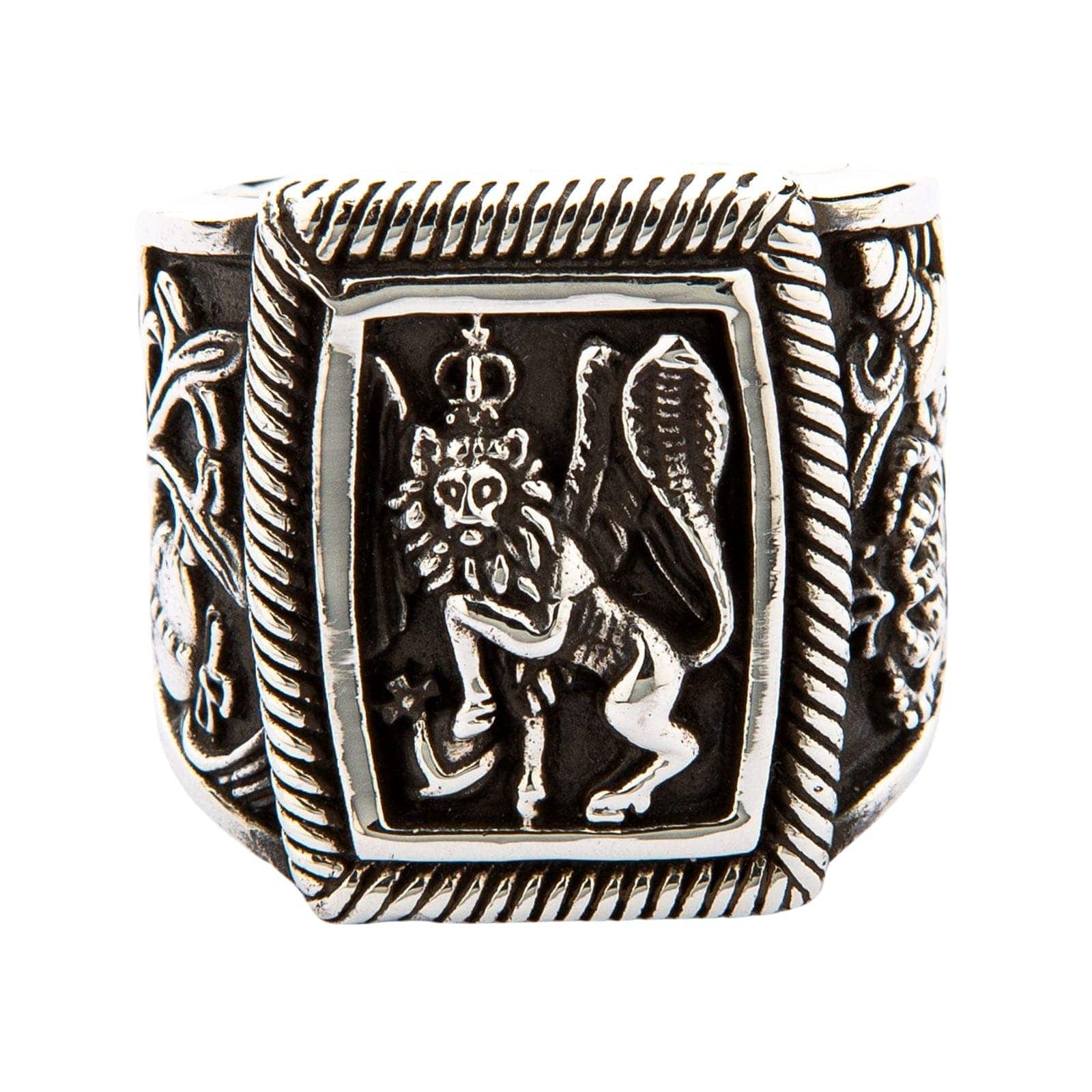 A premium piece of heraldic jewelry: a solid silver signet ring with the winged Lion of St. Mark.